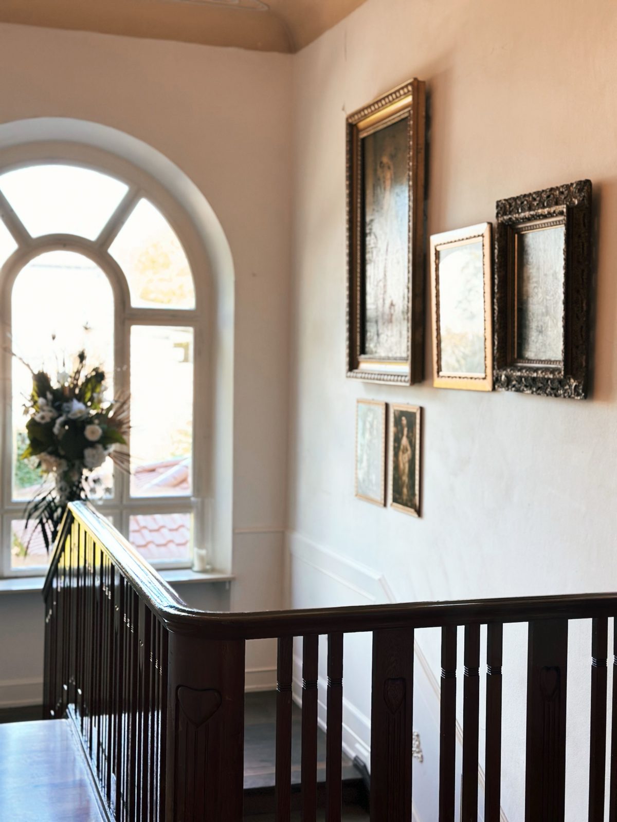Im Obergeschoss erwartet Dich ein edles, antikes Flair. Der Trausaal beeindruckt mit seinem stilvollen Ambiente, während die Nebenräume und der Balkon Platz für Empfänge und angeregte Gespräche bieten. Eine kleine, exklusive Bar rundet das Angebot ab und bietet Raum für den ein oder anderen genussvollen Tropfen.