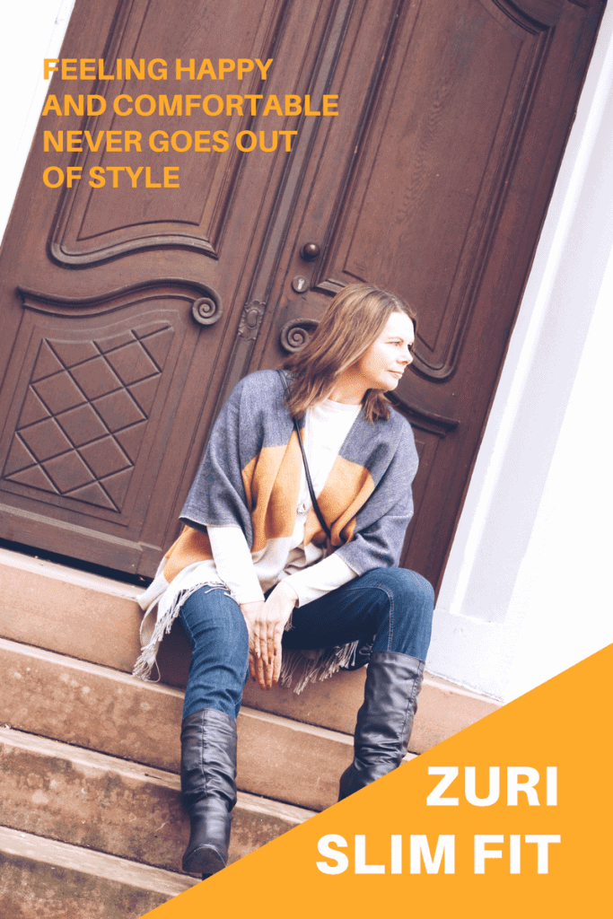 Auf den Fotos trage ich das Modell ZURI SLIM FIT, in dunkelblau. Diese Jeanshose liegt am Po und an den Oberschenkeln an. Ist jedoch an den Hosenbeinen so geschnitten, dass sie nicht auf der Haut aufliegt, sondern nur körpernah sitzt. Das hat zwei Vorteile: Die Hose schlappert nicht ums Bein, ist dennoch bequem und kaschiert “kleinere Makel” wie zum Beispiel Fußballer-Waden.
