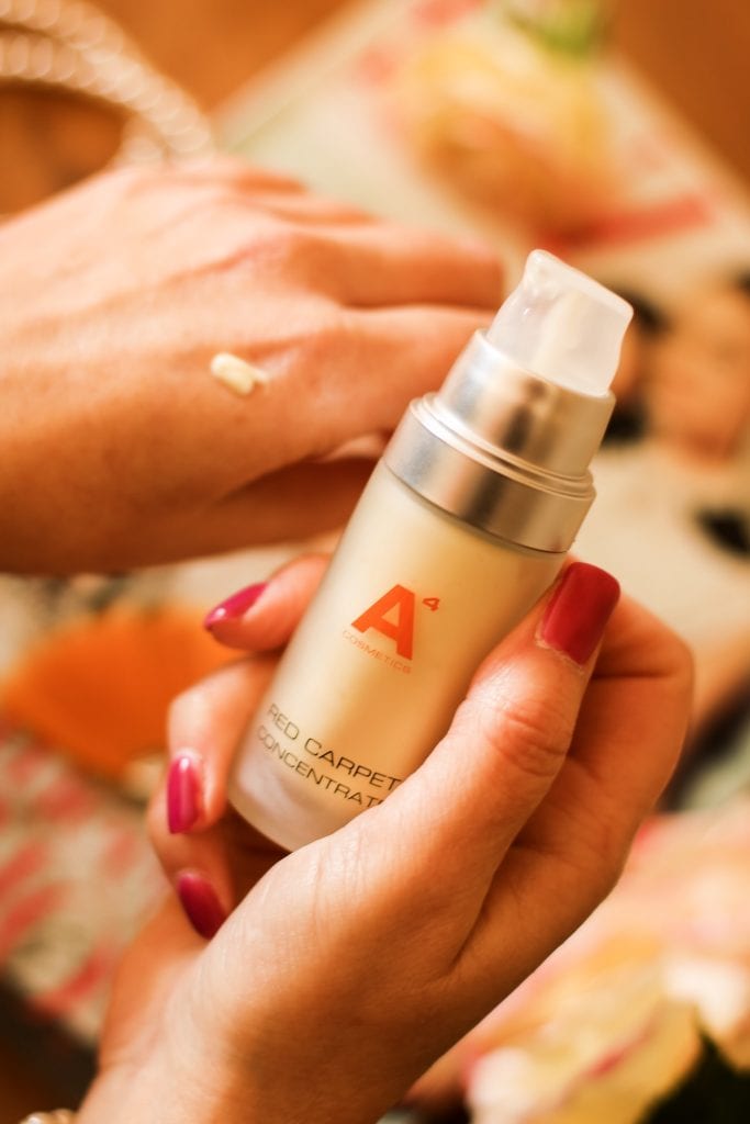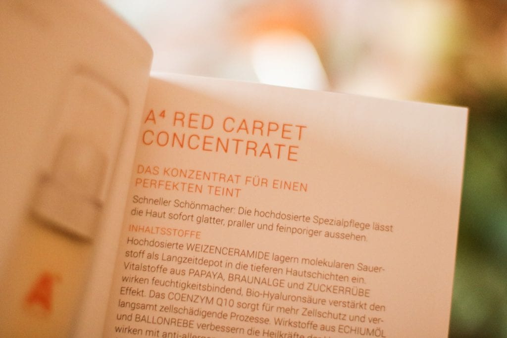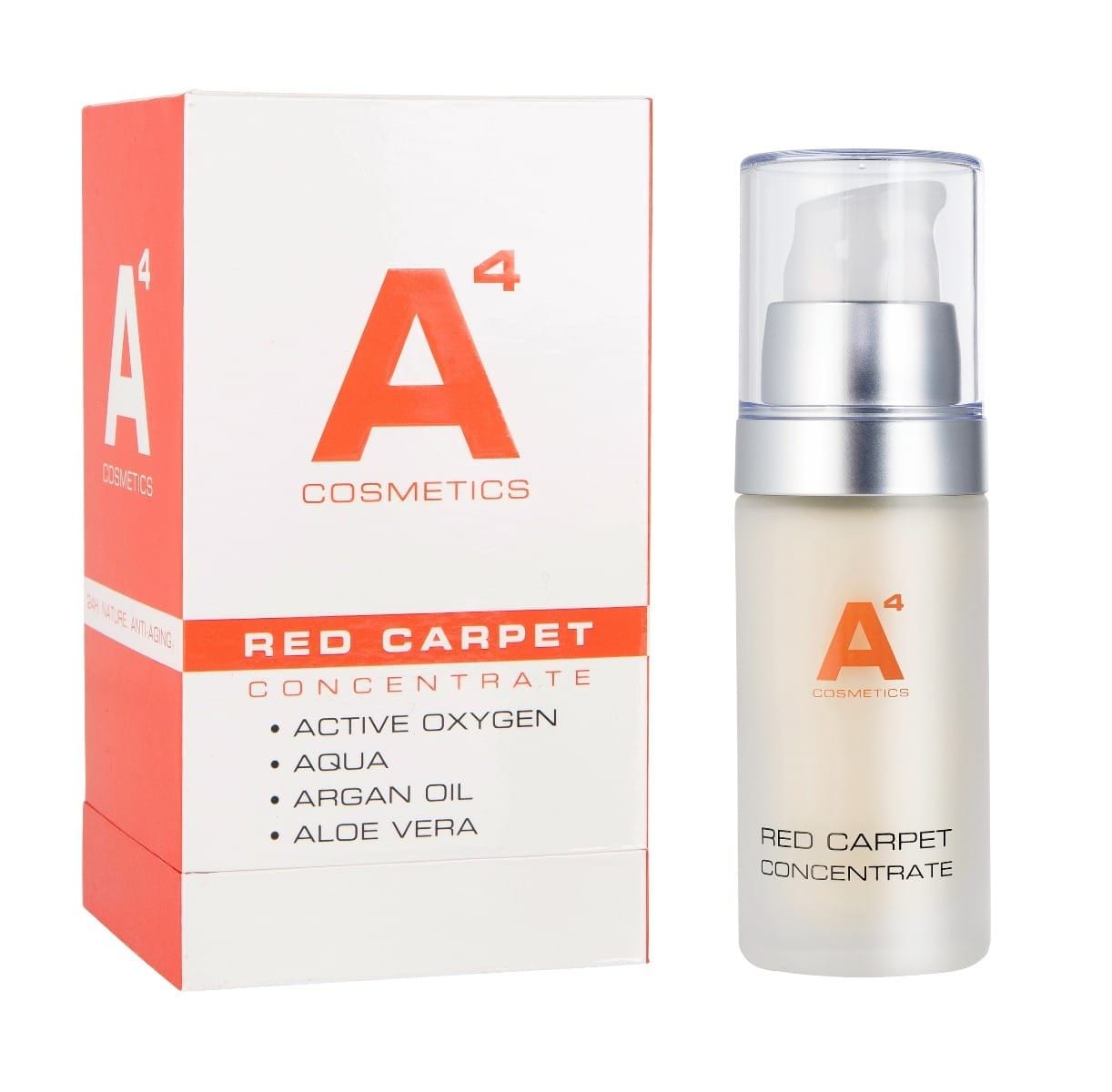 Das Red Carpet Concentrate der Firma A4 ist ein sofort wirksames Serum mit den Hauptbestandteilen Arganöl, Hyaluronsäure und Aloe Vera. Es kann auch zur Langzeit Anti Aging Pflege eingesetzt werden und ist auch für empfindliche Haut, sehr gut verträglich.