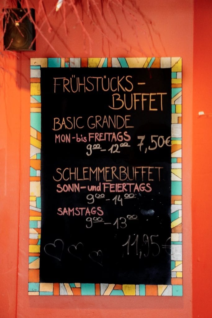 Von Montags bis Freitags kannst Du von 9:00 Uhr bis 12:00 Uhr Dein Frühstück genießen. Dabei kannst Du Dich für gerade einmal 7,50 Euro am Frühstücksbuffet bedienen. Am Wochenende steht Dir dann (Samstags von 9:00 bis 13:00 Uhr, Sonn- und feiertags sogar bis 14:00 Uhr) das große Schlemmerbuffet für 11,95 Euro zur Auswahl bereit.