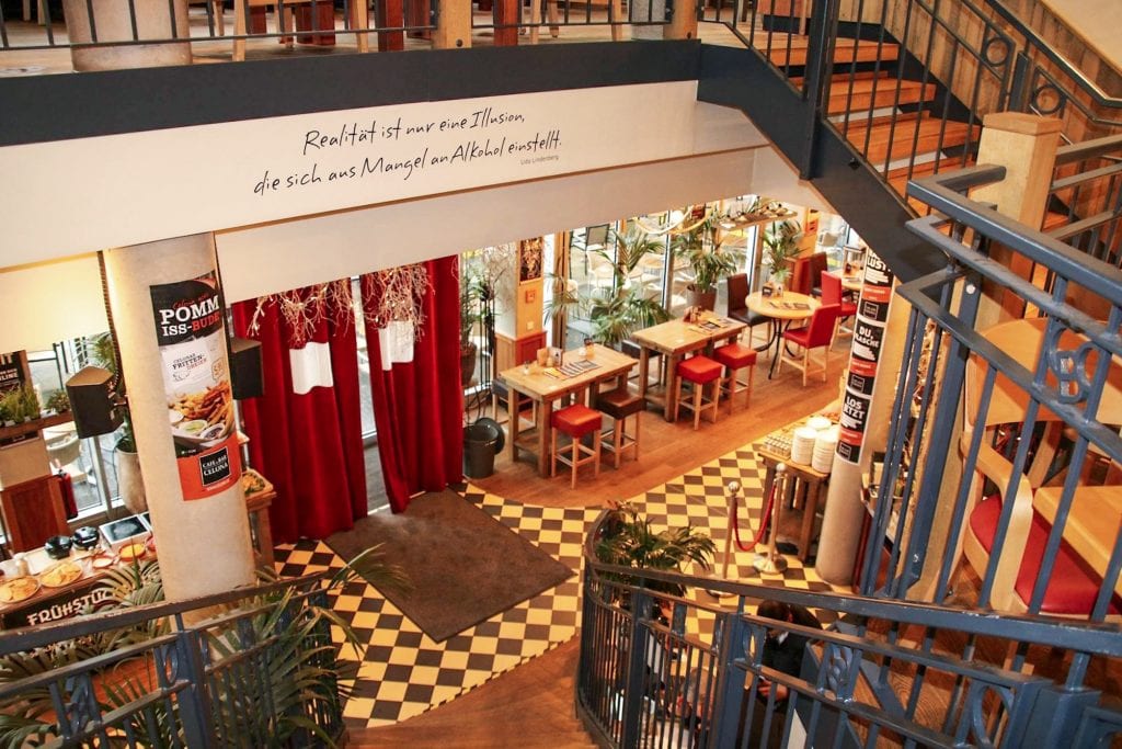 Im Erdgeschoss findest Du neben zahlreichen Sitzgelegenheiten und den Toiletten das Wichtigste: Das Buffet und die Bar! Über eine Treppe gelangst Du auf eine Empore. Dort finden Gruppen oder auch größere Familien auf Loungemöbeln genügend Platz.