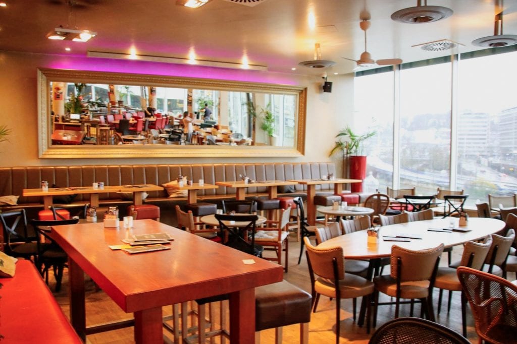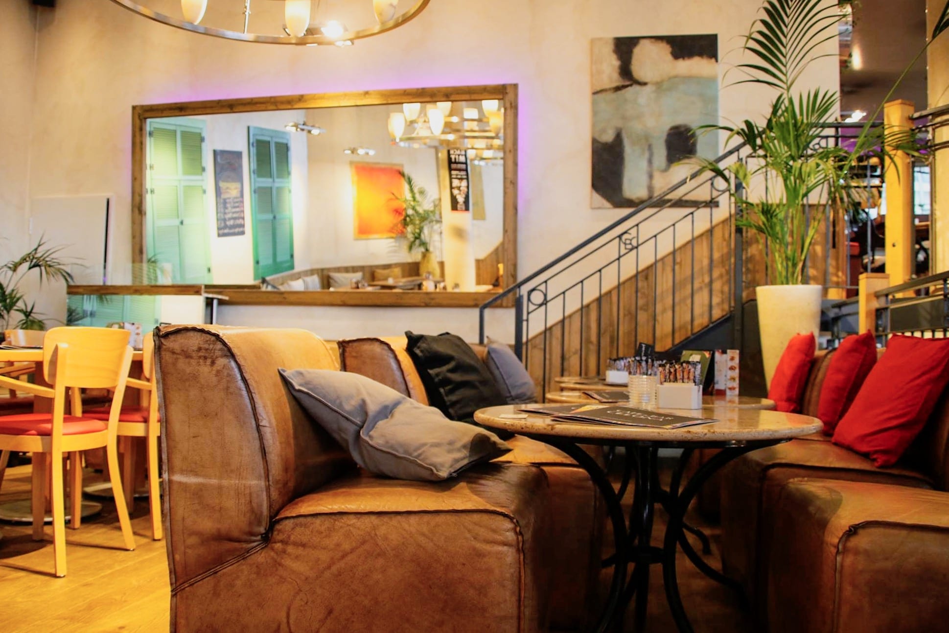 Noch eine Treppe weiter gelangst Du ins offen gestaltete Obergeschoss. Bist Du früh genug dran, sicher Dir einen Platz am Fenster. Du wirst dann mit einem freien Blick über die Saar belohnt. Praktischerweise befinden sich auch dort zusätzliche Toiletten. Durch die großen Glaselemente, die hohen Decken und mediterraner Farbgestaltung kannst Du Dir dort einen Moment Urlaub gönnen.