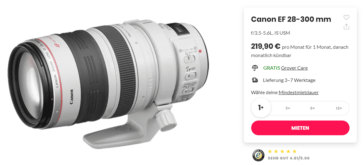 Neu kostet das Objektiv mindestens 2200,- Euro. Einen Monat Miete kostet 219,90 Euro. Mietest Du gleich über zwölf Monate, kostet Dich das Objektiv pro Monat nur noch 119,90 Euro. Da das Teleobjektiv einen Bereich von 28 bis 300 Millimeter abdeckt, ist es praktisch für alle Einsätze geeignet.