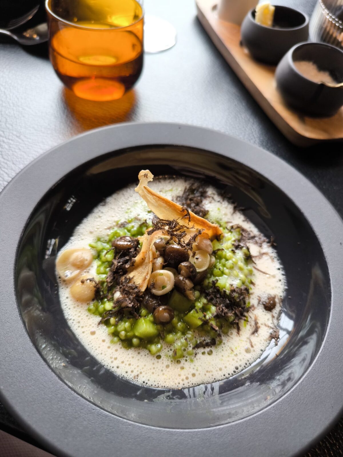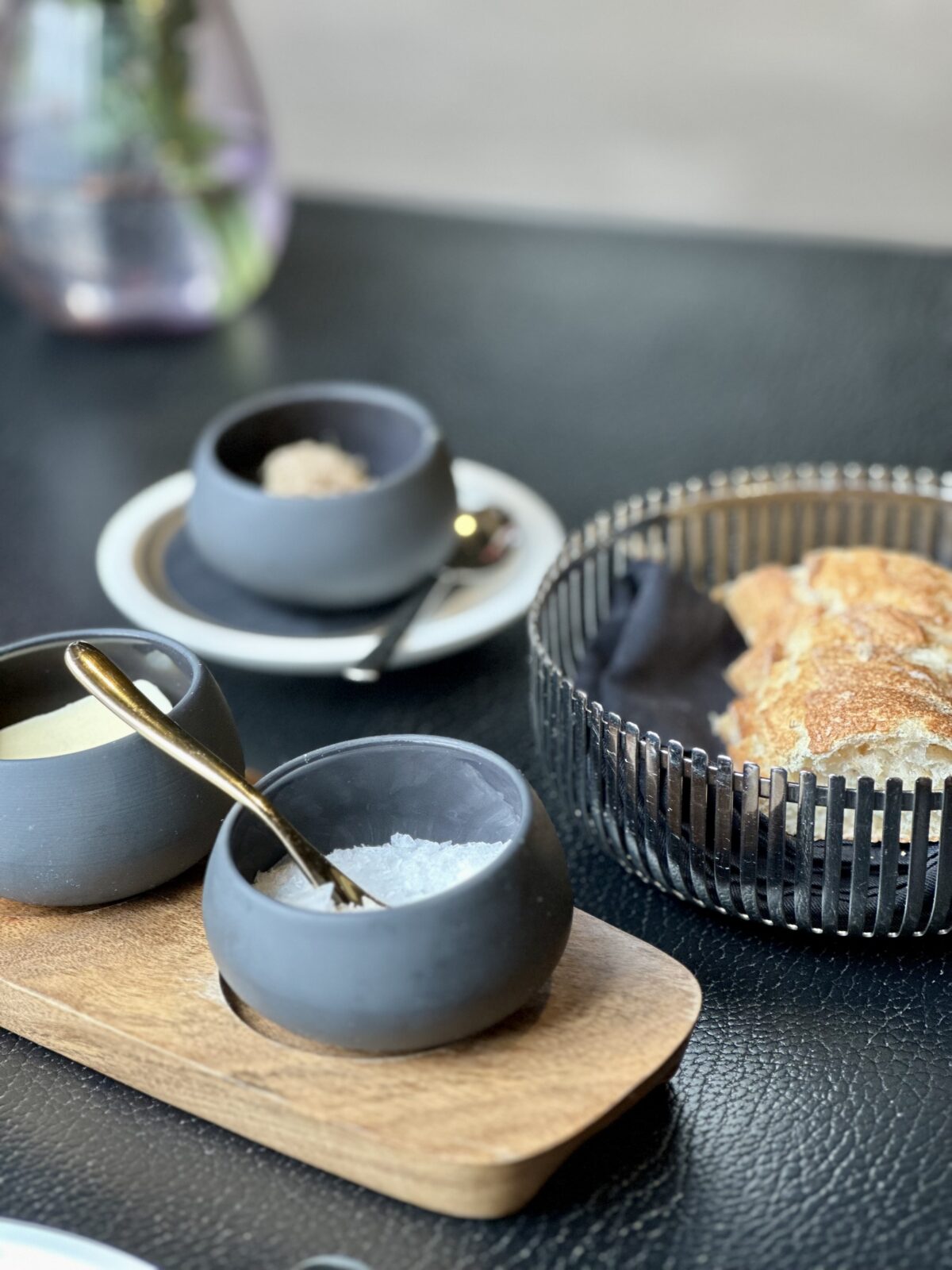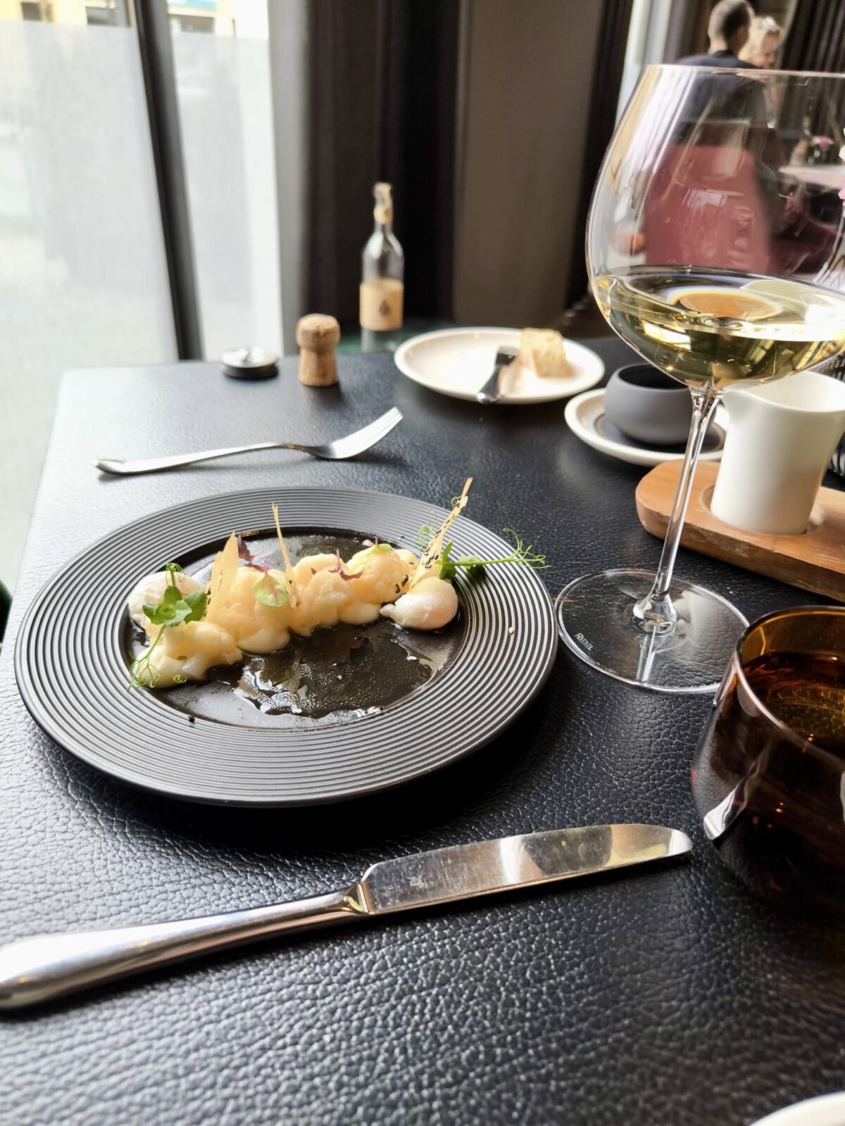 Michael und ich waren zur Mittagszeit dort. Und obwohl es „nur“ ein Lunch war, hatte dieser Besuch für mich das Format eines richtigen Abends. Wir haben beide Menüs bestellt – bei uns fast schon Standard. Nicht aus Unentschlossenheit, sondern weil wir es lieben, möglichst viel zu probieren. Michael bestellt keinen Fisch, ich schon. Das ist für uns meistens die beste Kombination, weil am Ende beide Tellerseiten spannend sind.
