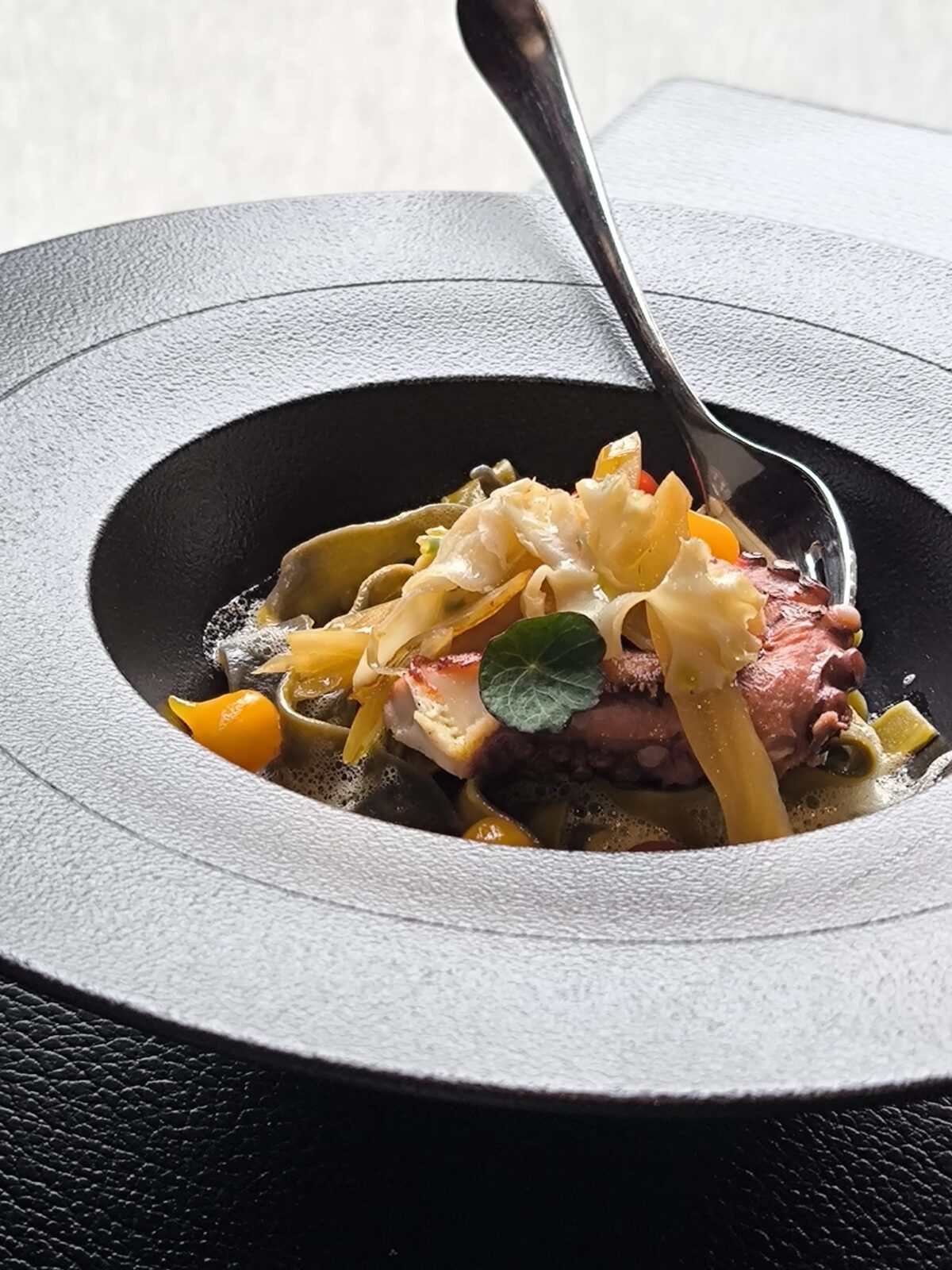 Dann kam die hausgemachte Pasta und wir durften David sogar kurz dabei zusehen, wie er unsere Teller selbst anrichtet. Ein kleiner Moment, der viel über die Handschrift dieses Mittags erzählt. Bei mir mit Pulpo, getrockneter Tomate und Paprikanage, bei Michael mit Safranfenchel. Zwei unterschiedliche Richtungen, zwei ganz eigene Charaktere und trotzdem beides so stimmig, dass man am liebsten einen Nachschlag geordert hätte. Begleitet wurde der Gang von einem Bourgogne Côtes du Couchois Pinot Noir – saftig, fein strukturiert und mit genau der richtigen Tiefe, um die Pasta zu tragen, ohne sie zu überdecken.
