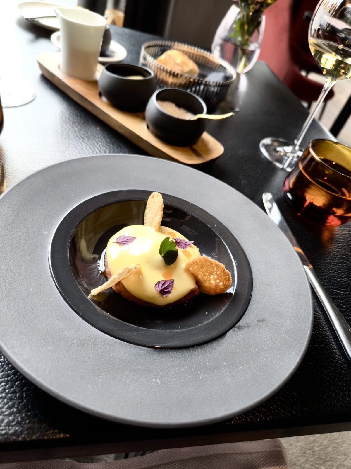 Danach kam ein Risotto aus Perlgraupen mit Petersilienwurzel und Trüffelnage – für mich der stille Höhepunkt des Mittags, identisch in beiden Menüs und völlig zu Recht. Im Glas dazu: der Santenay Les Hâtes 2022 von Vincent Morey & Sophie. Ein Wein mit mehr Ruhe, mehr Tiefe – genau passend zu einem Gang, der nicht viel Aufhebens braucht, um Eindruck zu hinterlassen.