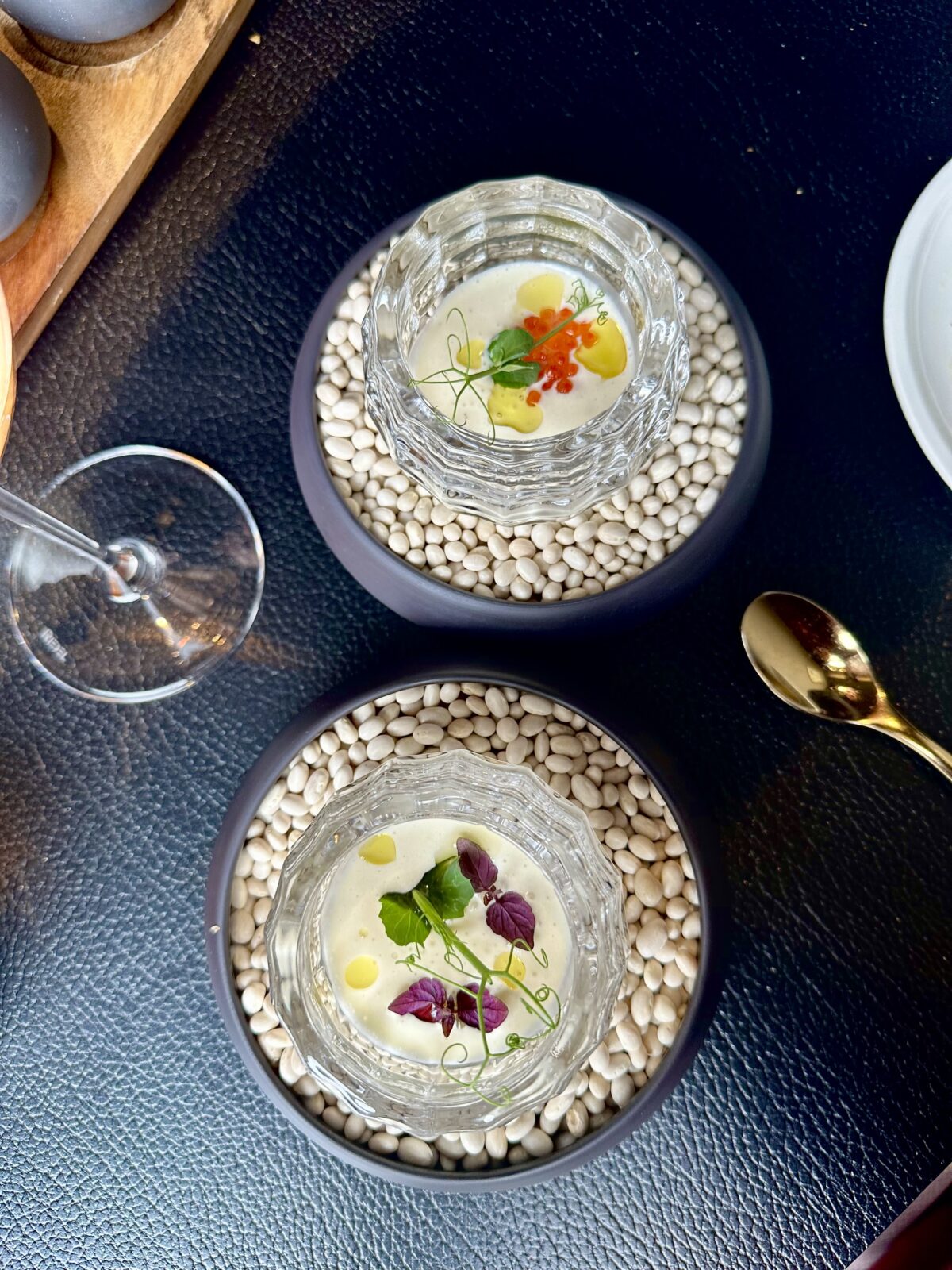 Schon der erste Gruß aus der Küche verspricht viel: eine kalte Kartoffel-Lauchsuppe – einmal mit, einmal ohne Forellenkaviar. Präzise und fein. Dazu gutes Brot und bestes Olivenöl. Manchmal reichen genau solche Kleinigkeiten, um sofort anzukommen.