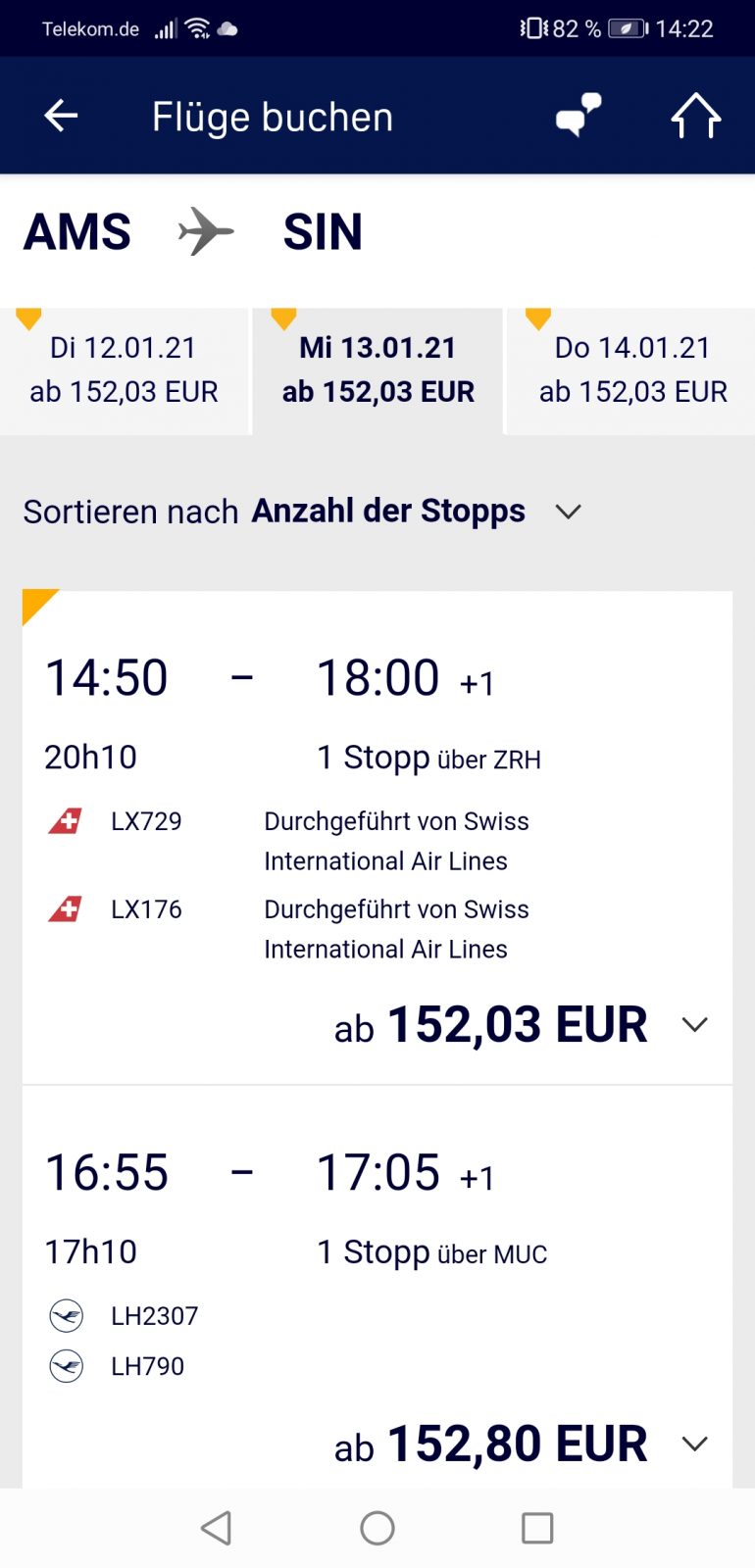 Auf Grund der momentanen Situation gibt es aktuell für die nächsten zwölf Monate tausende Tickets zu unterschiedlichen Terminen und Uhrzeiten. Mit etwas Glück gibt es diese Flüge auch ab Amsterdam und Strasbourg. In Summe beider Flüge kommst Du bei etwa 400,- Euro raus. Natürlich gehören Lounge-Zugang, mehr Gepäck, etc. standardmäßig mit dazu. Probiere es einfach aus, was für Dich am besten passt.