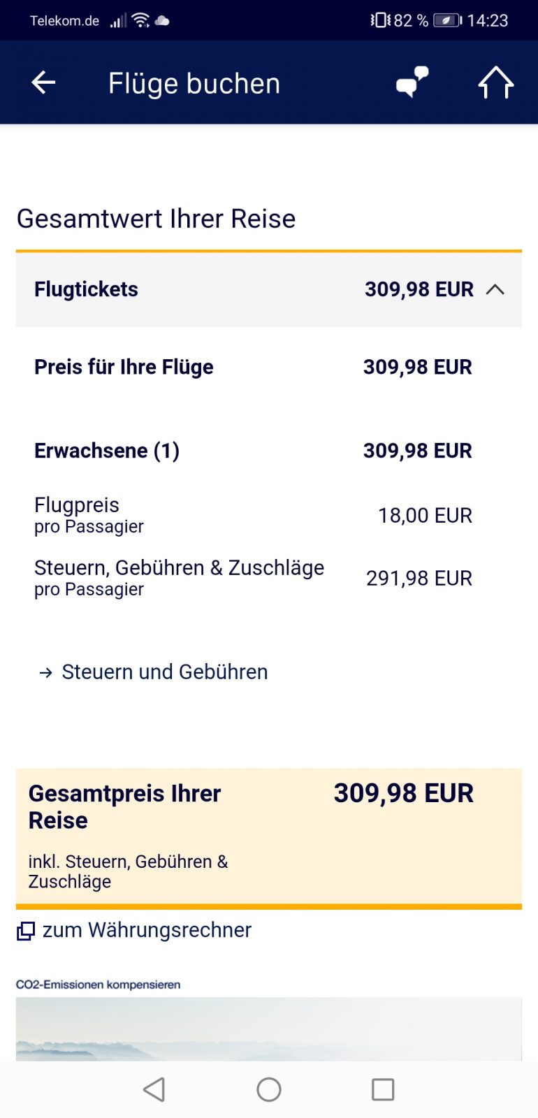 Inzwischen gibt es die Angebote auch über die bekannten Flugsuchmaschinen ab etwa 270 Euro. Beachte hier aber, dass während des Buchungsprozess oft Zusatzkosten entstehen. Ich empfehle hier eindeutig die direkte Buchung. Auch im Falle von Problemen hat man so zumindest einen direkteren Draht. Im Übrigen funktioniert die aktuelle kostenlose Umbuchung aus eigener Erfahrung problemlos.