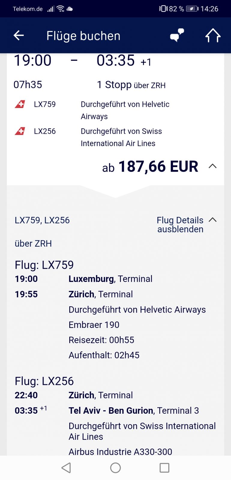Du fliegst dabei zunächst im “Standard”-A320 von LUX nach ZRH. Ab Zürich geht es allerdings ab und zu in einem Airbus A330 weiter nach Tel Aviv. SWISS führt den späten Flug tatsächlich in einem Langstreckenflugzeug durch. Falls Dir die Flugzeugbezeichnungen wenig sagen, hier eine kleine Auflistung typischer Kurz- und Mittelstreckenflugzeuge unabhängig der Airline mit nur einem Gang: