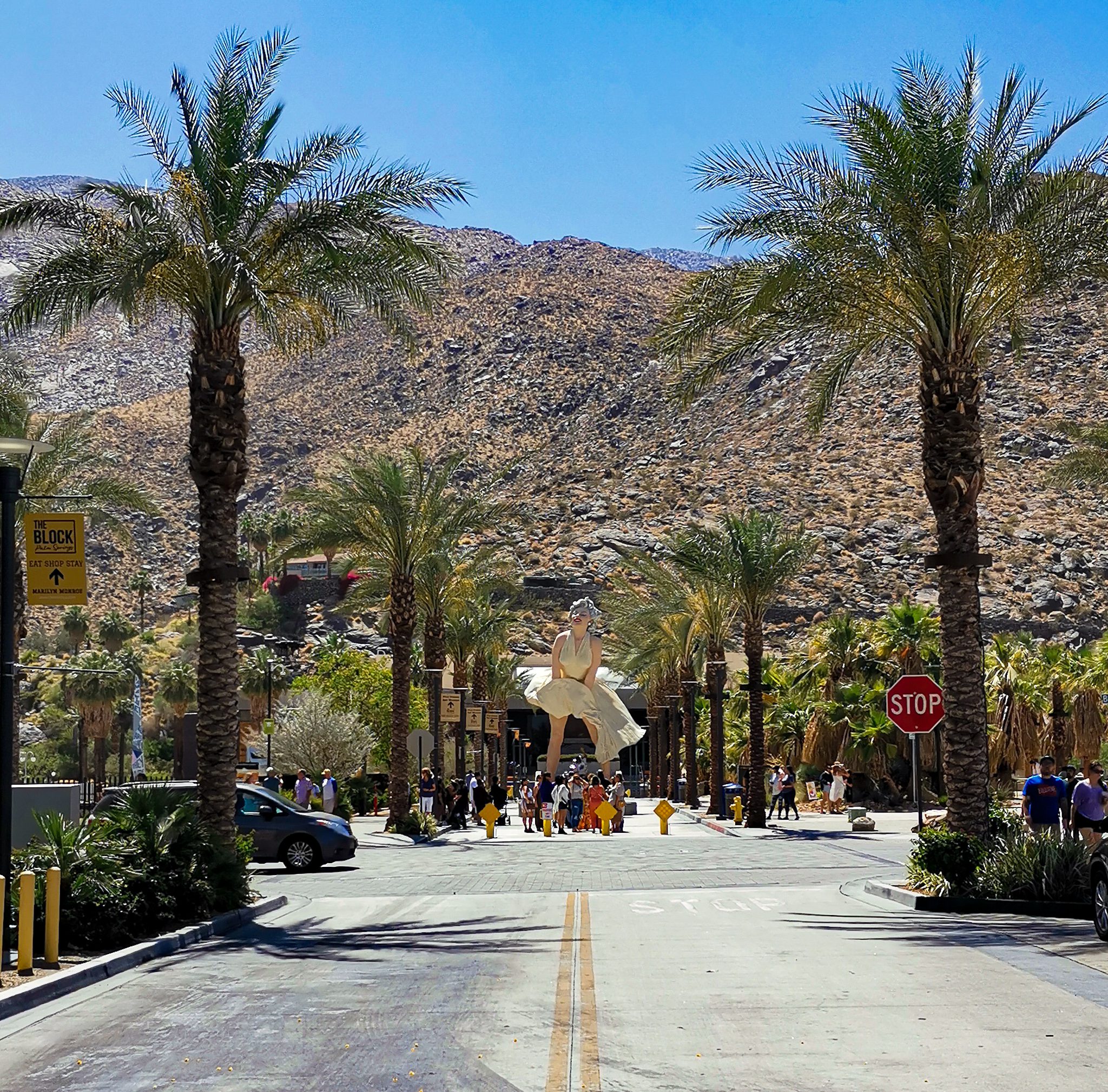 Sie ist wieder da! Die knapp acht Meter hohe Statue der weltbekannten Schauspielerin hat nun endlich (nach ihrer Tournee durch einige Städte der USA) ein festes zu Hause. Nachdem die Statue Opfer mehrerer nicht zeitgemäßer Anschläge wurde, erstrahlt sie nun am Rande des Zentrums in Palm Springs.