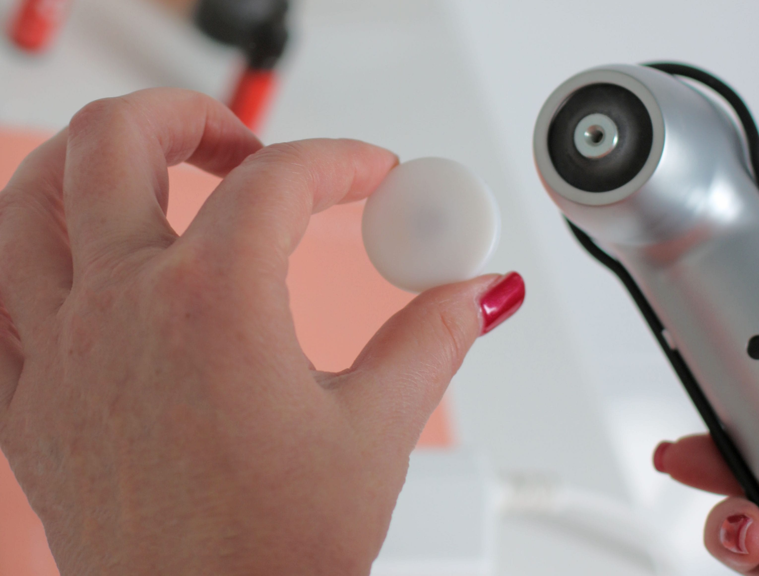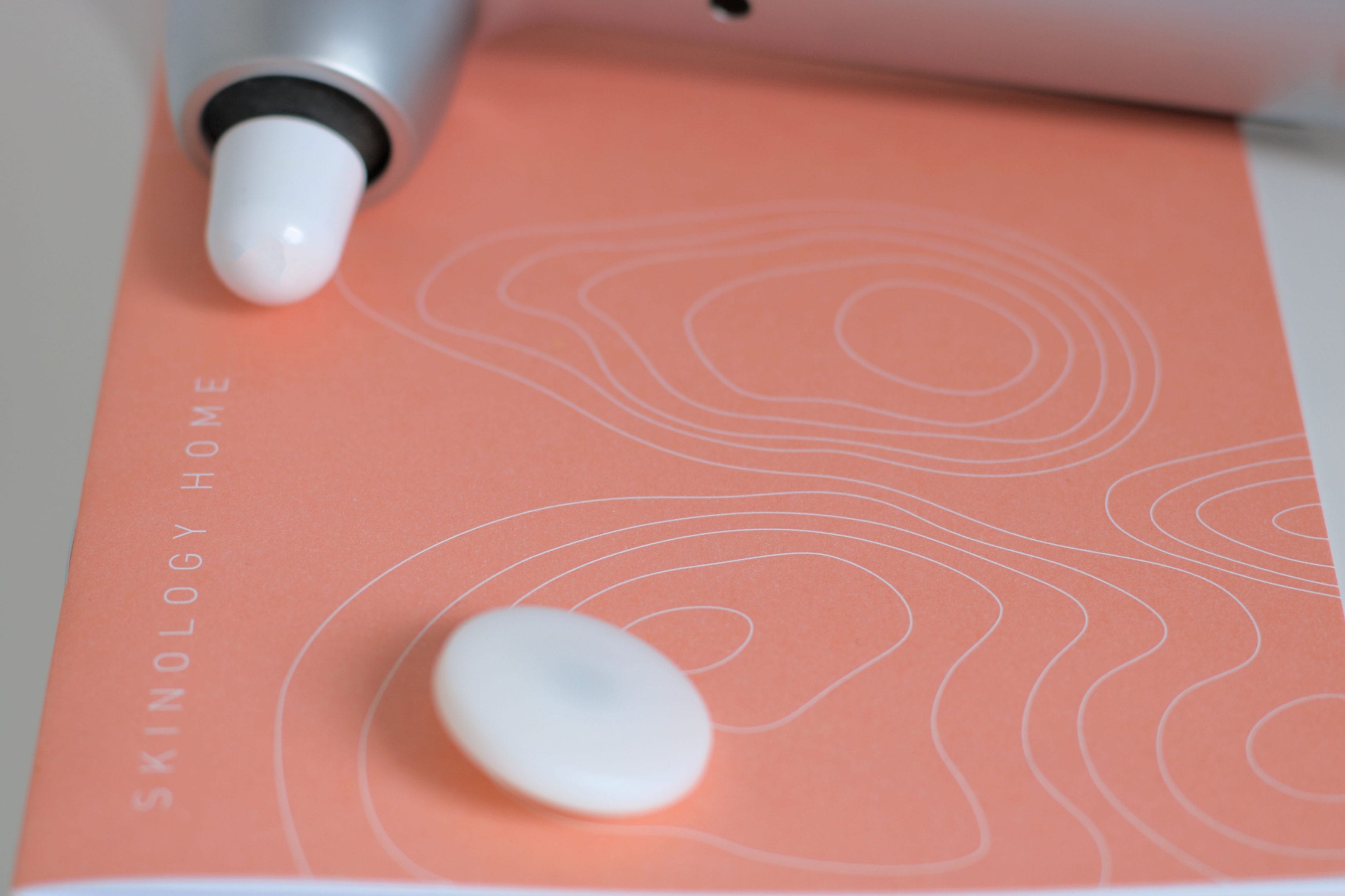 SKINOLOGY lässt sich in 3 einfachen Schritten anwenden und ist schnell erklärt. Hauptakteur ist das Novafon Schallwellengerät und 2 auswechselbare Behandlungsaufsätze, dem Teller- und dem Kugelaufsatz: