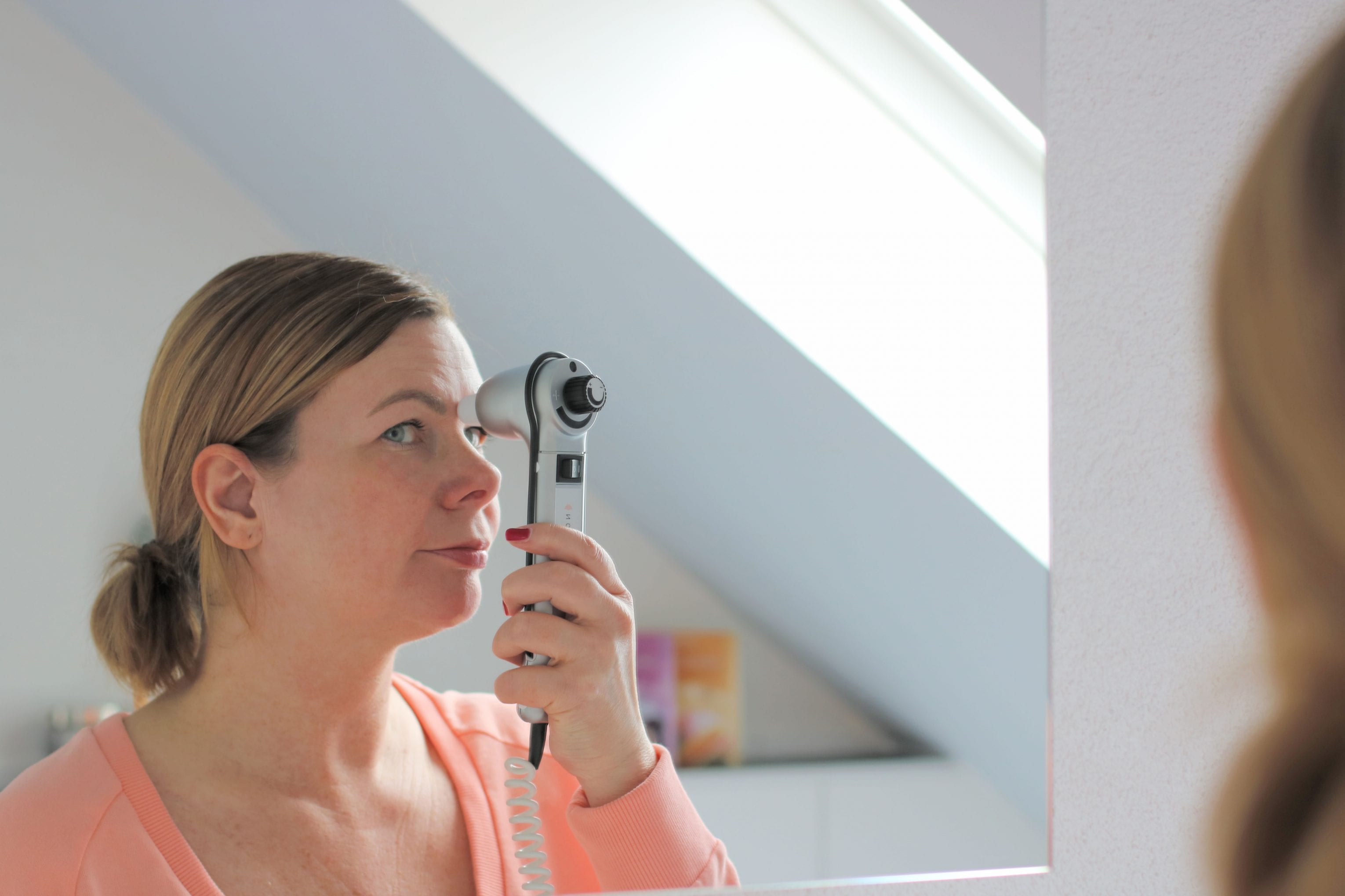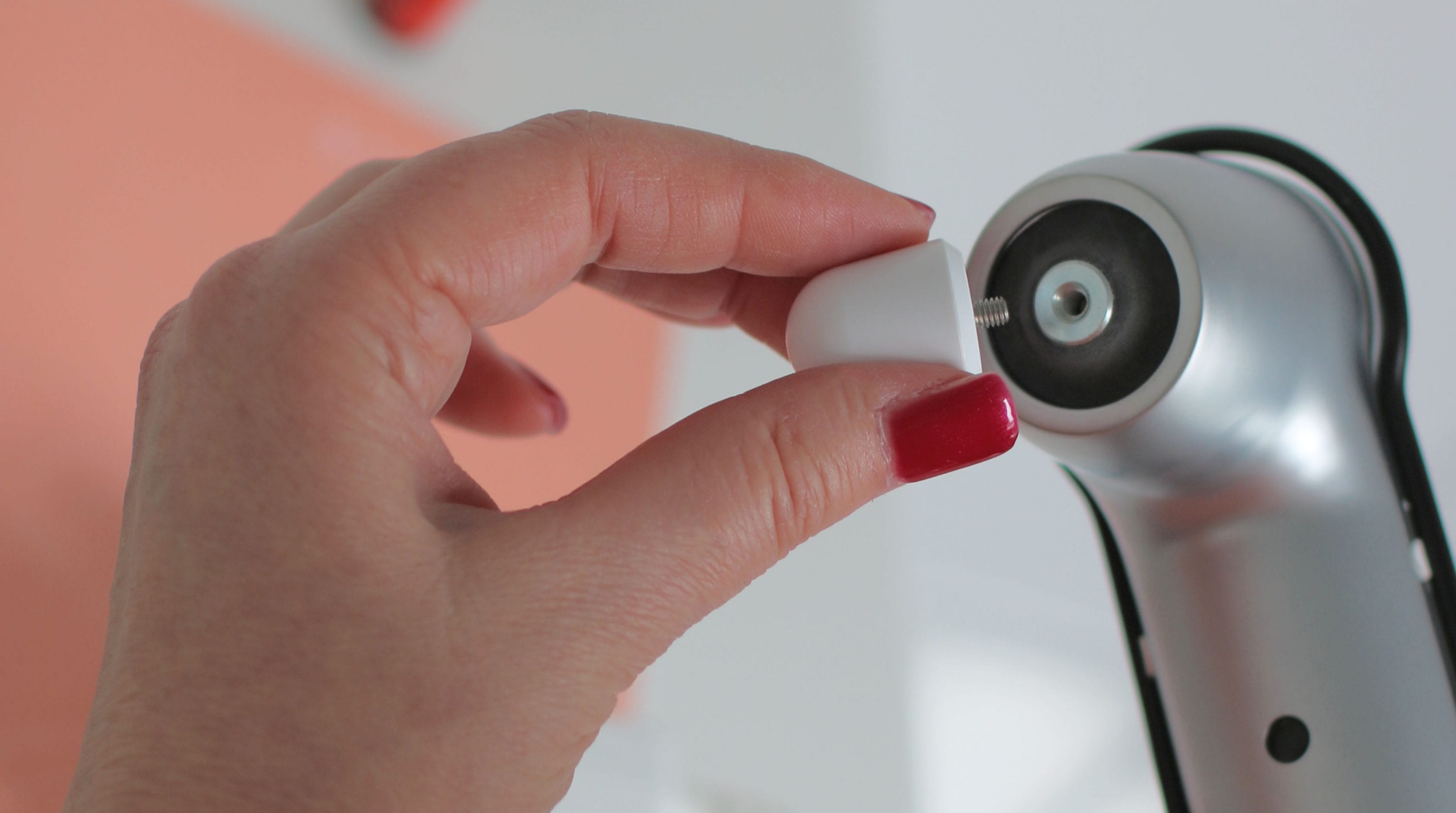 Bevor es los geht, am besten Ohrringe oder Ohrstecker ablegen. Denn bei der Berührung mit den Aufsätzen ensteht ein Geräusch, was einem eventuell erschrecken kann. Damit die Gesichtsmuskulatur bei der Behandlung schön entspannt ist, Zähne nun locker aufeinander und die Zunge an den Gaumen legen.