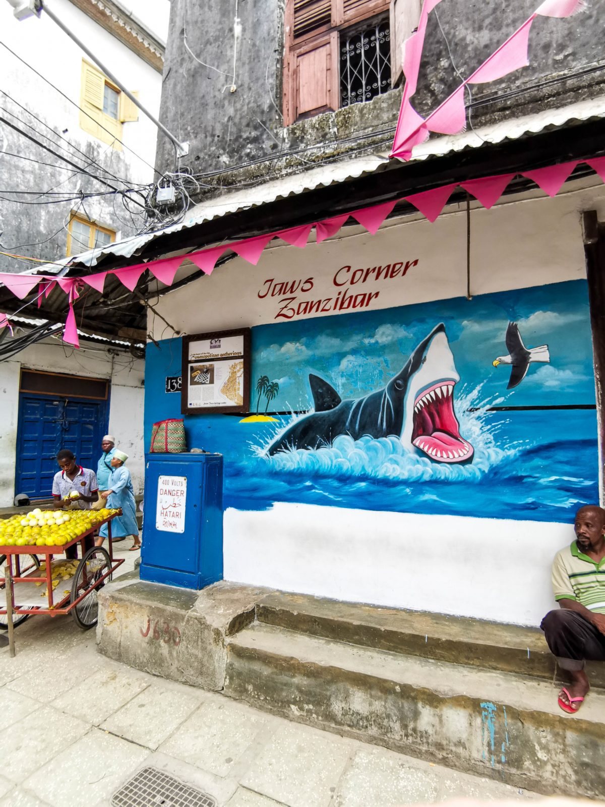 Der kleine Platz inmitten der Häuserschluchten ist ein ganz bekannter Ort. Hier traf man sich in der Historie, um gemeinsam zu essen und zu trinken. Bekannt ist dieser Platz auch für ein Telefon, mit dem man gratis Ferngespräche führen könne. Unser Guide erzählte uns, dass auf diesem Platz der erste Fernseher der Insel stand. Noch heute treffen sich die Sansibaris um dort vor allem Fußball gemeinsam zu schauen.