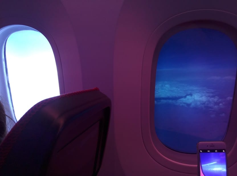 Fliegt man von Europa in die USA fliegt man praktisch mit der Zeit. Je nach Ziel entspricht die Landezeit oft sogar der Startzeit. Die knapp 9000 km nach Kalifornien wären also jederzeit bei prallem Sonnenschein gewesen. Der Dreamliner gaukelte einem jedoch eine Dämmerung mit Nacht vor. Dies geschieht durch elektronisch tönbare Scheiben. Die klassischen Fensterklappen gibt es dort nicht mehr. Man kann höchstens noch dunkler stellen.