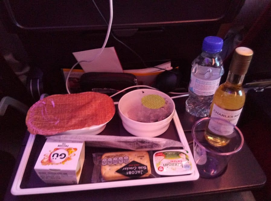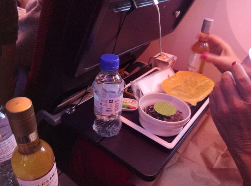 An Bord gab es relativ zügig einen kleinen Snack mit Softdrinks. Anschließend gab es die Menükarte mit exquisiten Speisen. Klar spielte die Marketingabteilung hier eine größere Rolle als der Industriecaterer, aber dennoch ganz ansehnlich. Petra und ich wählten den Weißwein. Interessanterweise bekamen wir zwar zweimal die gleiche 300ml Weinflasche, einmal aus Frankreich und einmal aus Kalifornien. Naja, einem geschenkten Gaul, schaut man …