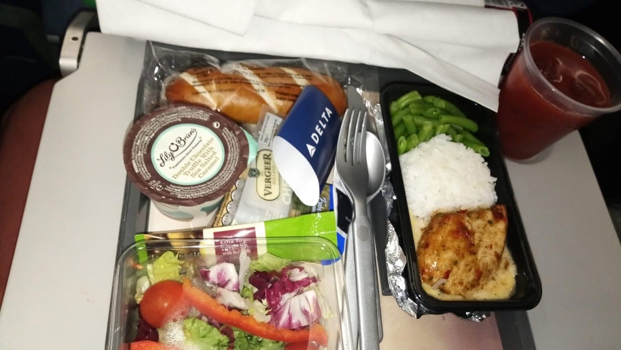 Bei beiden Langstreckenflügen gab es ausreichend Speisen und Getränke. Selbst Alkohol gab es in unterschiedlicher Form. Selbst Markenspirituosen oder Longdrinks waren frei. Das Essen war für Economy recht schmackhaft. Insgesamt gab es um Hinflug einen Snack, ein Hauptmenü, wieder einen süßen Snack, eine kleine Mahlzeit in Form eines Wraps und ein Eis. Beim Rückflug war das Menü leicht auf den Nachtflug angepasst, sodass alles relativ zügig serviert wurde. Am Morgen gab es dann noch einmal amerikanisches Zuckerfrühstück…