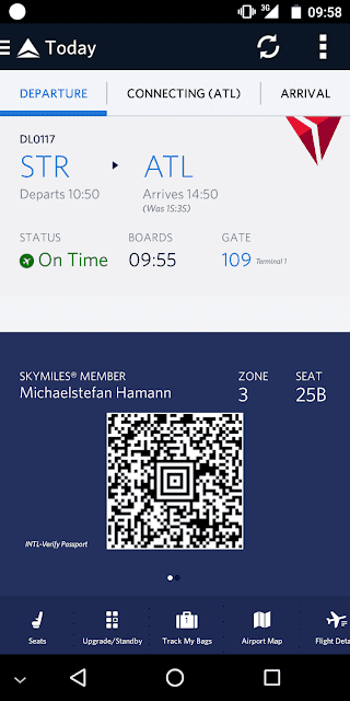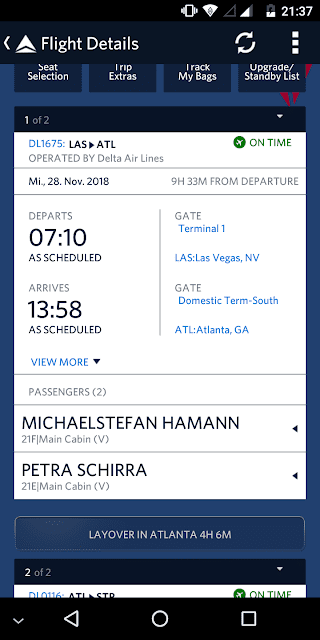 Unser Flug bestand jeweils einmal aus einem internationalen Langstreckenflug zwischen STR und ATL sowie einem Mittelstreckenflug zwischen ATL und LAS. Die beiden Langstreckenflüge wurden mit zwei unterschiedlichen sehr betagten Boeing 767-400 durchgeführt. Die beiden kürzeren Flüge fanden mit einer 737 und einem A321 statt.