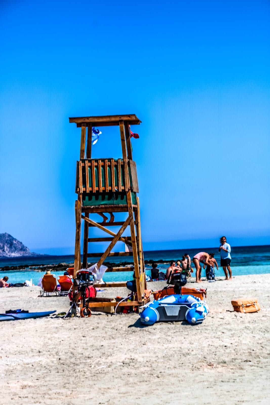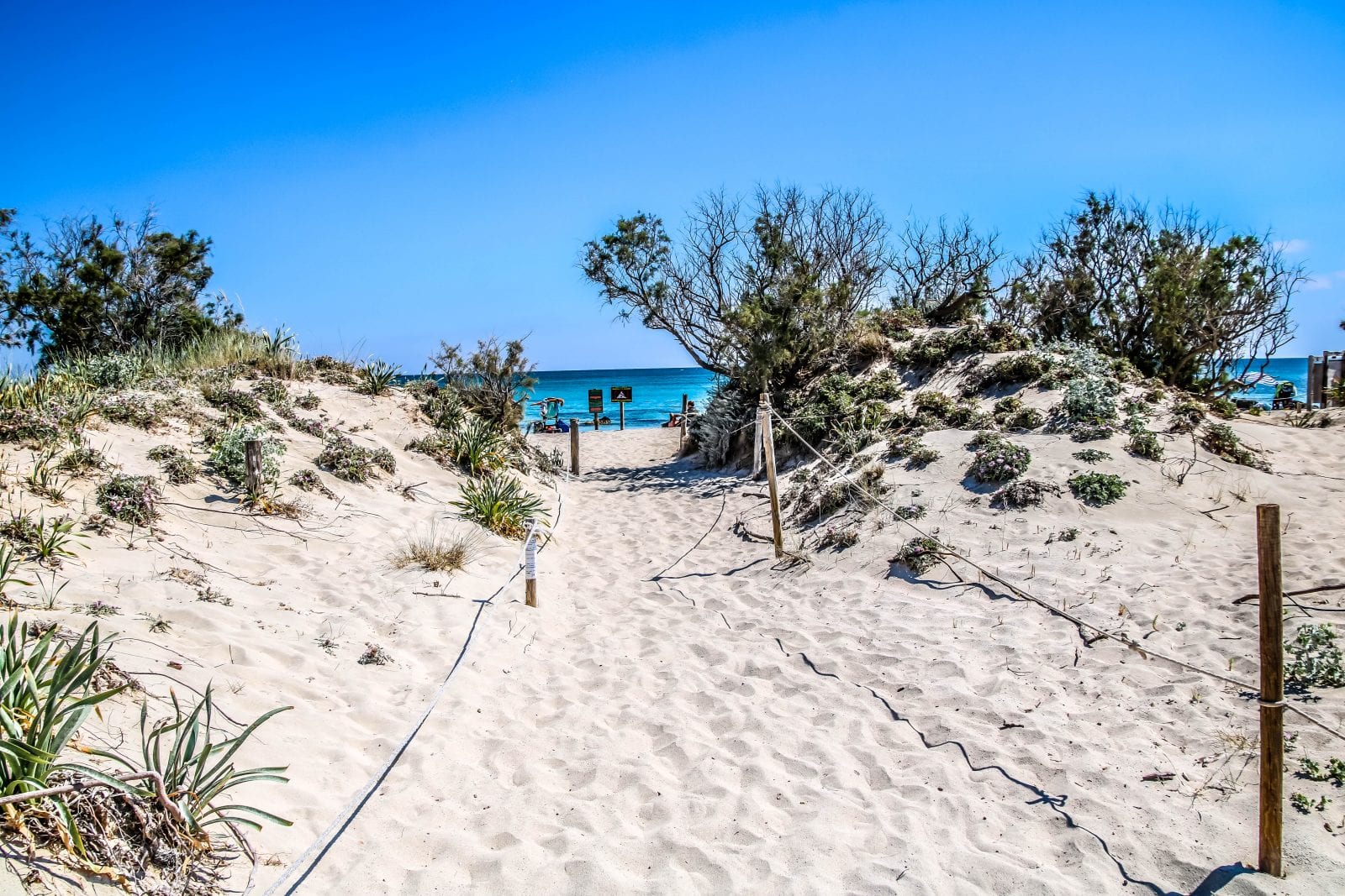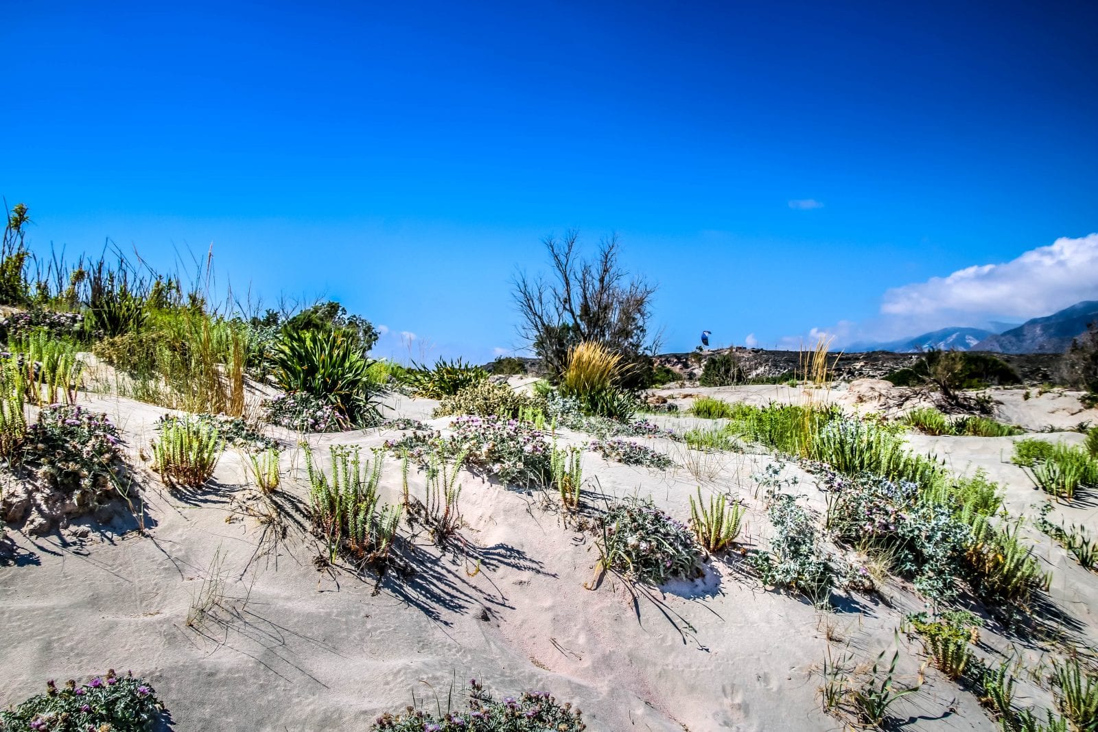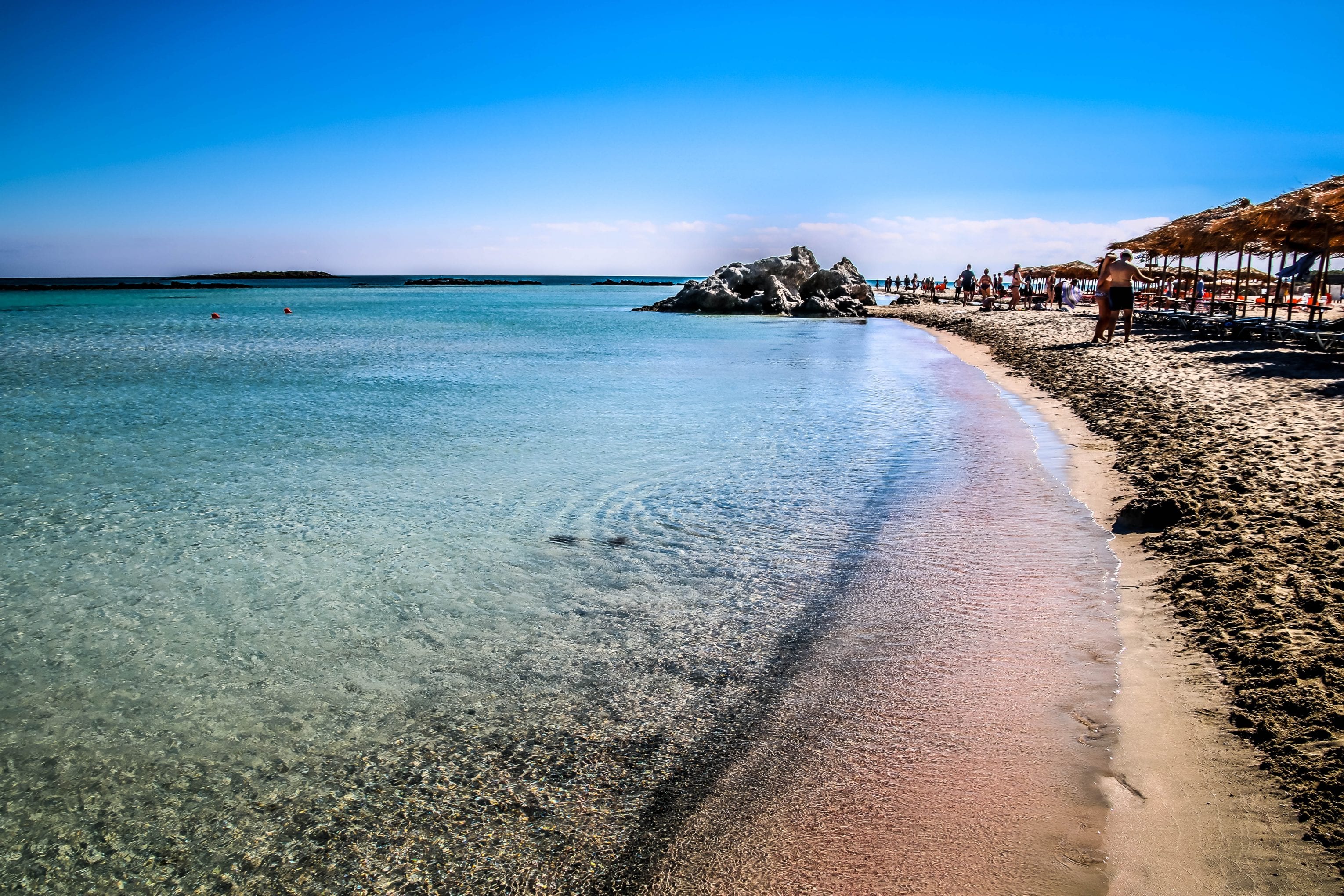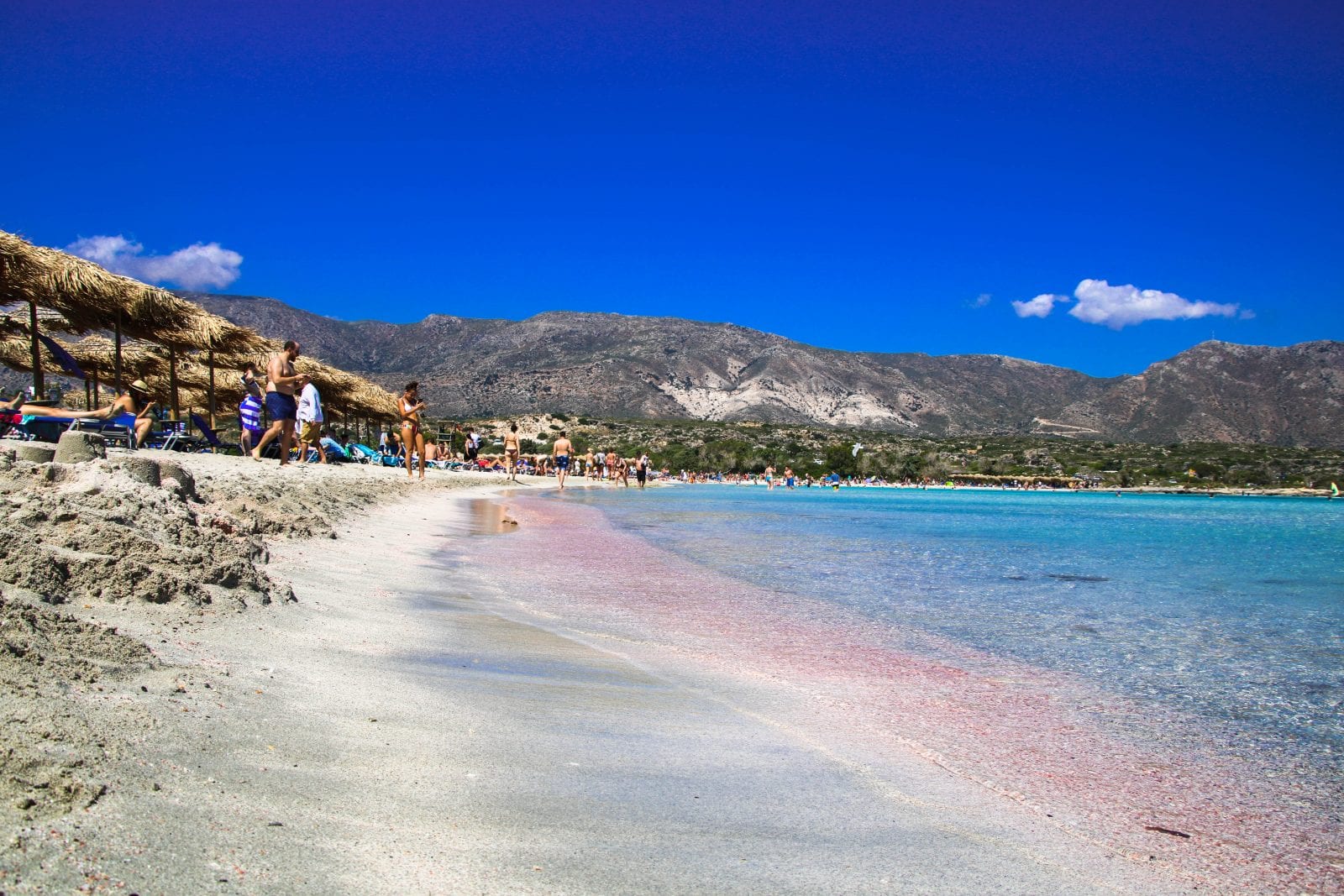 Der Strand ist natürlich in mehrere Sektoren aufgeteilt. Der berühmteste Abschnitt beginnt an der Südseite der Sandbank und geht bis aufs Land über. Die andere Seite der Sandbank ist so flach, dass man auch mit Kleinkindern einige hundert Meter ins Wasser gehen kann. Am Ende der Sandbank befindet sich die Insel Elafonissi, nach der auch der gesamte Strand benannt ist. Auch auf dieser Insel gibt es großartige Naturstrände, diese liegen aber teilweise in Dünen und geben ein ganz anderes Flair. Die pinke Färbung kommt übrigens von kleinen Muschelteilchen.