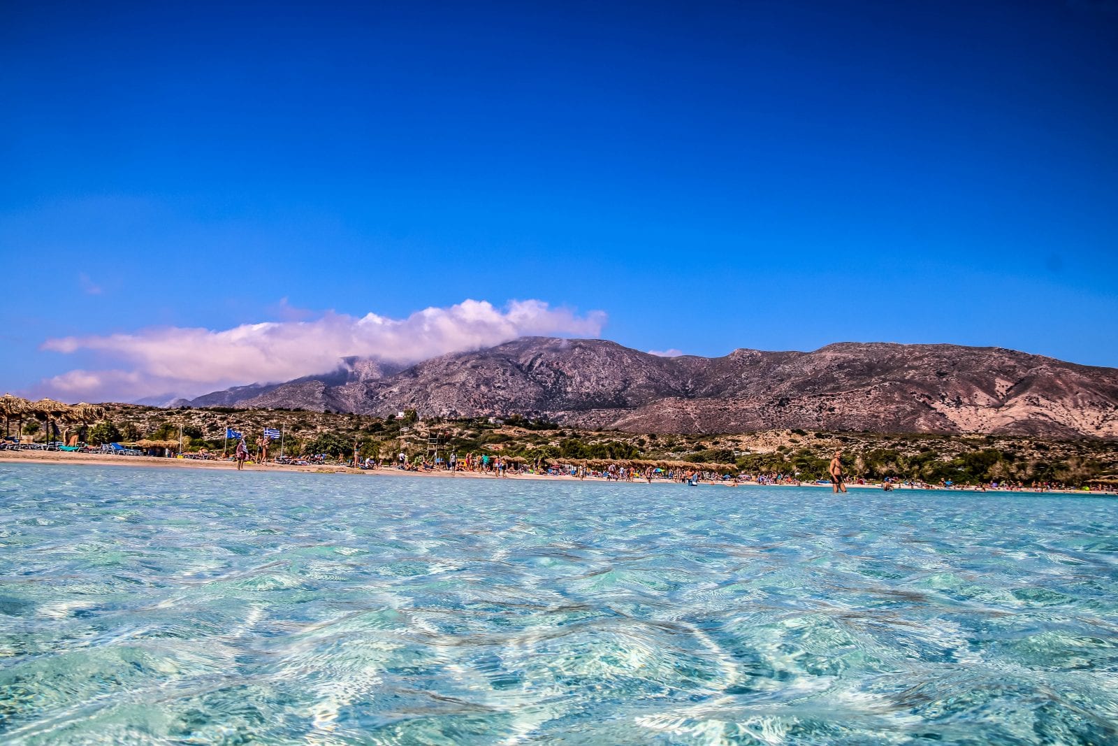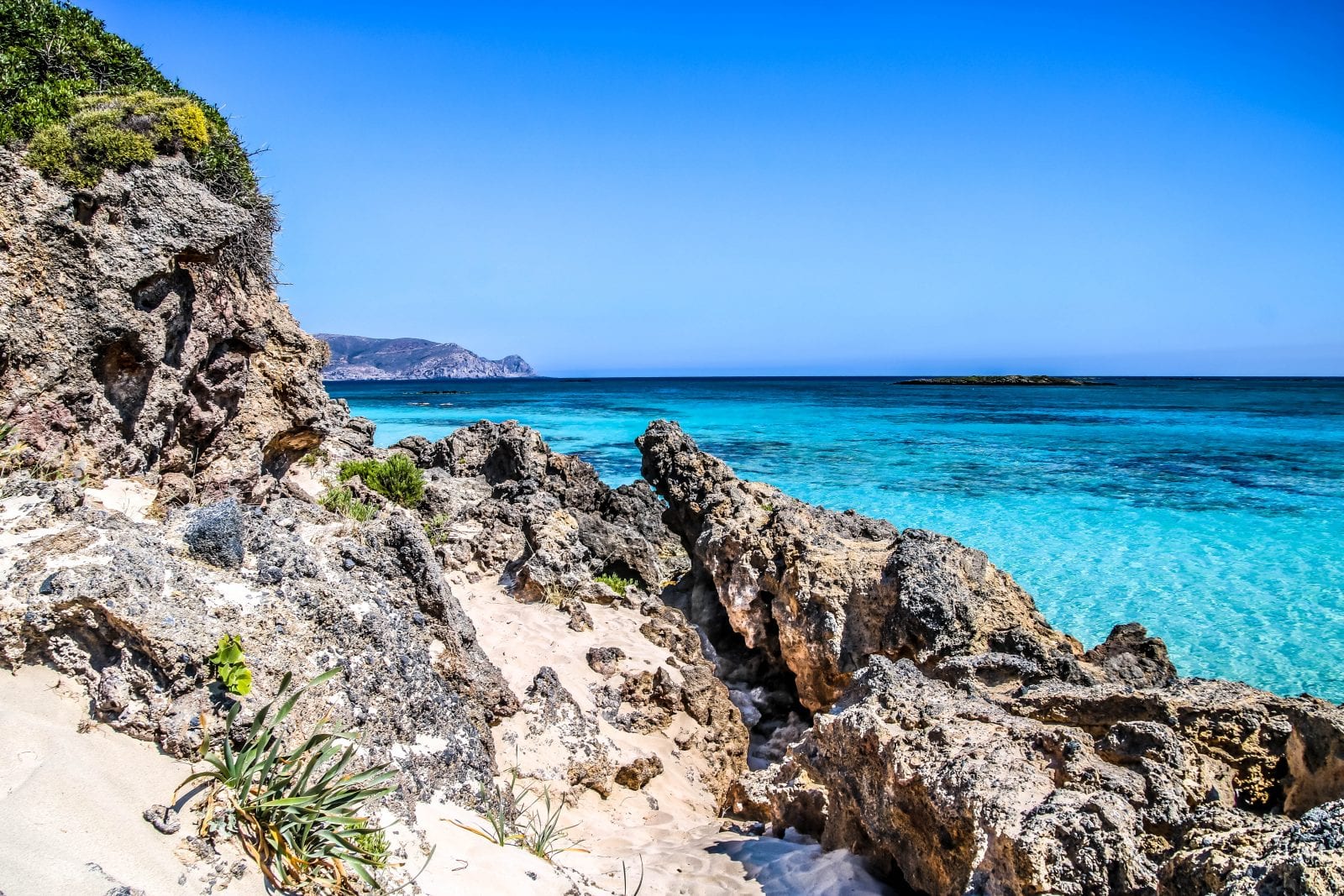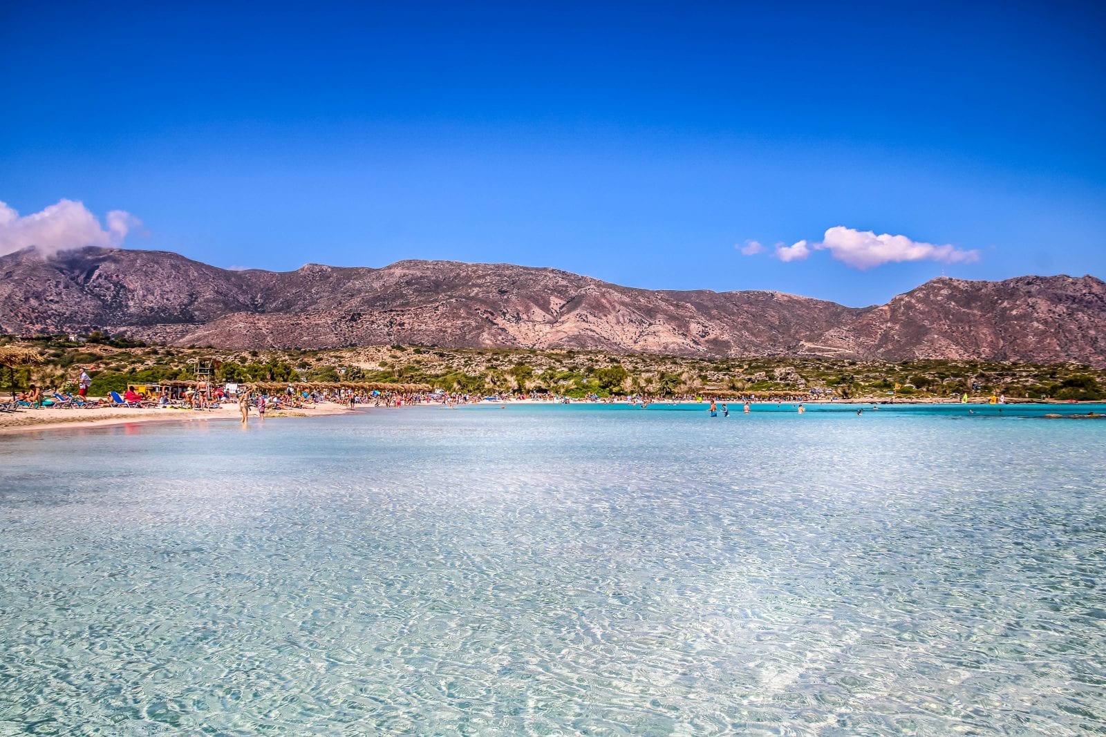Die kleine Insel Elafonissi ist durch eine bis zu 350 Meter breite Sandbank mit Kreta verbunden. Je nach Wetterlage und Jahreszeit ist diese breiter oder schmaler. Die Nordseite ist sehr flach und prima für Kinder geeignet. Auf der Südseite kann man auch gut im kristallklaren Wasser schwimmen.