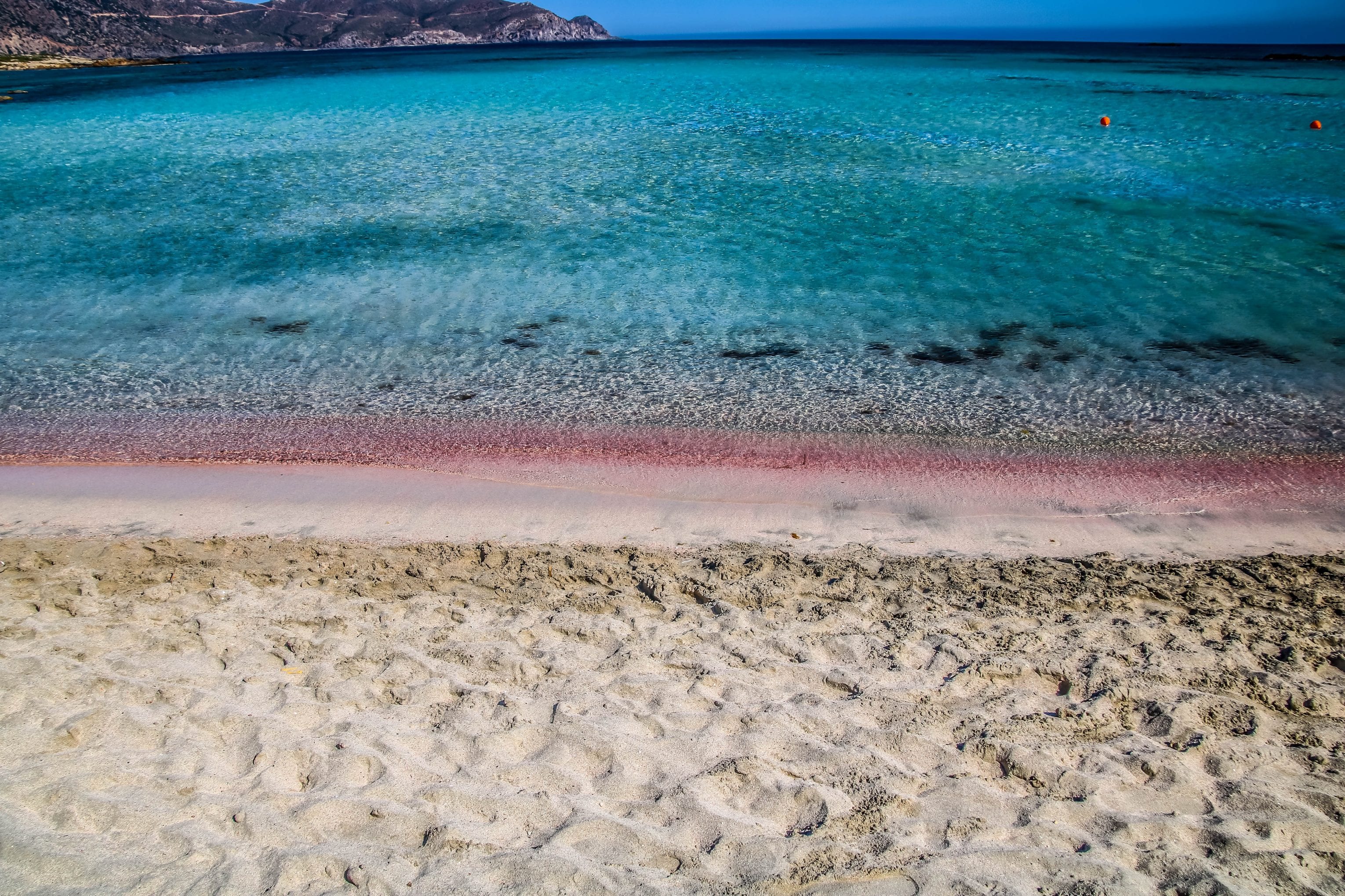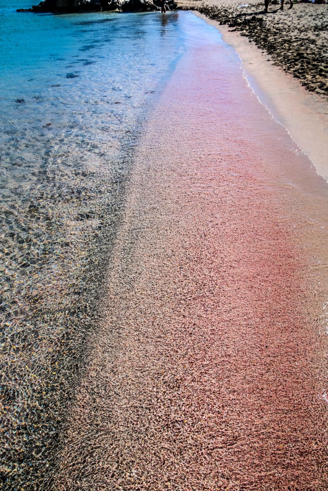 Sandstrände gibt es dutzende, wobei man fairer Weise sagen muss, dass auch allein wegen des flachen Meeres und des feinen Sandes würde sich der Ausflug nach Elafonissi lohnen. Doch die meisten Urlauber kommen nicht nur deswegen. Elafonissi ist nämlich Hotspot durch seinen rosa farbigen Sand. Zunächst sucht man ihn vergeblich. Doch an der Südseite der riesigen Sandbank erkennt man ihn an der Wasserkante. Zieht man sich eine Sonnenbrille an oder fotografiert ihn, ist er auch sehr deutlich erkennbar.
