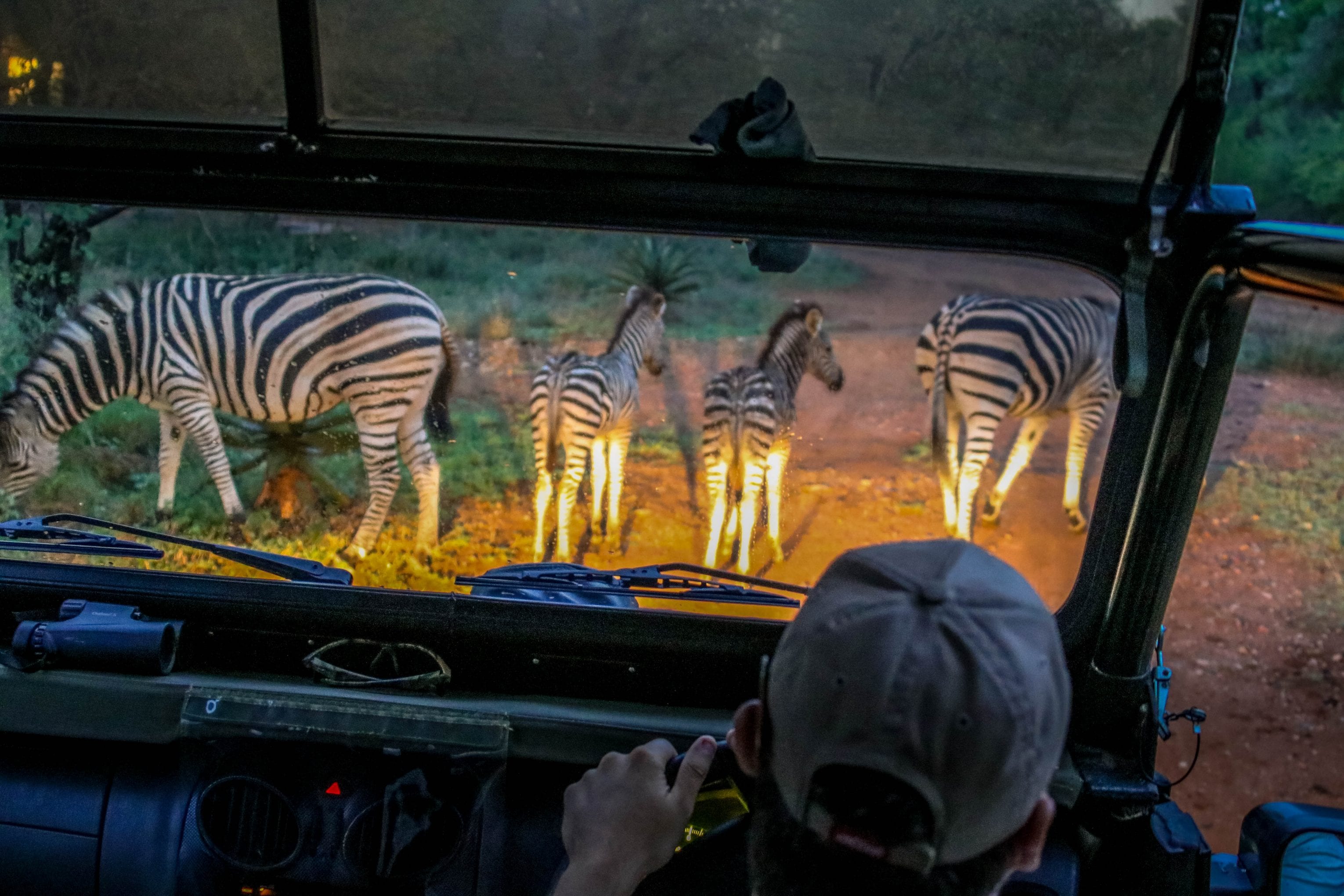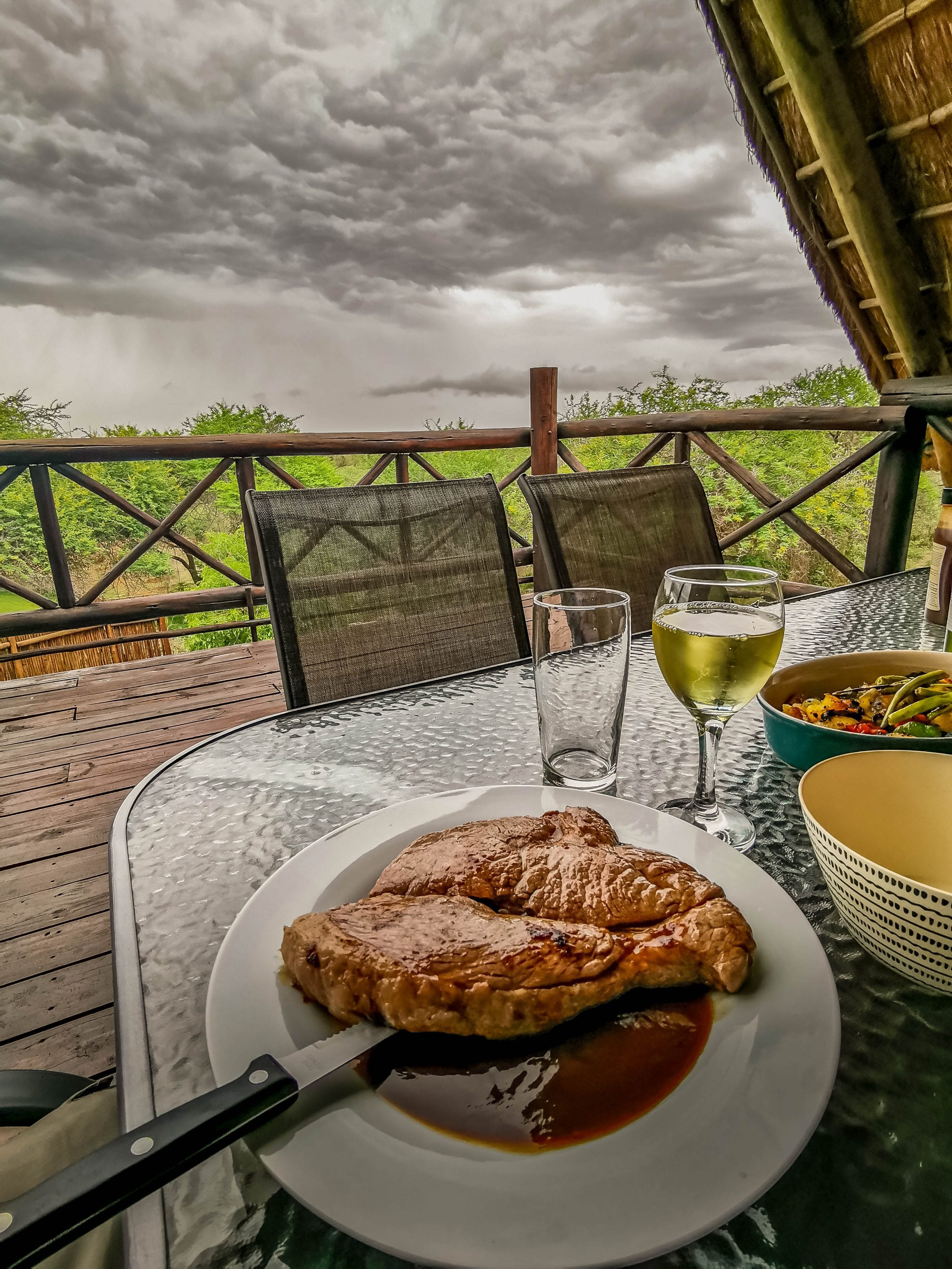 Mit Einbruch der Dunkelheit gehört der Park den Tieren. Solange es dunkel ist, bist Du auch angehalten, möglichst nur im Auto unterwegs zu sein. Die Tiere leben innerhalb des Parks wie bereits erwähnt, völlig frei. Dieser Umstand sorgt dafür, dass Du abends vom Balkon oder der Terrasse bei einem südafrikanischen Wein den Zebras, Kudus oder Giraffen beim Umherstreifen zuschauen kannst.