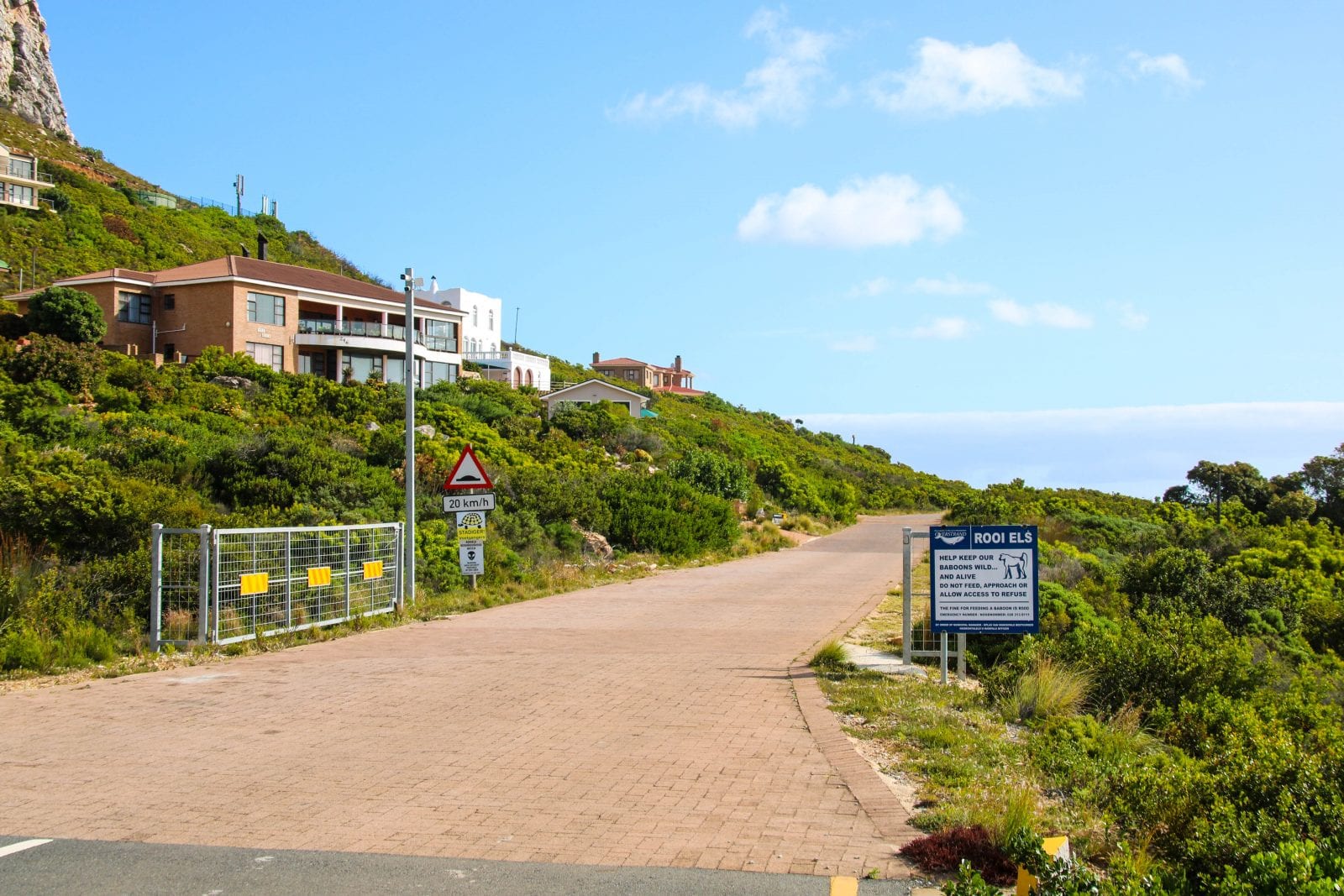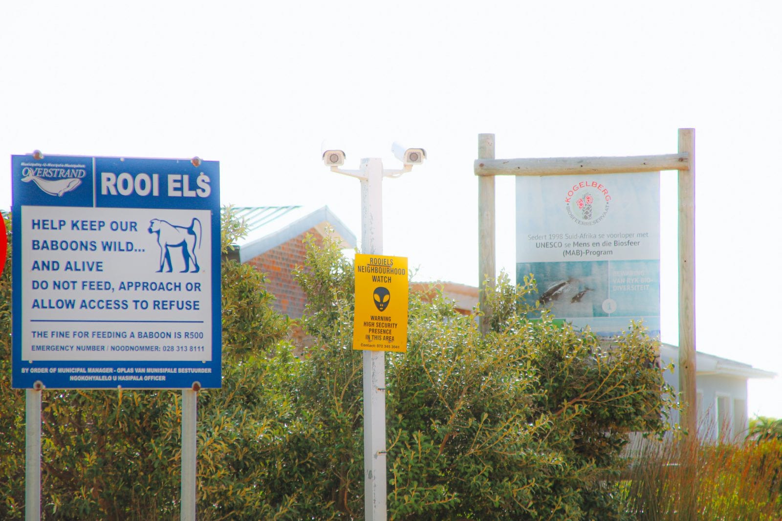 Während man sich in der Metropolregion rund um den Tafelberg mit Elektrozäunen und Stacheldraht vor der örtlichen Kriminalität schützen muss, benötigt man in Rooi-Els nicht einmal einen Schlüssel. Man kann auch mal in den “Garten” gehen und muss nicht ein halbes Dutzend Sicherheitsschleusen durchlaufen. Rooi-Els ist sicher, vielleicht sicherer als man es auf dem Lande hierzulande gewohnt ist. Die Zugangsstraßen sind Kamera überwacht und regelmäßig fährt ein Wachdienst durch die schmalen Straßen. Der größte Sicherheitsaspekt ist aber die Lage. Trotz der Nähe zu Kapstadt, ist Rooi-Els nur gezielt mit dem Auto erreichbar. Und bricht man irgendwo ein, muss man auch wieder weg und das ist gar nicht mal so einfach.