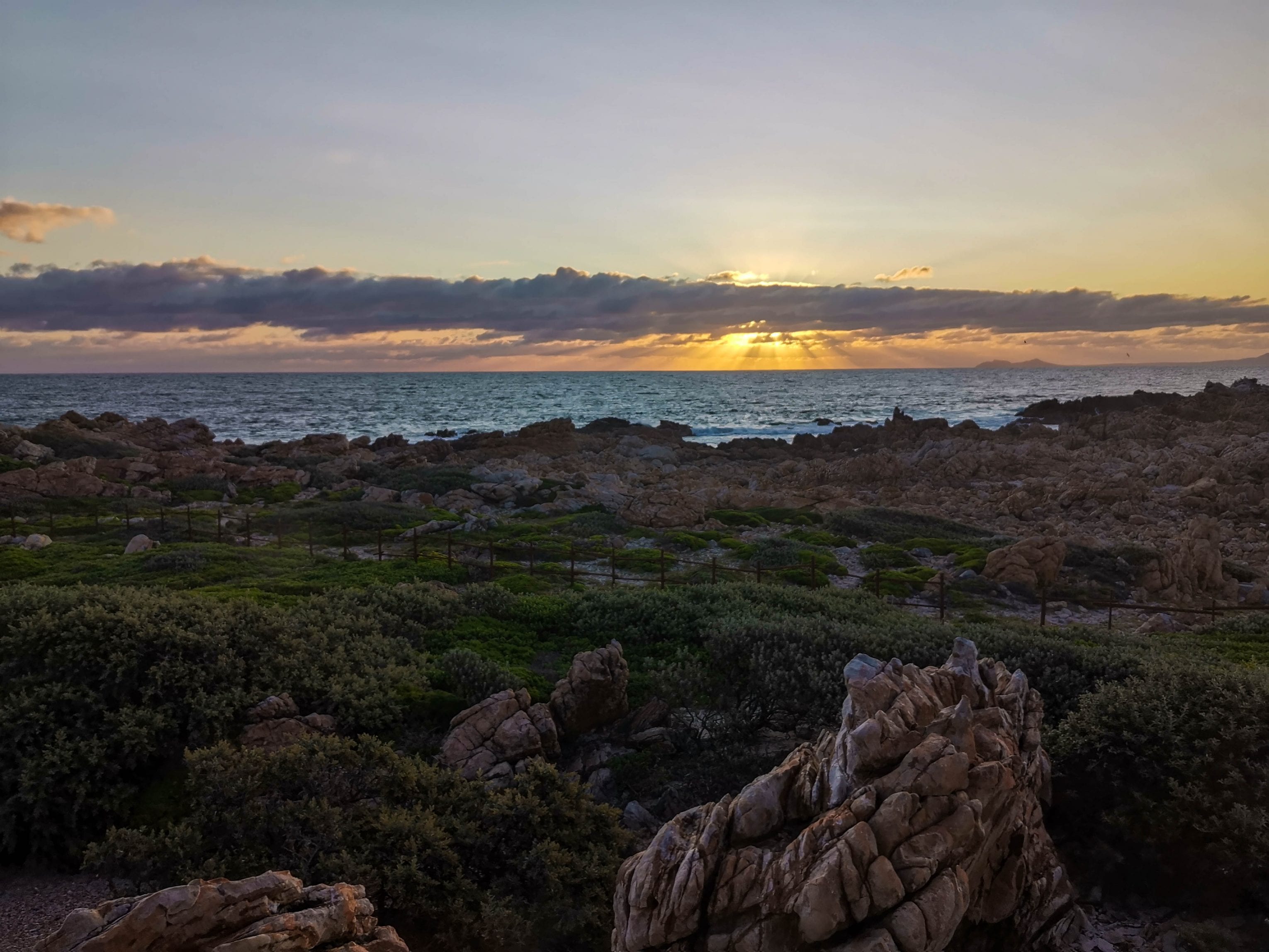 Dieser Sonnenuntergang ist wohl unbezahlbar! Wenn Du genau hinschaust siehst Du am Horizont zwei Hügel, etwas rechts der Sonne. Das ist das Kap der guten Hoffnung! Einer der bekanntesten Orten der Welt und das vom Küchenfenster aus.