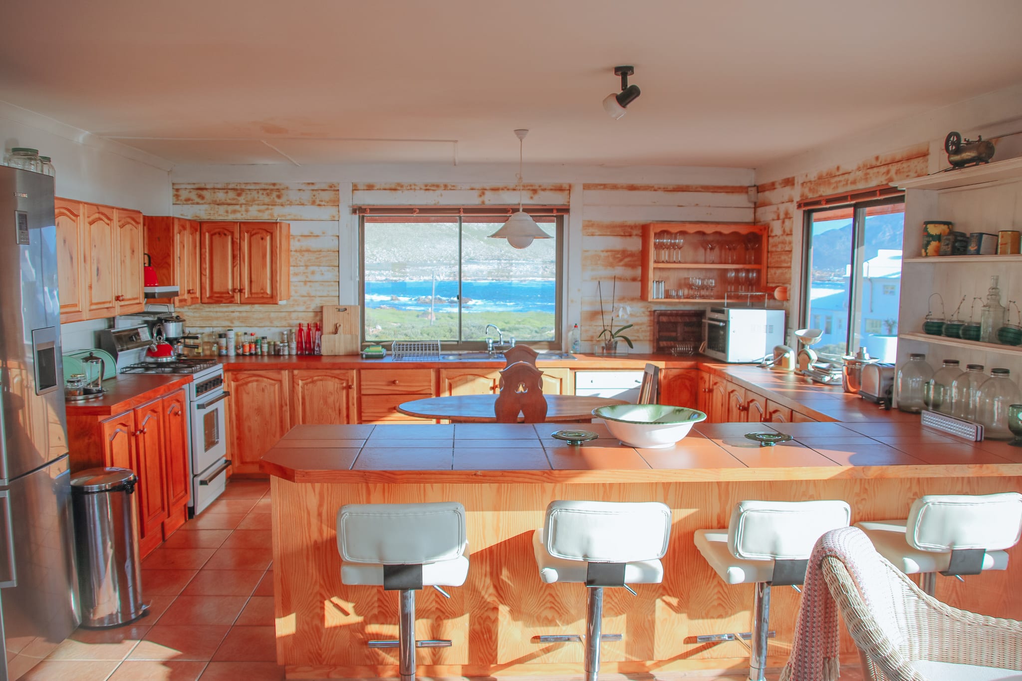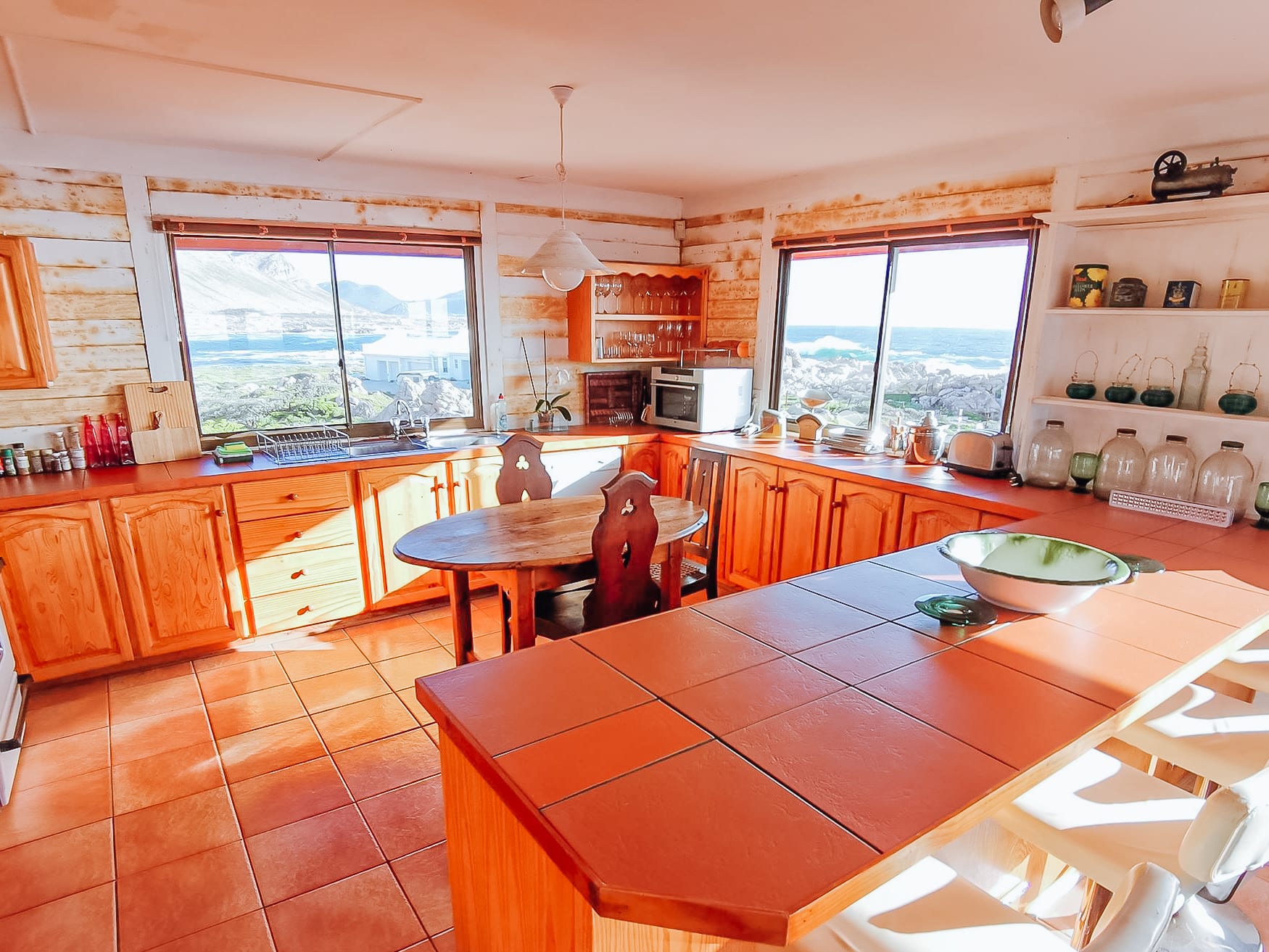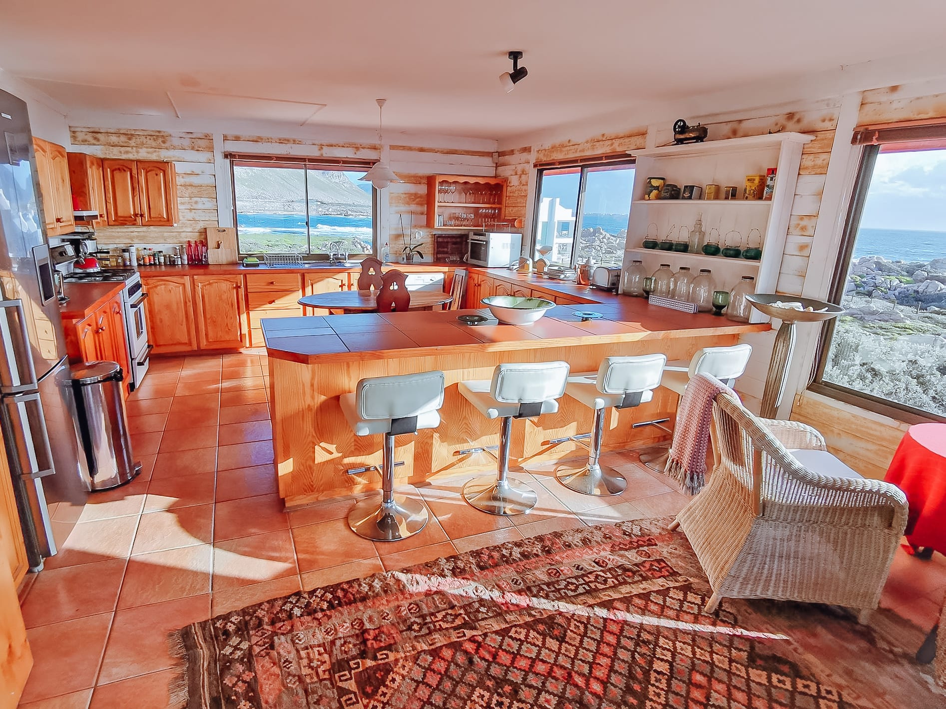 Die riesige Küche mit tollem Blick auf den Atlantik bietet alles, was Du brauchst. Es gibt wirklich jedes Küchenutensil, Du kannst einfach alles machen, es ist echt jedes Küchengerät vorhanden. Der große Kühlschrank mit Gefrierschrank hat auch eine Eiswürfelmaschine. Es gibt auch genug Töpfe und Geschirr für eine große Party. In der Küche selbst gibt es einen antiken Holztisch mit drei Stühlen. Zusätzlich gibt es eine Theke mit vier Barhockern.