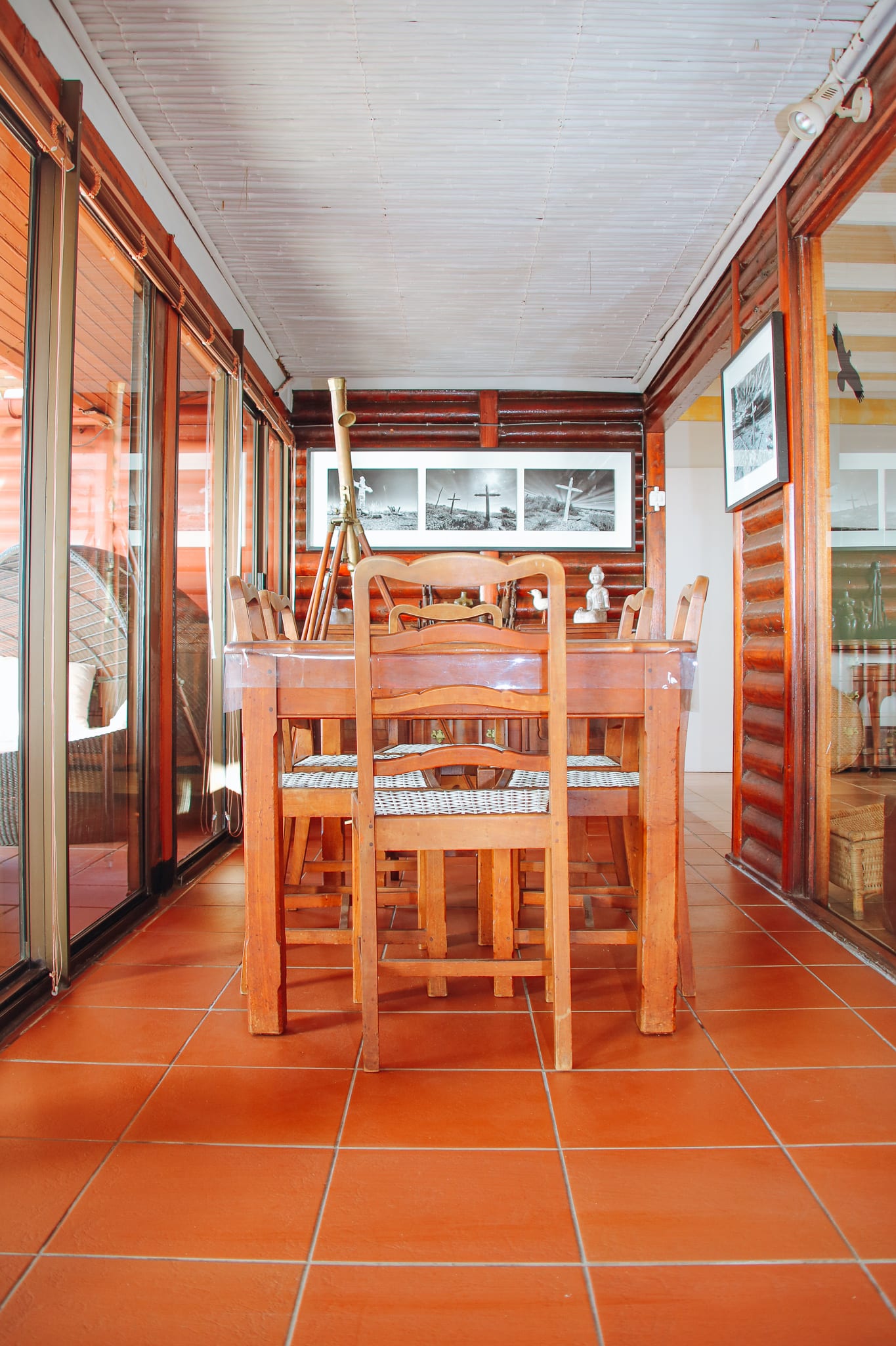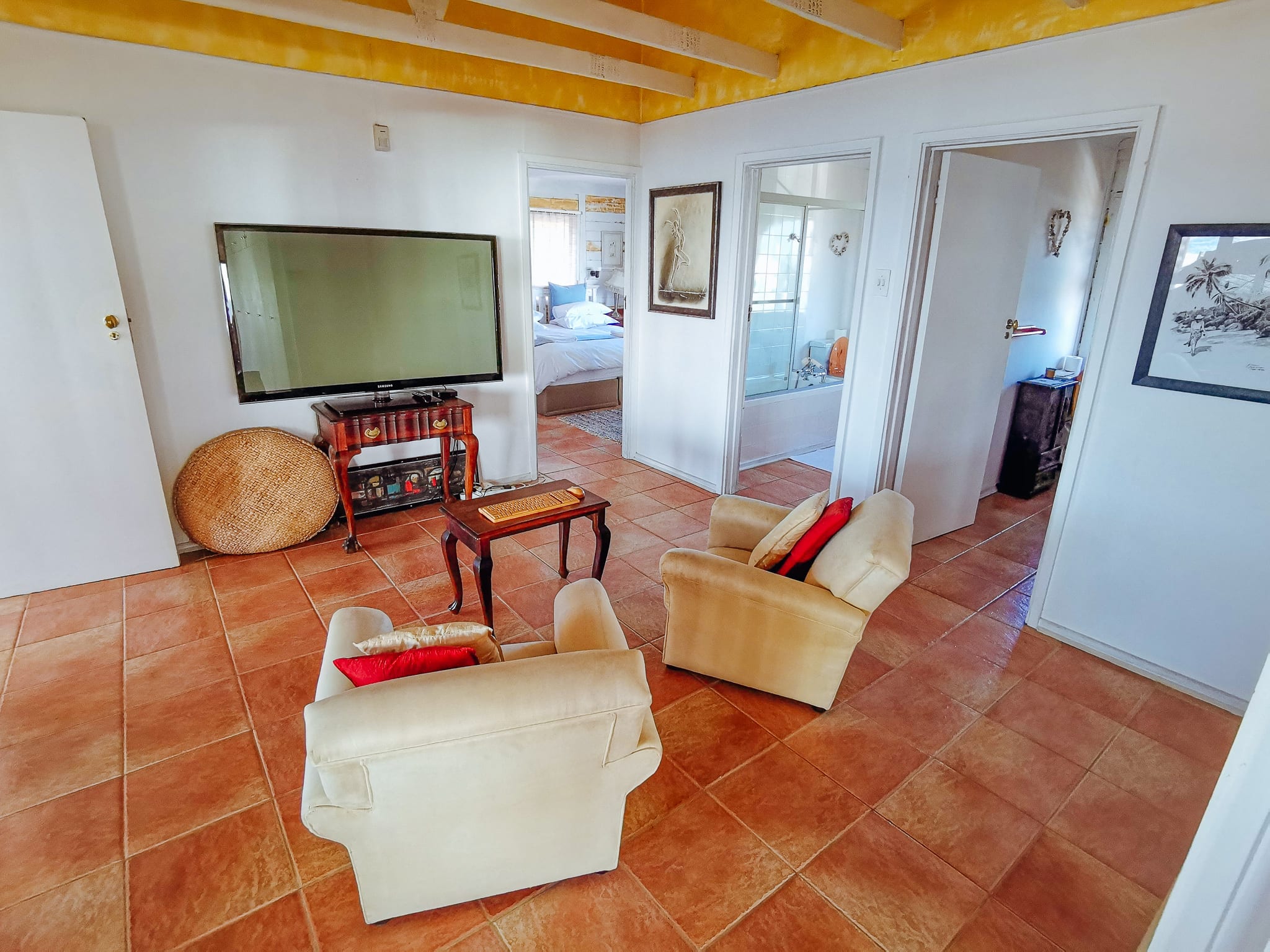 Das Haus besteht aus zwei Etagen, die obere wird als Ferienwohnung vermietet, das Erdgeschoss wird zeitweise durch die Besitzerin bewohnt. Regelmäßig schlafen dort auch zwei Housekeeper, die das Haus und Umfeld in Ordnung halten. Insgesamt verfügt die obere Etage über drei Schlafzimmer mit je einem Doppelbett. Zwei Badezimmer runden das ganze ab.