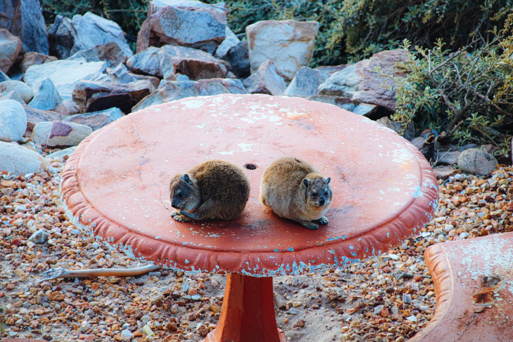 Viel knuffiger sind eh die Dassies oder zu deutsch Felsenschleifer (Klippschliefer). Die Großfamilie mit etwa 30 Tieren wohnt direkt am Haus in den Büschen und Felsen. Die kleinen Viecher toben den ganzen Tag. Anders als Ratten respektieren sie aber ihre menschlichen Nachbarn. Sie nutzen zwar die Terrasse und die Gartenmöbel, aber ins Haus läuft niemand.