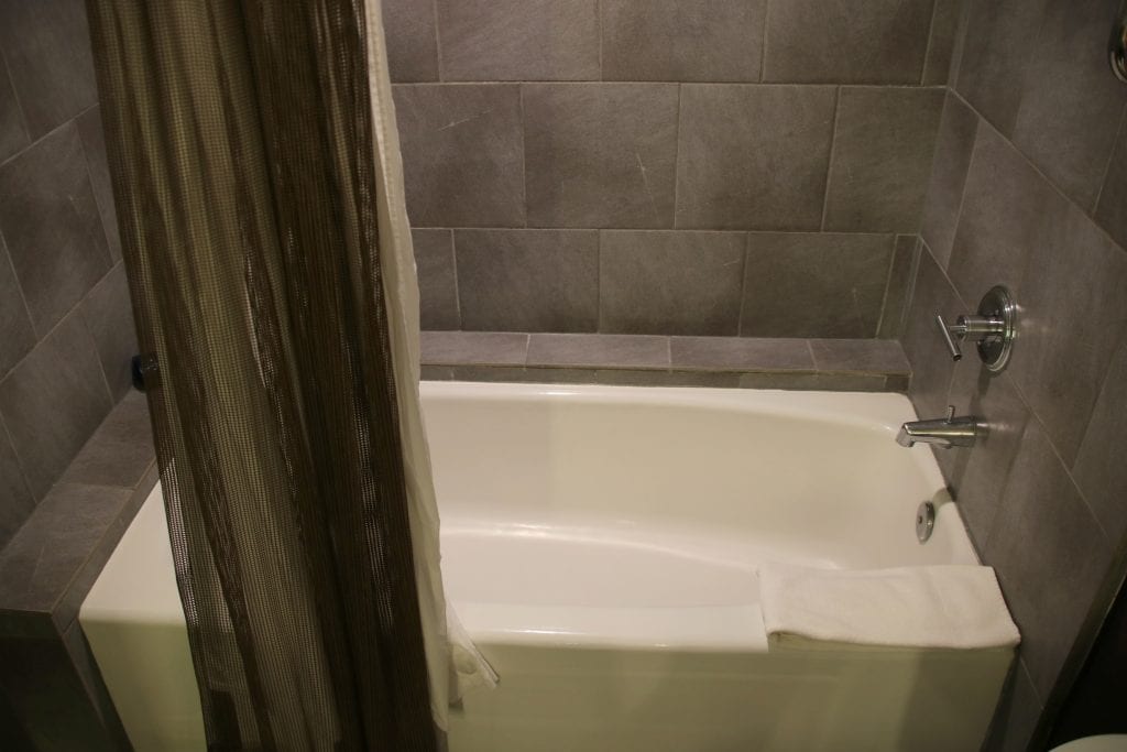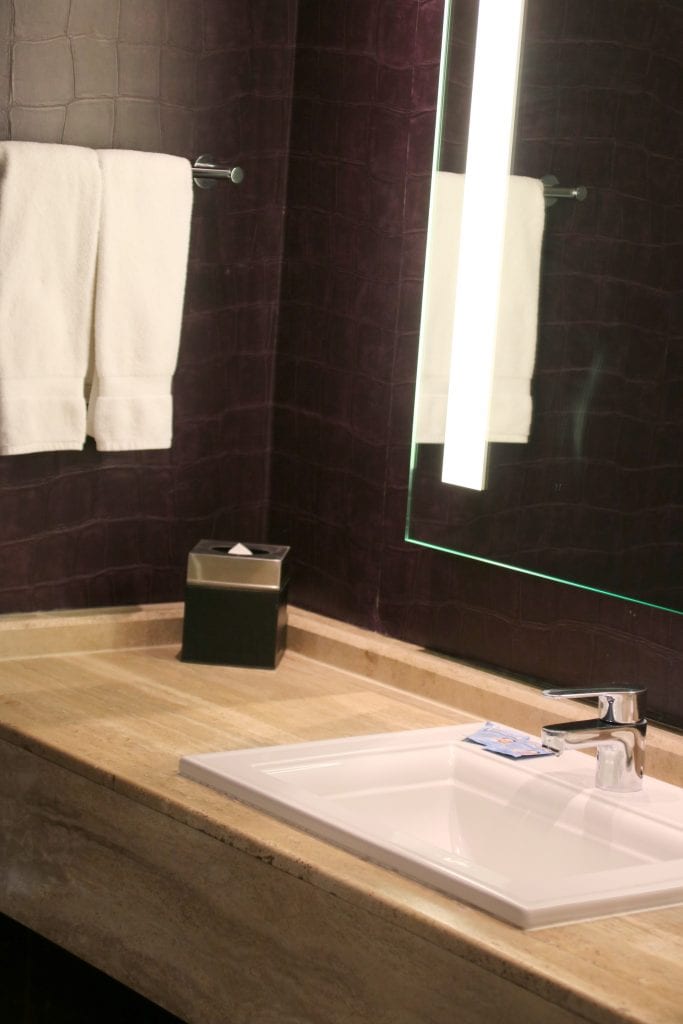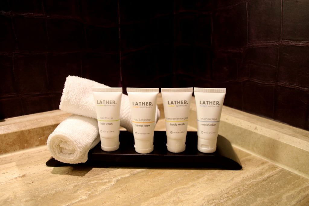 Auch das Bad war angenehm geräumig und sauber. Wer in den USA viel unterwegs ist, weiß, dass das auch bei teuren Hotels kein Standard sein muss. Es gab die üblichen Pflegeprodukte in gehobener Qualität. Ganz zu Freude von Petra gab es einen vollwertigen Haarfön, schön verpackt in einem Stoffbeutel.
