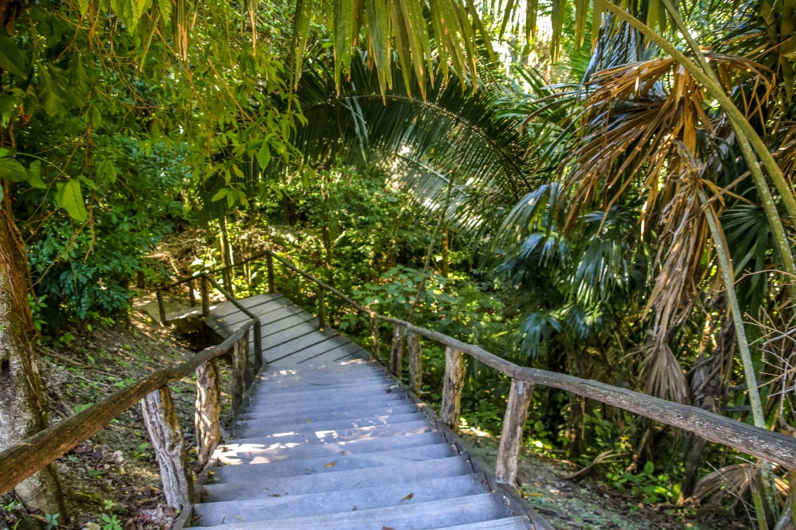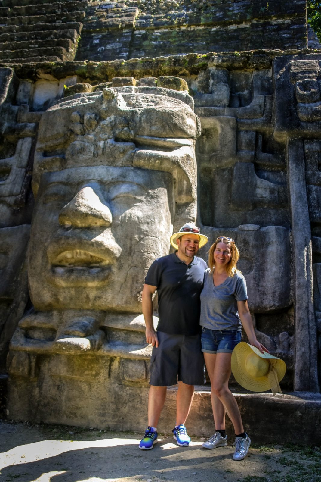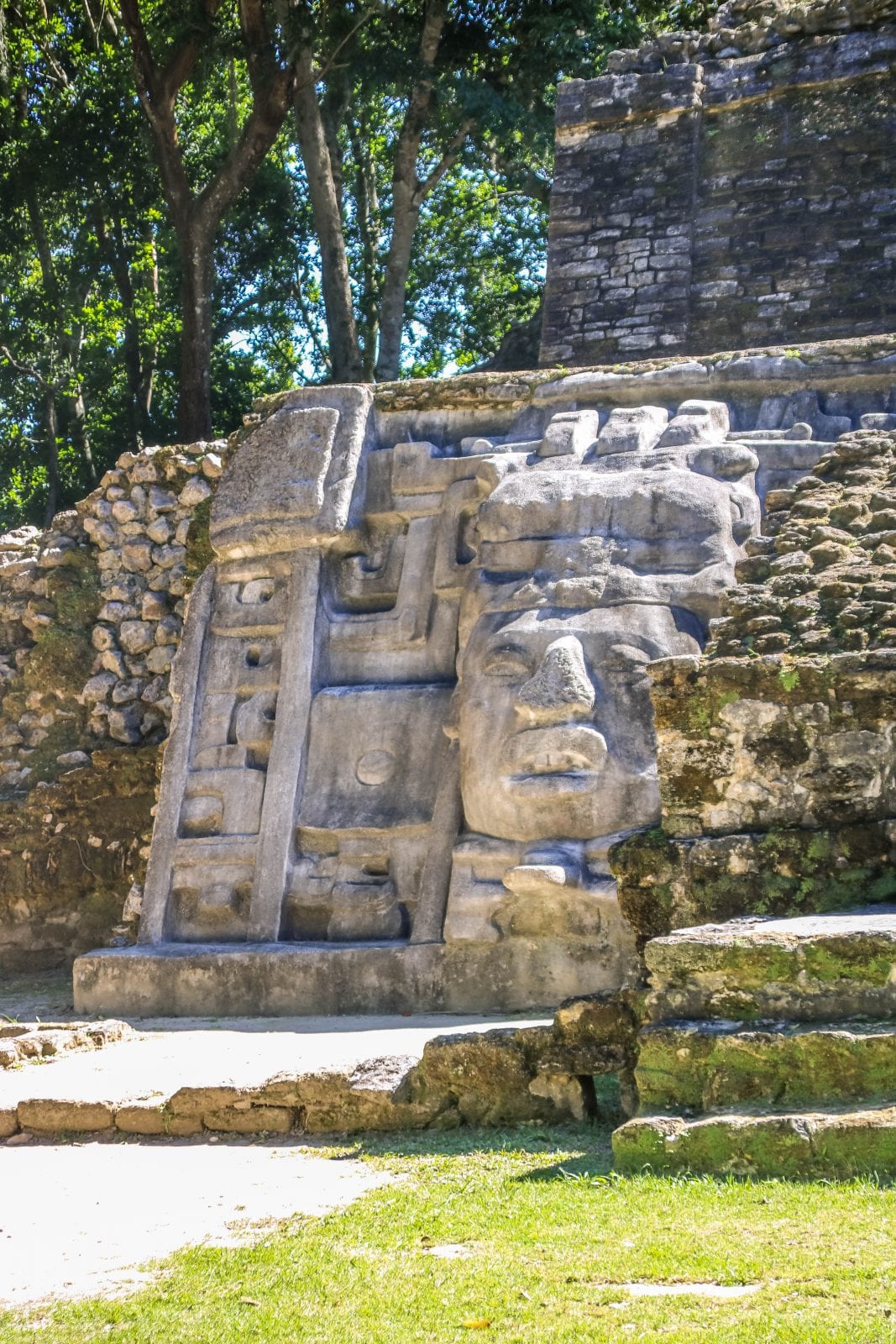 So mystisch der Mask-Tempel (200 v. Chr.) auch wirkt, siehst Du auf diesen Bildern nur eine Nachahmung aus Glasfaser. Die original etwa 4 Meter hohen Köpfe befinden sich allerdings dahinter. Der Mask-Tempel ist einer der kleinsten Tempelanlagen in Lamanai.