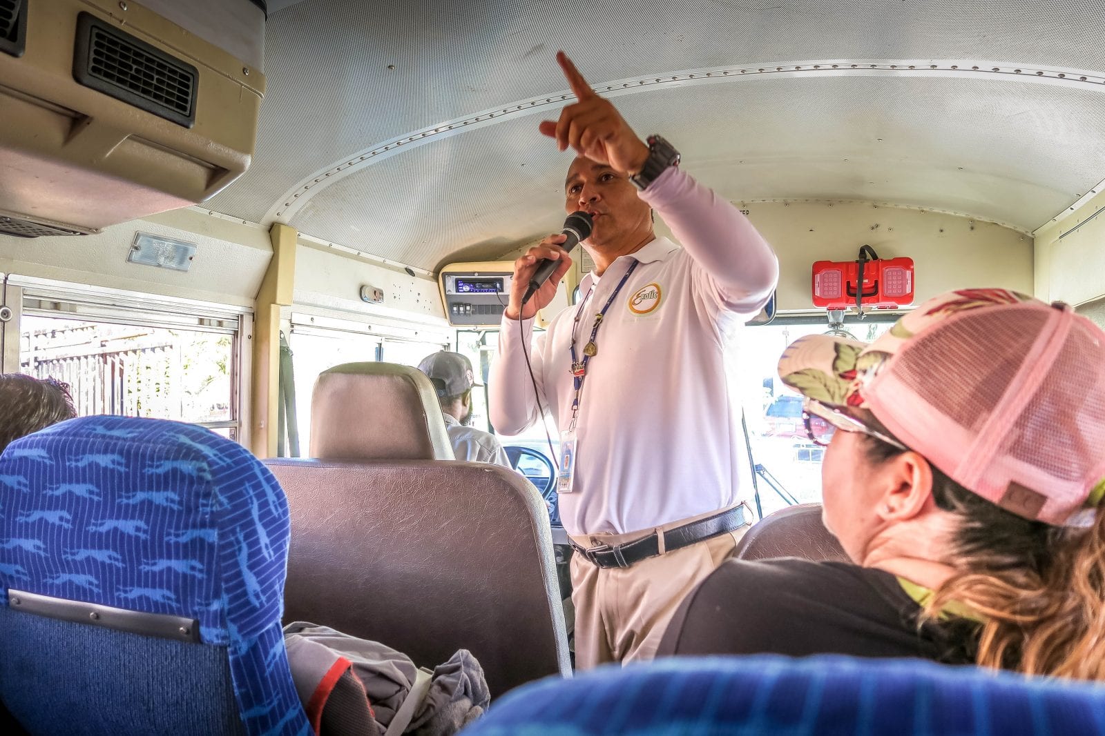 So verwundert es dann auch kaum, dass man stilecht mit einem alten liebevoll gepflegten amerikanischen Schulbus auf Reisen geht. Dass der Fahrer in seiner Mittagspause seine Pfeife raucht und dadurch immer gut gelaunt ist, versteht sich dabei von selbst. Auch wenn dieser immer gut gelaunt war, war sein Fahrstil sehr sicher und erinnerte nicht an Hoteltransfers in der Türkei.