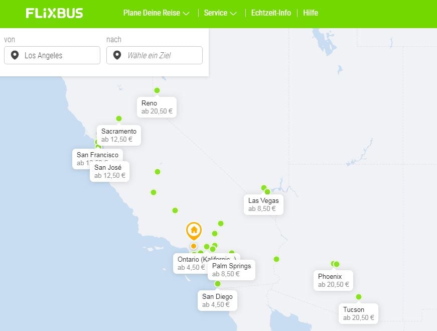 Screenshot von flixbus.de mit Verbindungen ab Los Angeles