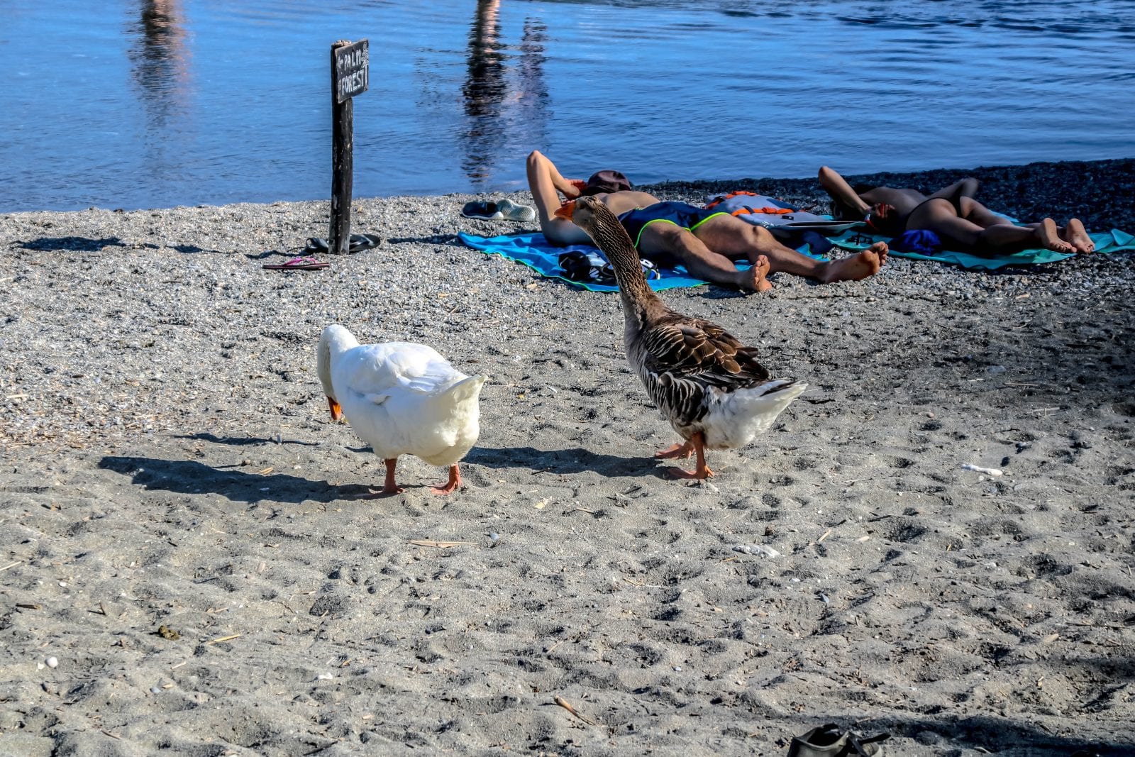 Der Strand wird von einer Gänsepolizei überwacht. In kleineren Gruppen patrouillieren die gefiederten Ordnungshüter und machen ihrem Unmut Ausdruck. Taschenkontrollen und Platzverweise gibt es am laufenden Band.