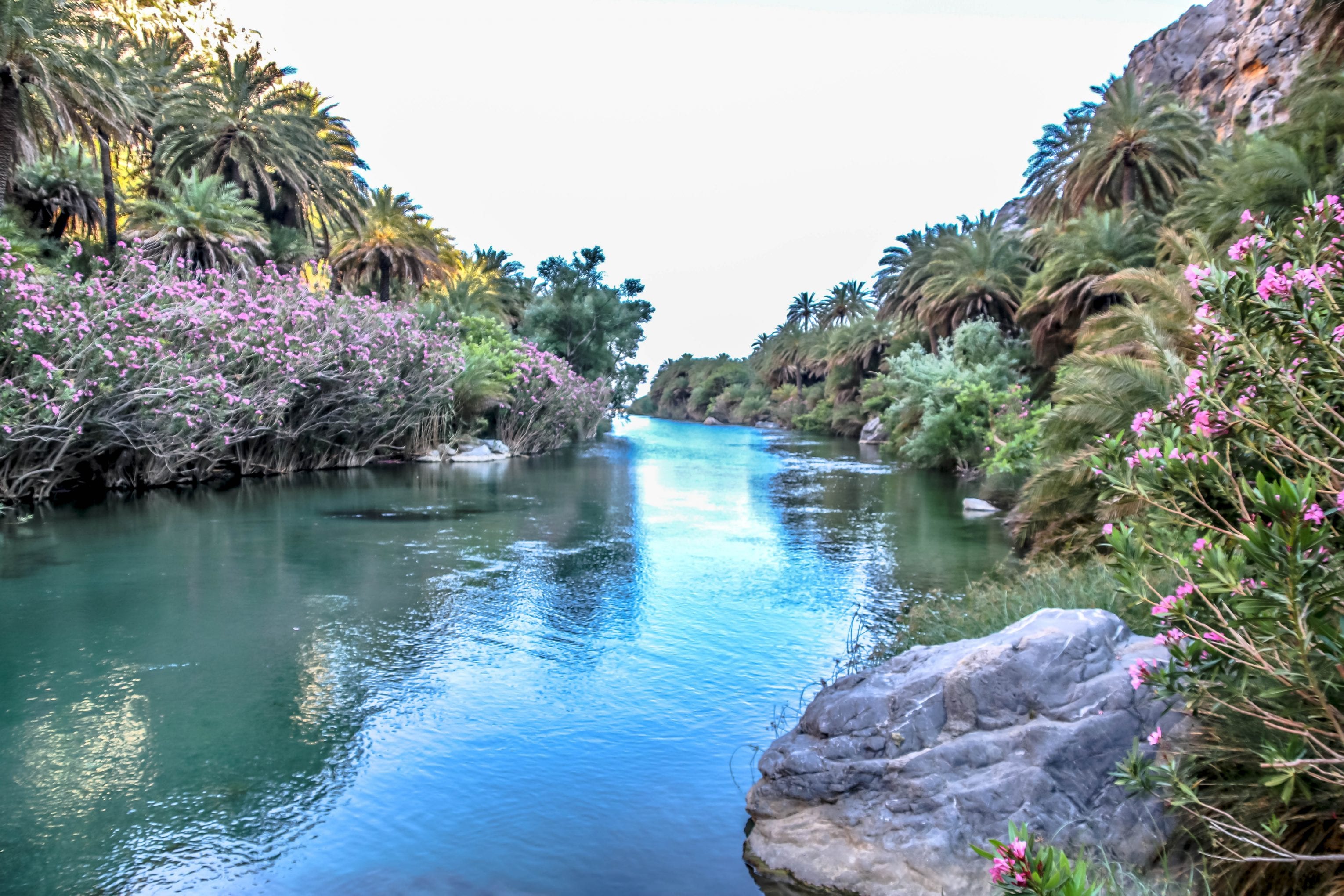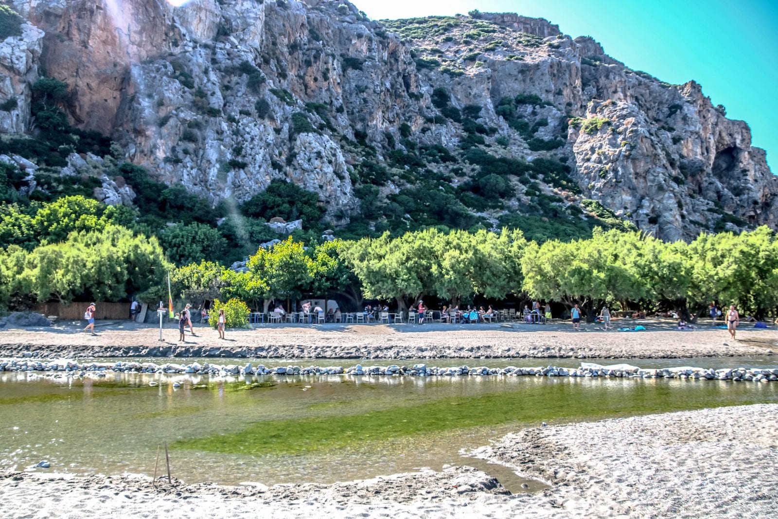 Um an den eigentlichen Strand zu kommen, musst Du zunächst durch den flachen Fluss waten. Das Meer an Kretas Südseite ist aber auch abends noch lau warm. Der Weg lohnt sich auf jeden Fall. Ein wirklich außergewöhnlicher Palmenstrand in Europa.