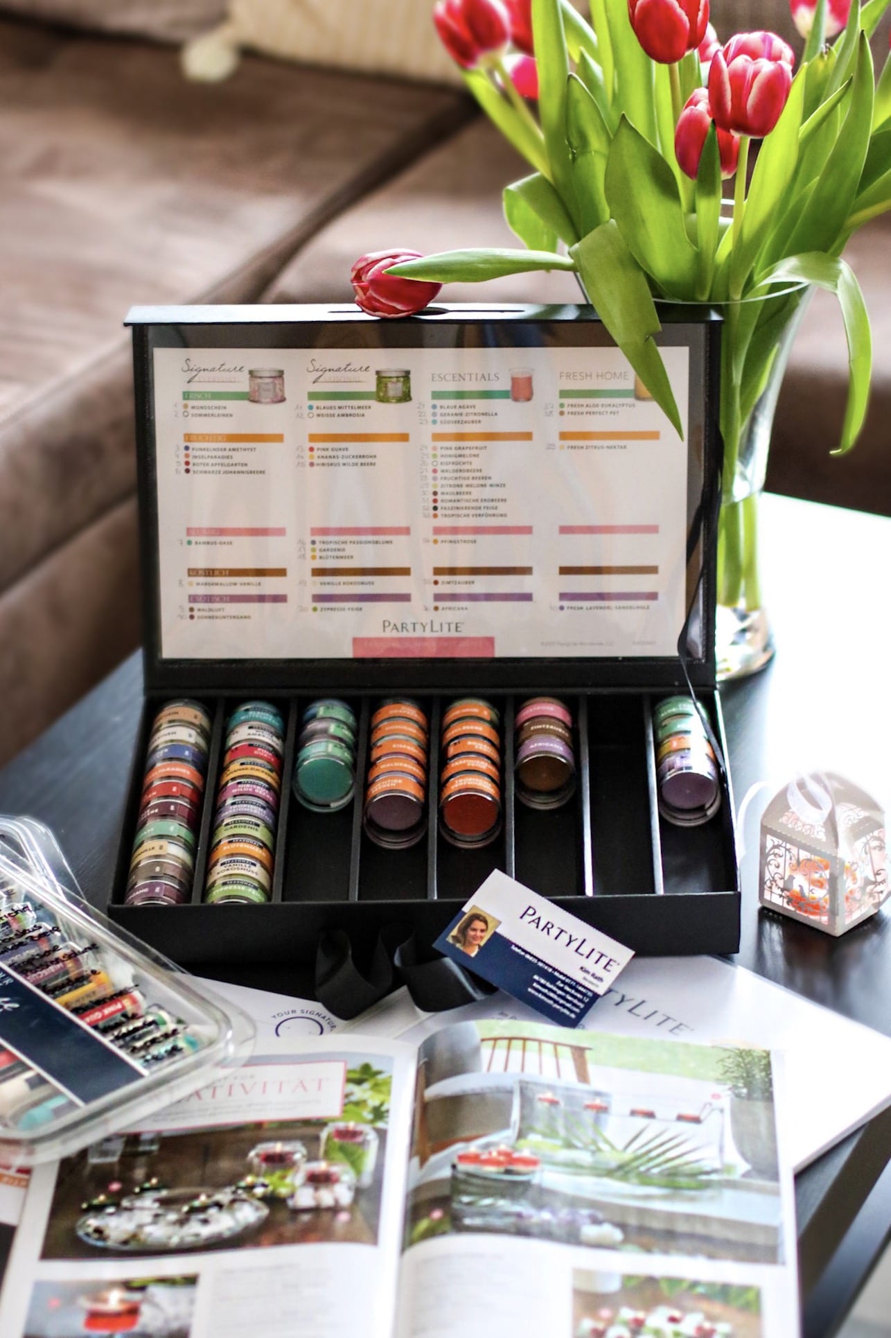 Wenn Du dieses bei ihr bestellst, dann kommt schon nach kurzer Zeit ein ganzes Verwöhnpaket bei Dir daheim vorbei. Kim schickt Dir ein Paket, in dem Du alle aktuellen Düfte ausprobieren und Deine Lieblingsdüfte auswählen kannst. Natürlich ist auch der PartyLite Katalog mit im Gepäck und Du kannst Dir auch die anderen Produkte ganz gemütlich von zu Hause aus ansehen.