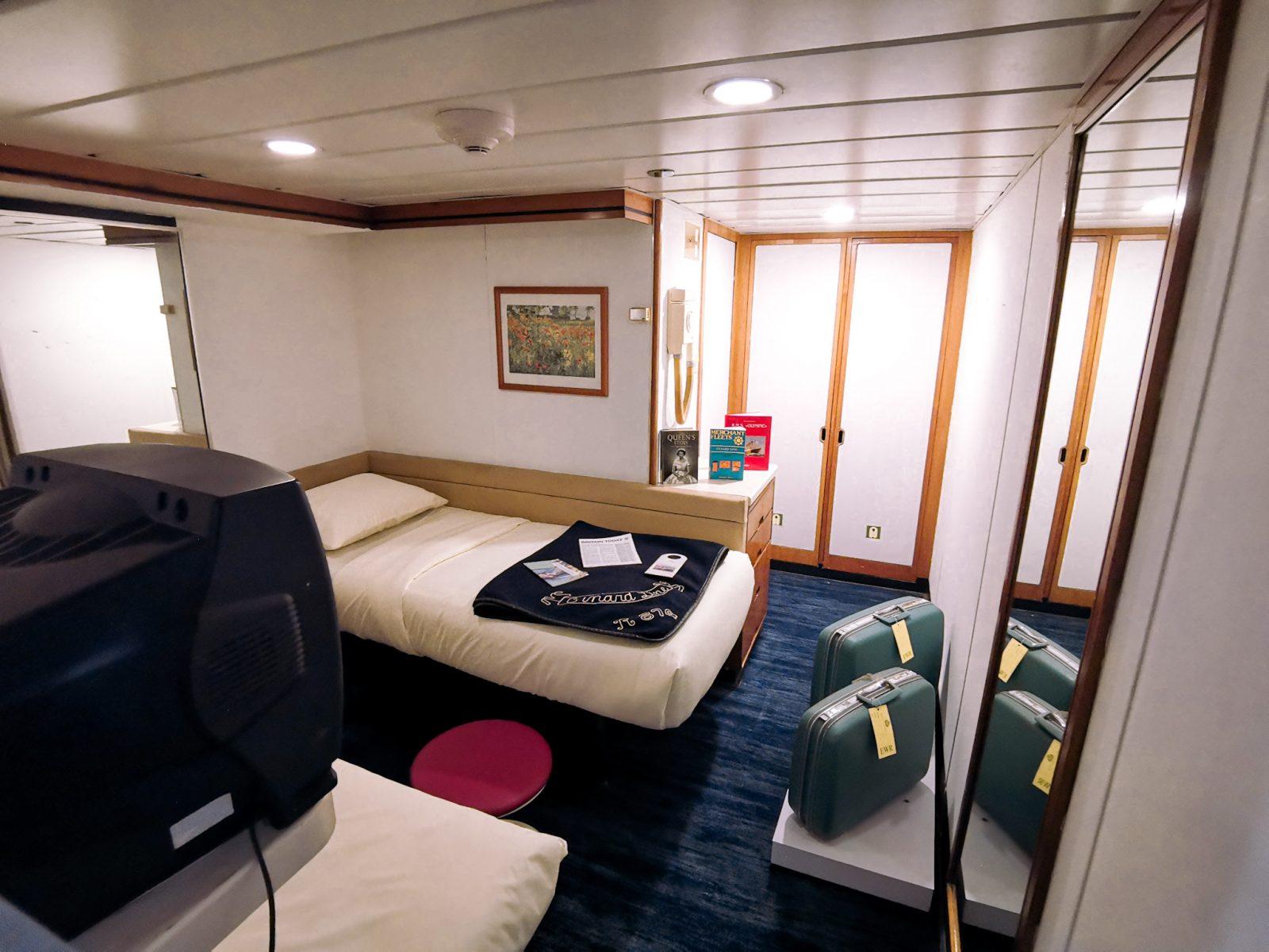 Diese noch im Originalzustand befindliche Innenkabine würde heutzutage niemanden mehr vom Hocker reißen. Nun stell Dir vor, dass Du hierfür für Dich und Deinen Partner mindestens 8000 Pfund bezahlen musstest, um die letzten Tage der Queen Elizabeth 2 zu erleben.