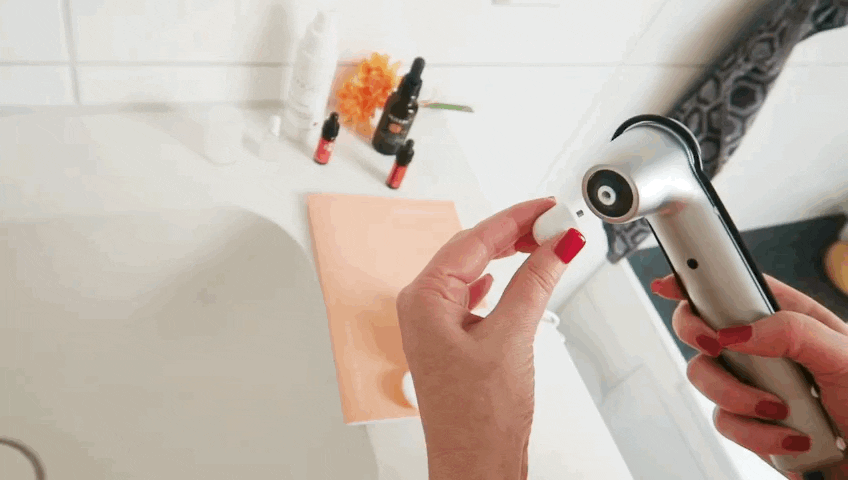Bevor es los geht, am besten Ohrringe oder Ohrstecker ablegen. Denn bei der Berührung mit den Aufsätzen ensteht ein Geräusch, was einem eventuell erschrecken kann. Damit die Gesichtsmuskulatur bei der Behandlung schön entspannt ist, Zähne nun locker aufeinander und die Zunge an den Gaumen legen.