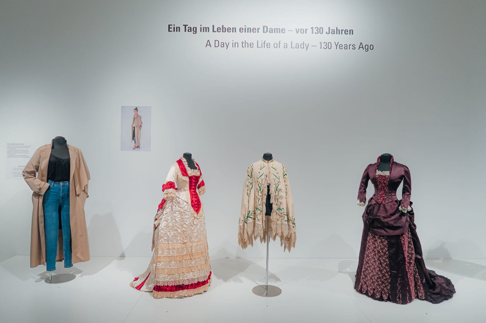 Mode verrät also nicht nur viel über seine Träger sondern ist auch ein interessantes Abbild für die jeweilige Zeitepoche. Genau hier setzt auch die Ausstellung “Um angemessene Kleidung wird gebeten” des Stadtmuseums Simeonstift Trier an und zeigt in chronologischer Abfolge ab 1770, in teilweisen prachtvollen Roben, von Stadtion zu Station die verschieden Zusammenhänge und Entwicklungen der jeweiligen Ära.