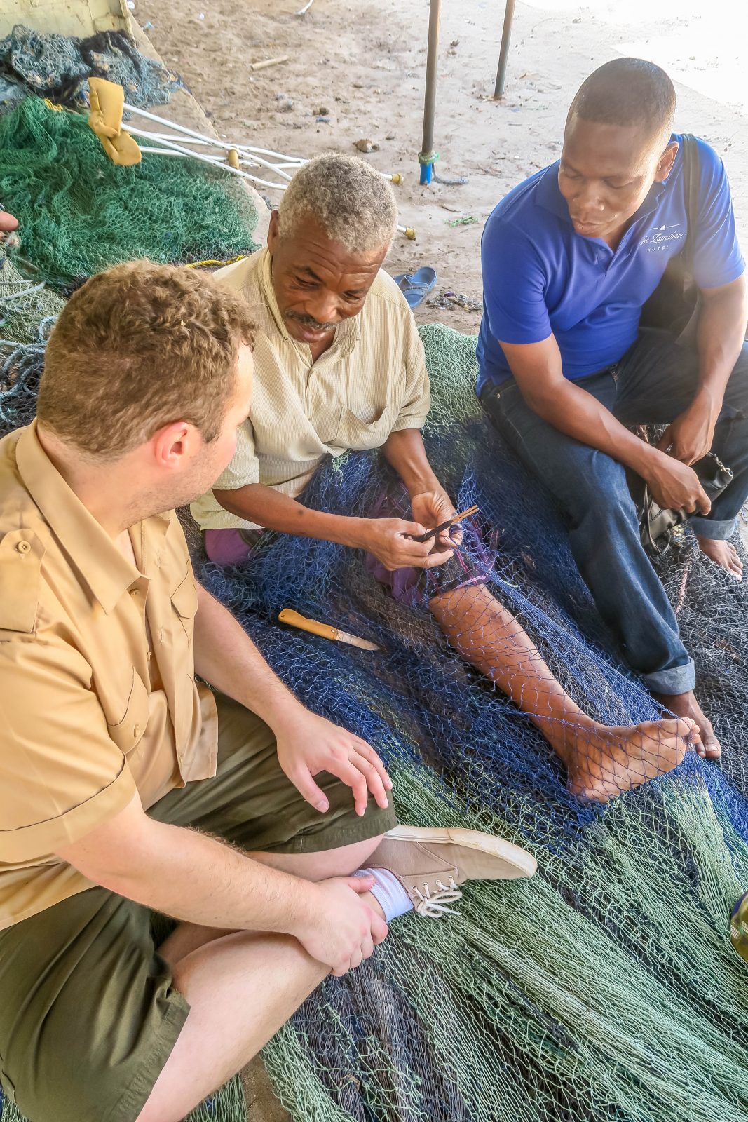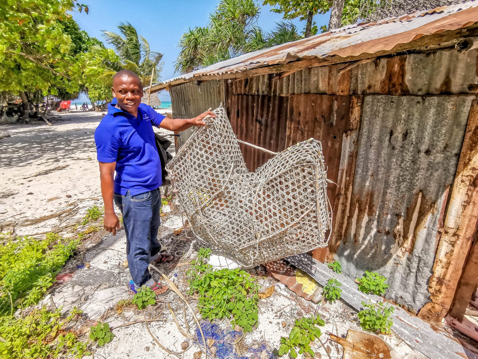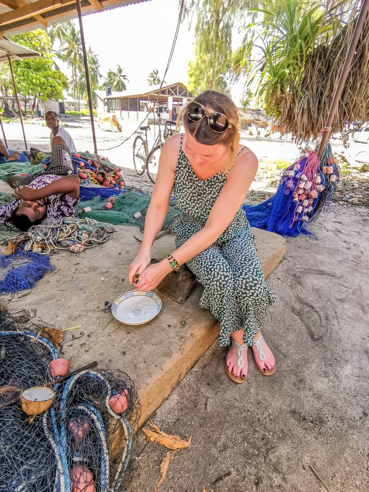 Bevor ich mein handwerkliches Geschick unter Beweis stellen musste, war Petra dran. Sie musste diverse Flechtmuster herstellen. Letztlich sollte sie auch noch eine große Handtasche zusammennähen. Das erwies sich als gar nicht so einfach. Auch das Zaubertuch änderte daran nur wenig… In unserem Hotel The Zanzibari findest Du übrigens viele dieser Handwerkserzeugnisse. Das Hotel legt nämlich großen Wert auf lokale Lieferanten.