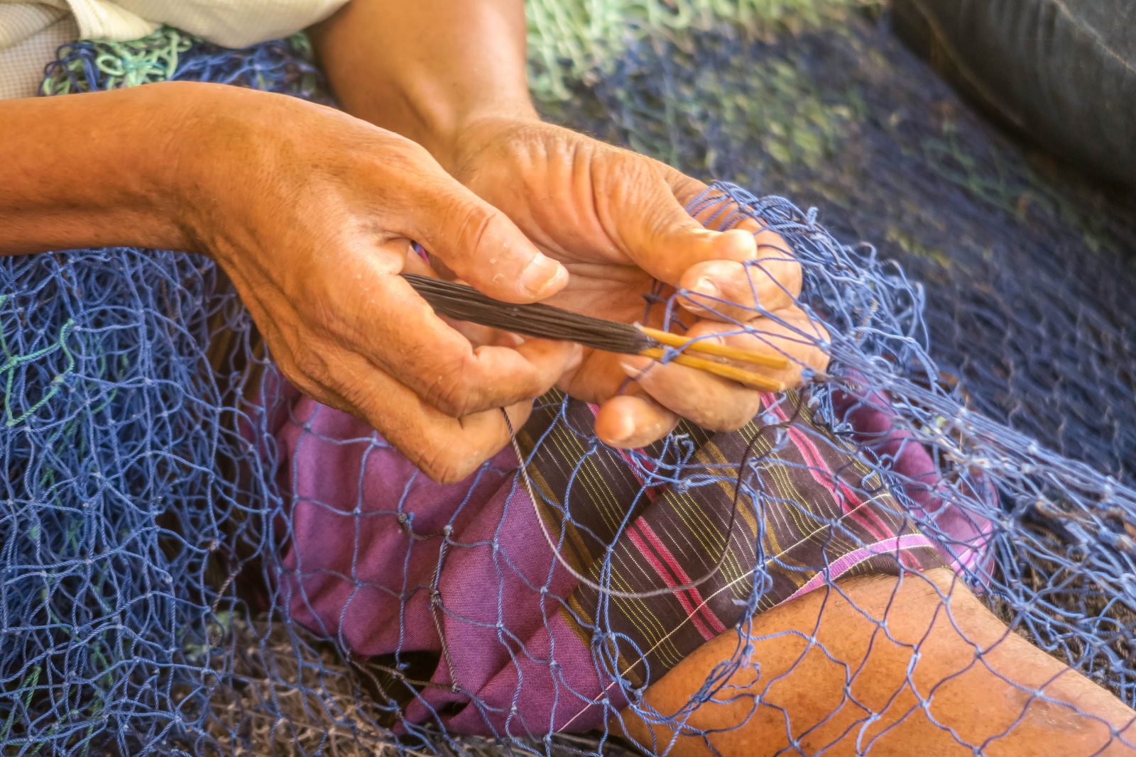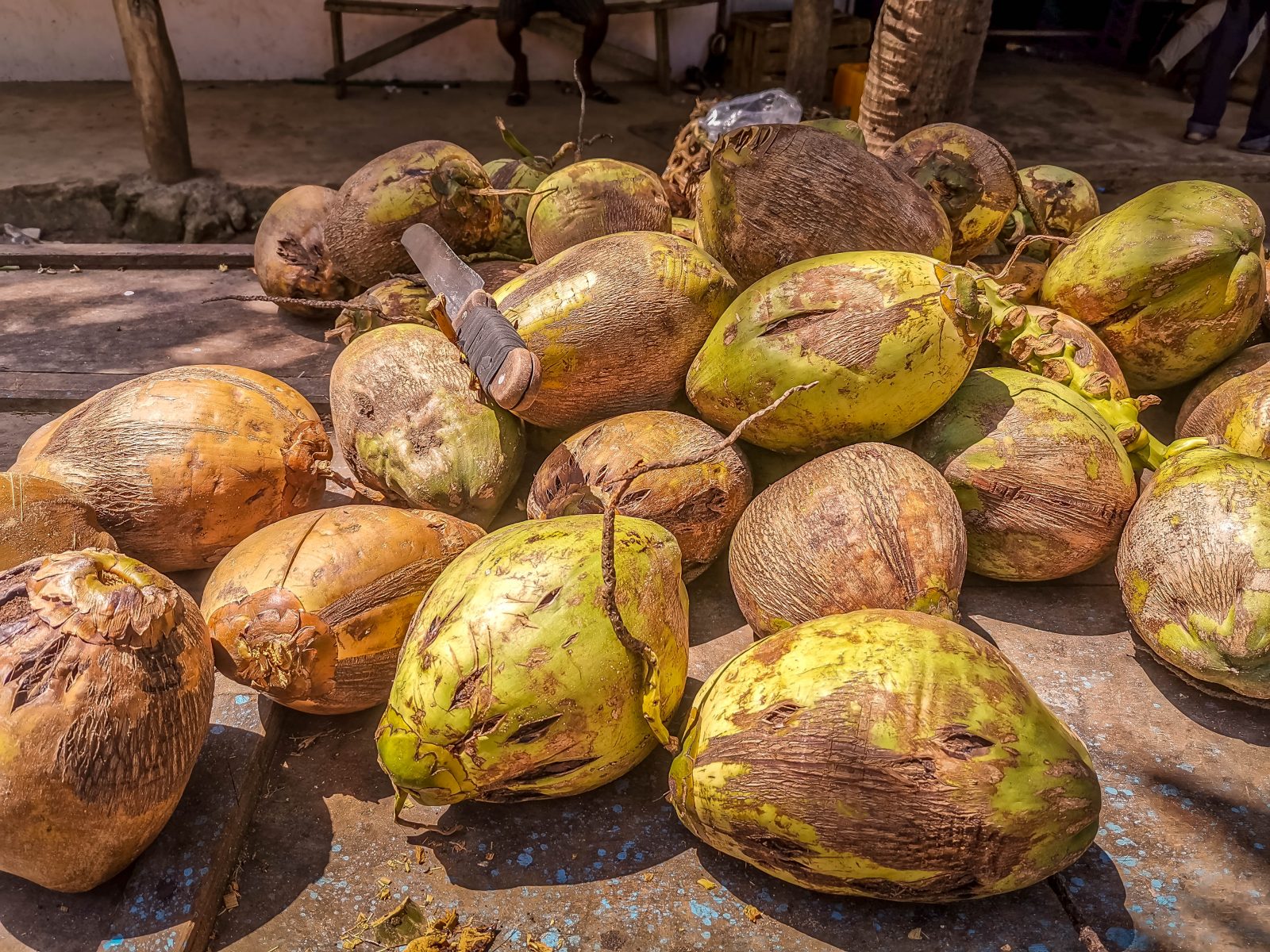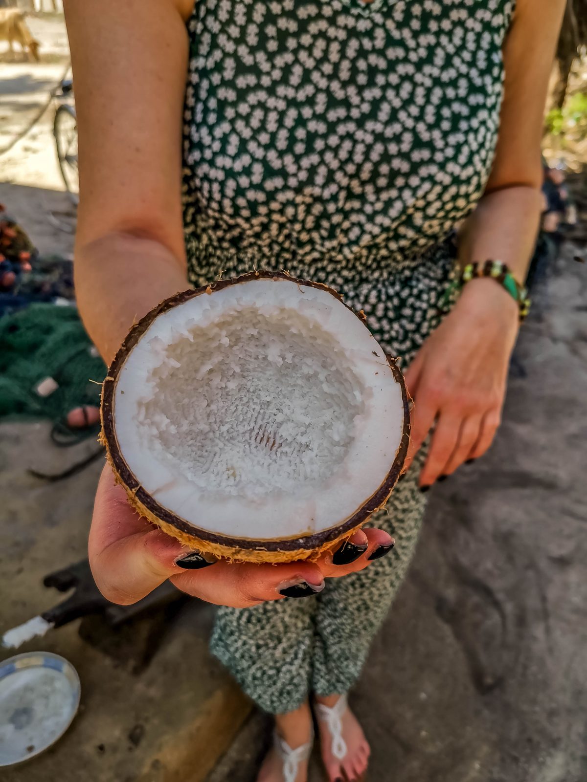 Während ich vergeblich versuchte, ein Netz zu flicken, musste Petra in der örtlichen Fischerkantine Kokosnüsse raspeln. Danach ging es weiter ins Dorf.