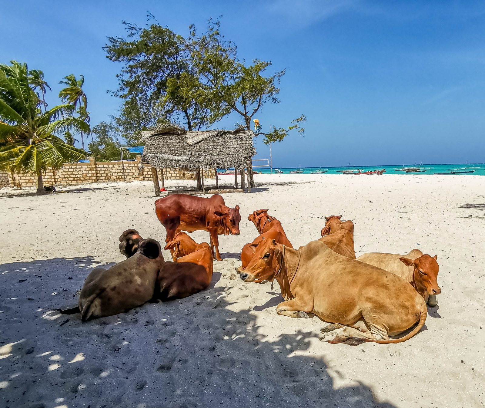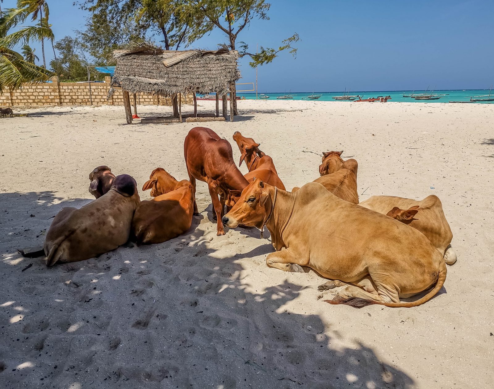 Dass es auf Barbados Schweine am Strand gibt, weiß inzwischen jeder, aber dass es Kühe am Strand gibt und das auch noch freilaufend auf Sansibar?! Das Buckelrind (Zebu) kann hier mit seinen Kälbern gemütlich am Strand liegen und spazieren. Durch den Buckel ist es jedoch auch für einen mittelalterlichen Ochsenkarren prädestiniert. So findest Du diese Rinder auch häufig vor Ochsenkarren gespannt.