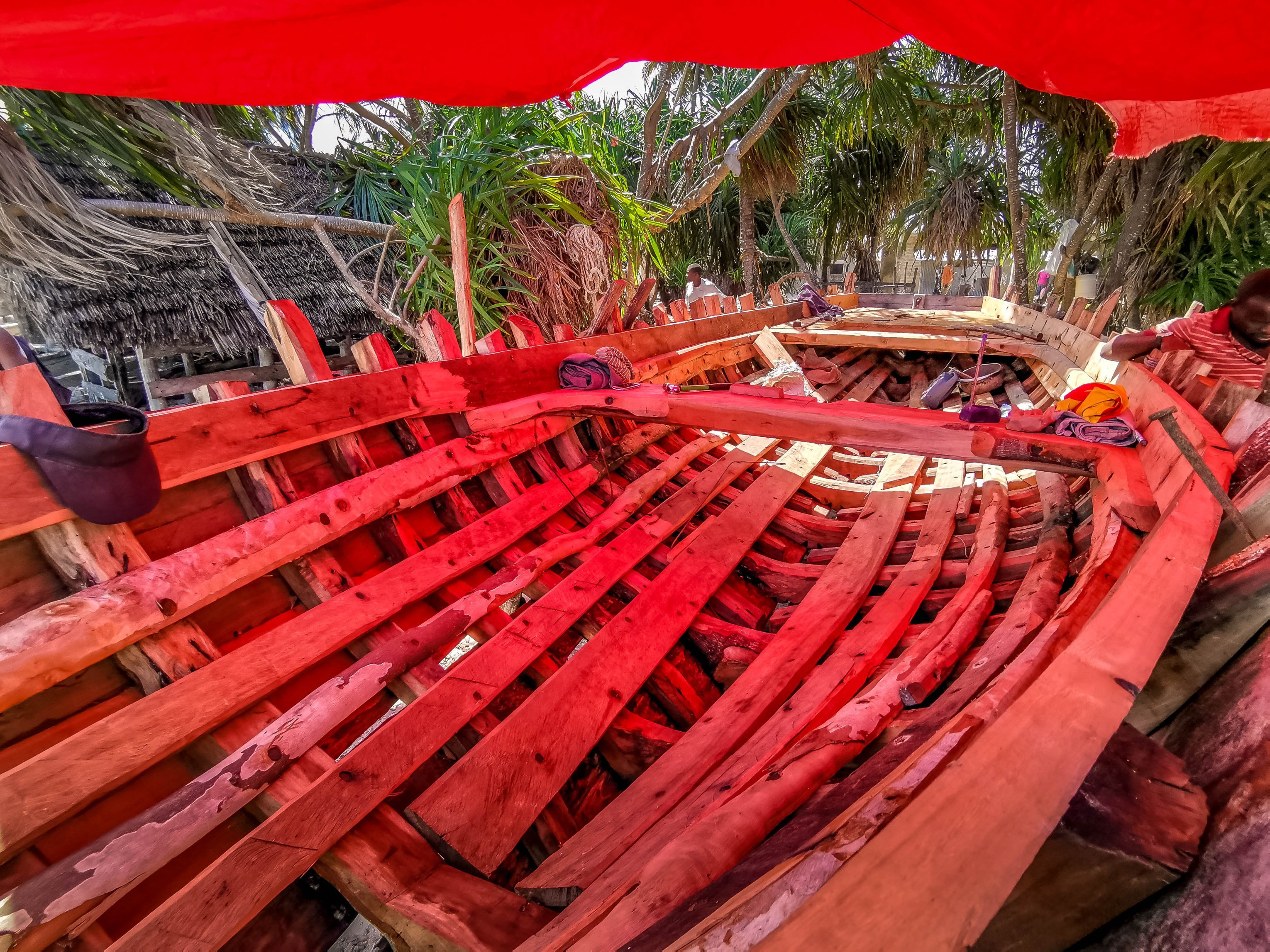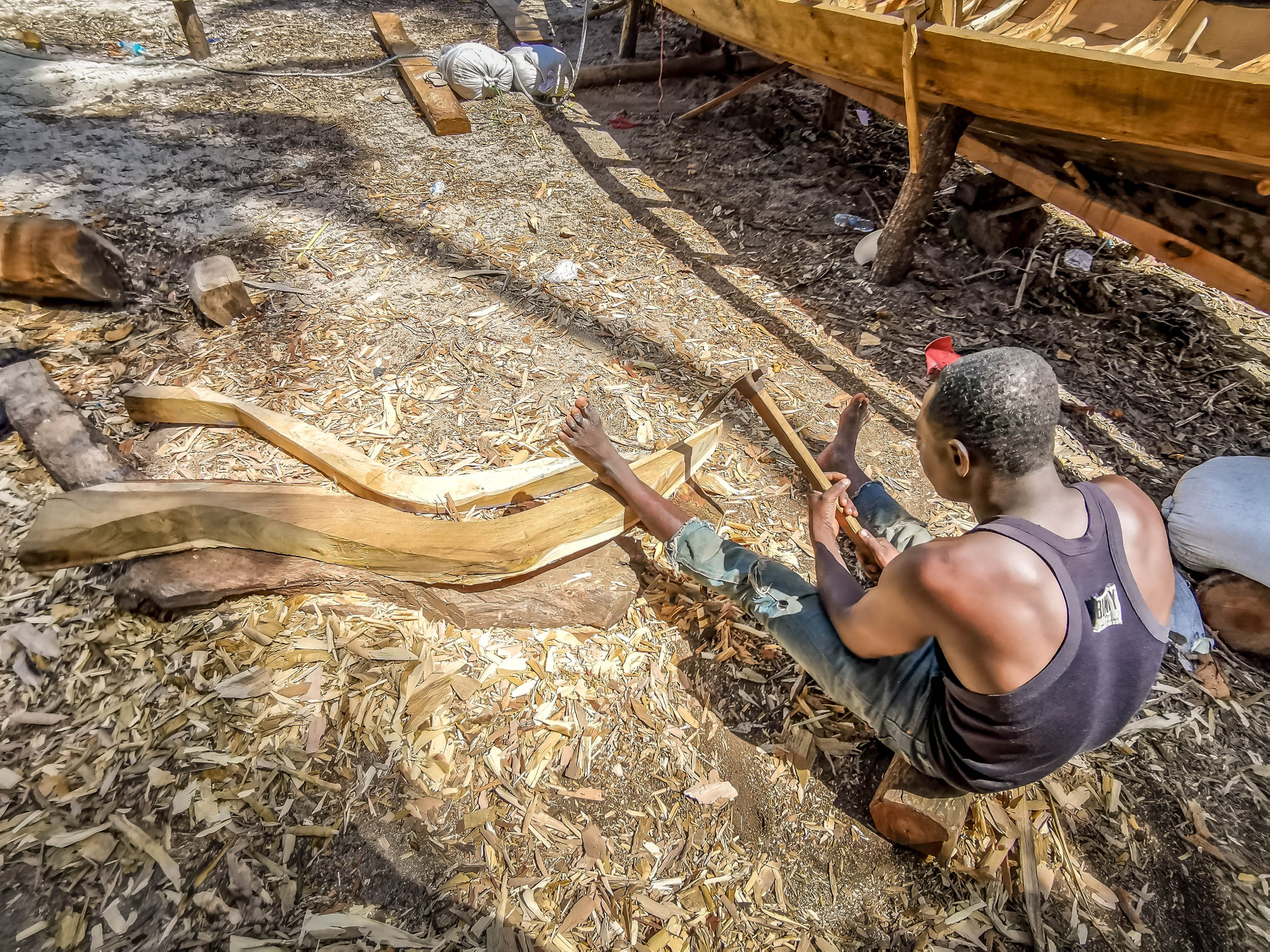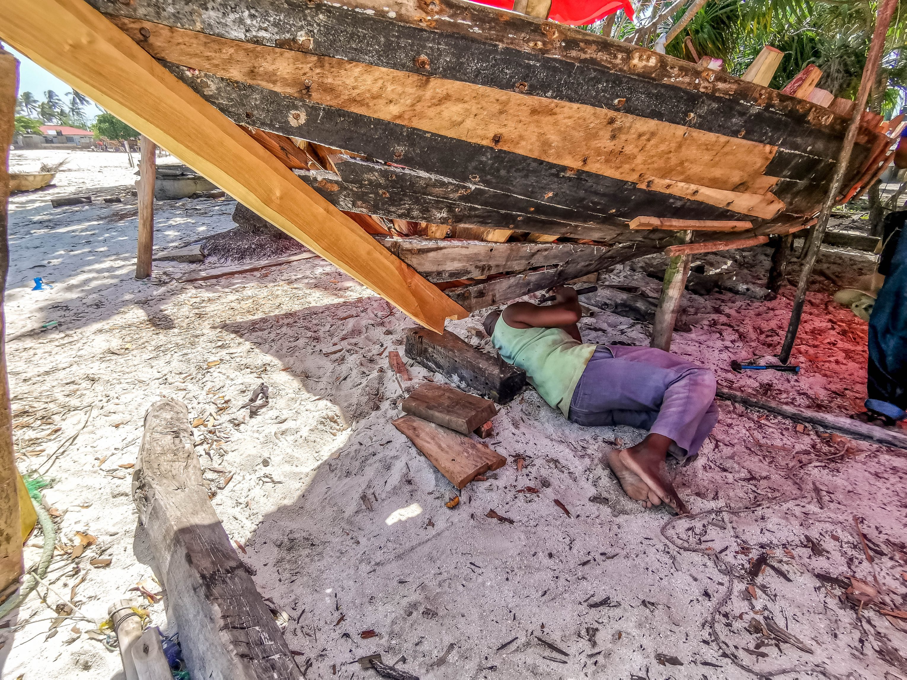 Die Werft am Strand dient sowohl zum Neubau als auch zur Werkstatt. Generell werden selbst bei einem Neubau möglichst viele alte Bauteile verwendet. Dies sieht man besonders gut an den Nägeln. Es ist faszinierend, mit welchen Mitteln die Bootsbauer ein so stabiles Schiff bauen. Das sehr harte Holz wird lediglich mit Hacken in Form gebracht. Das natürlich komplett ohne Messinstrumente, die Bootsbauer verlassen sich rein auf ihr Augenmaß und das ist sehr genau. Von außen sieht das Boot so aus, als hätte man eine vorgegebene Grundform, die letztlich mit lauter Holz-Puzzleteilen zusammen geschustert wird. Und eins muss man sagen, die Boote sind seetauglich. Aber das erfährst Du demnächst hier.