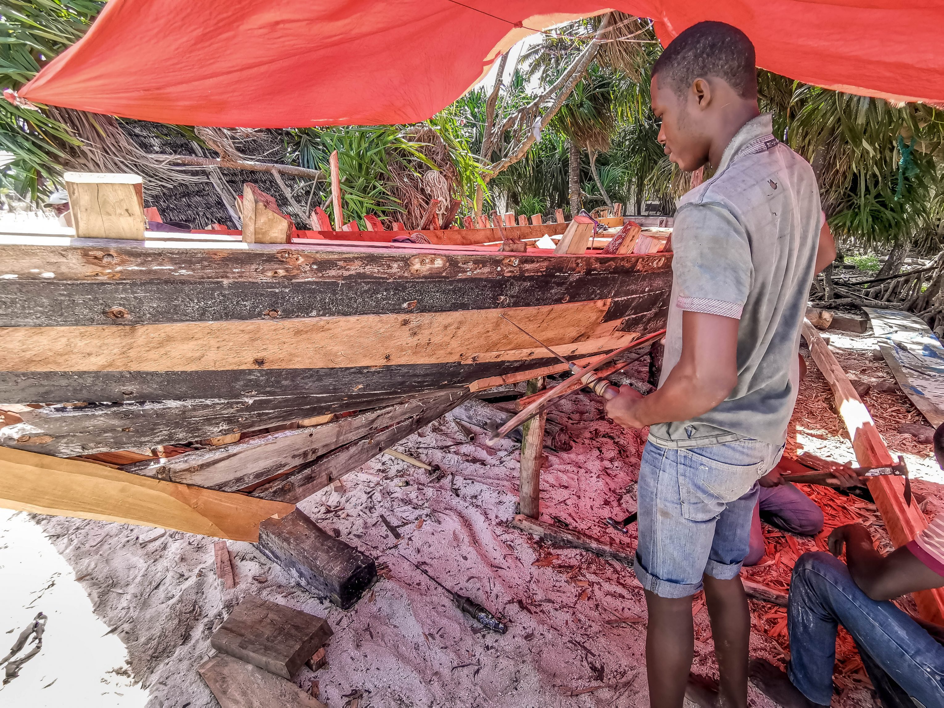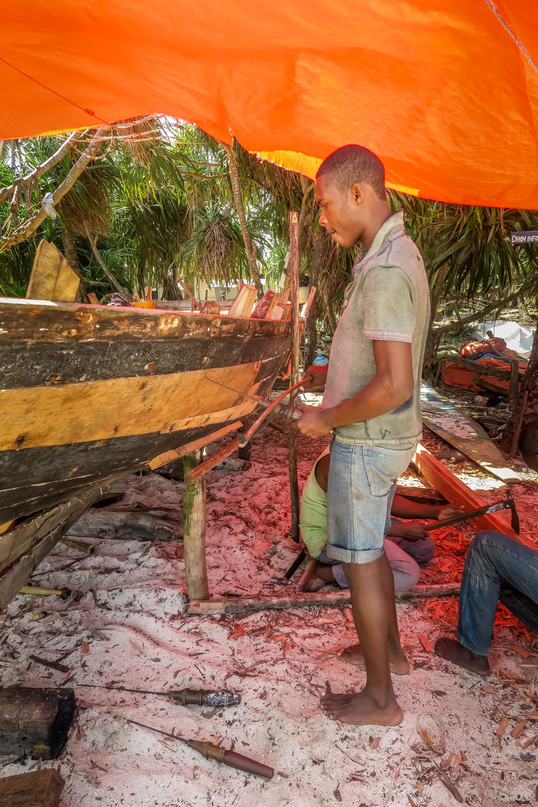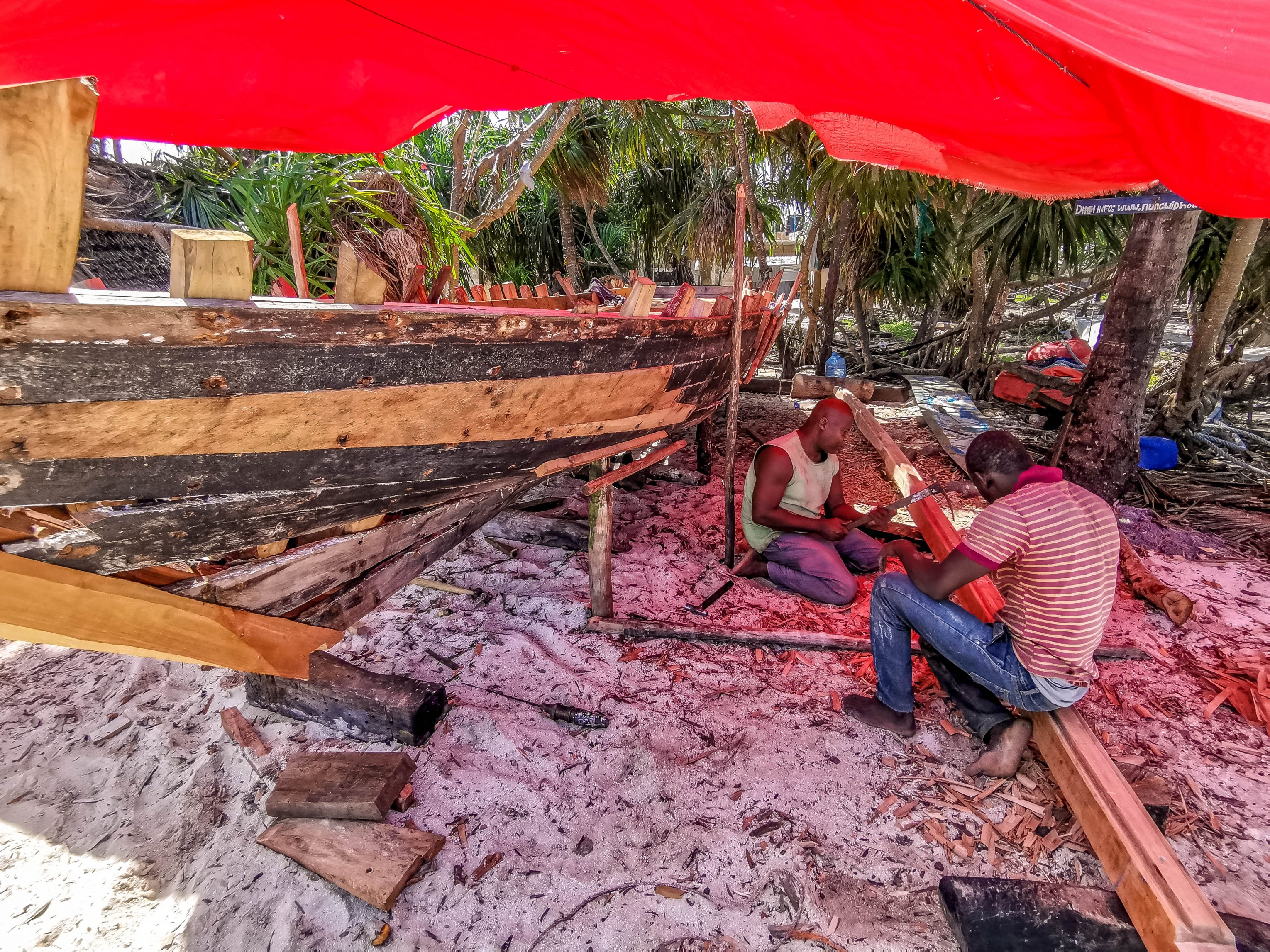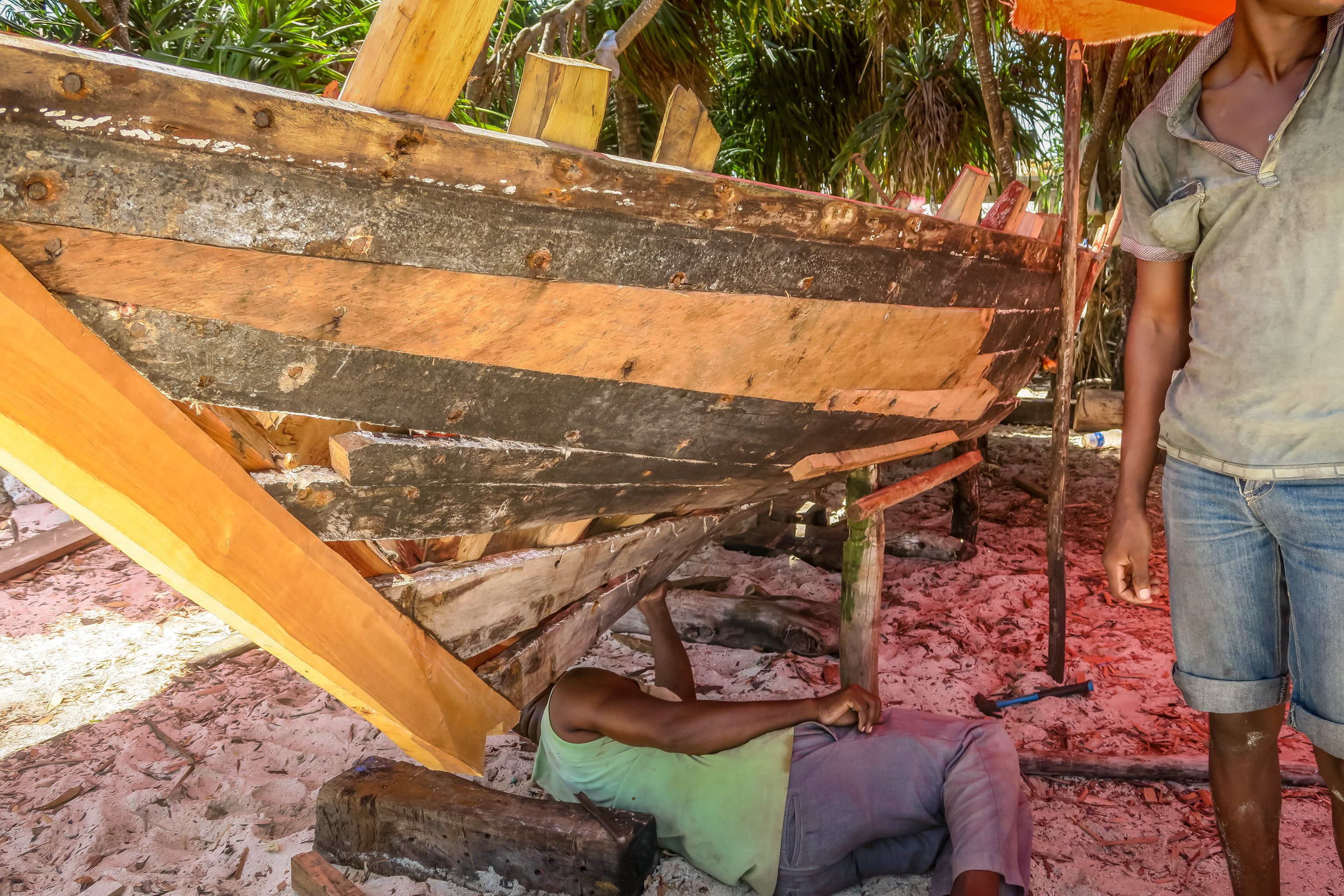Die Werft am Strand dient sowohl zum Neubau als auch zur Werkstatt. Generell werden selbst bei einem Neubau möglichst viele alte Bauteile verwendet. Dies sieht man besonders gut an den Nägeln. Es ist faszinierend, mit welchen Mitteln die Bootsbauer ein so stabiles Schiff bauen. Das sehr harte Holz wird lediglich mit Hacken in Form gebracht. Das natürlich komplett ohne Messinstrumente, die Bootsbauer verlassen sich rein auf ihr Augenmaß und das ist sehr genau. Von außen sieht das Boot so aus, als hätte man eine vorgegebene Grundform, die letztlich mit lauter Holz-Puzzleteilen zusammen geschustert wird. Und eins muss man sagen, die Boote sind seetauglich. Aber das erfährst Du demnächst hier.