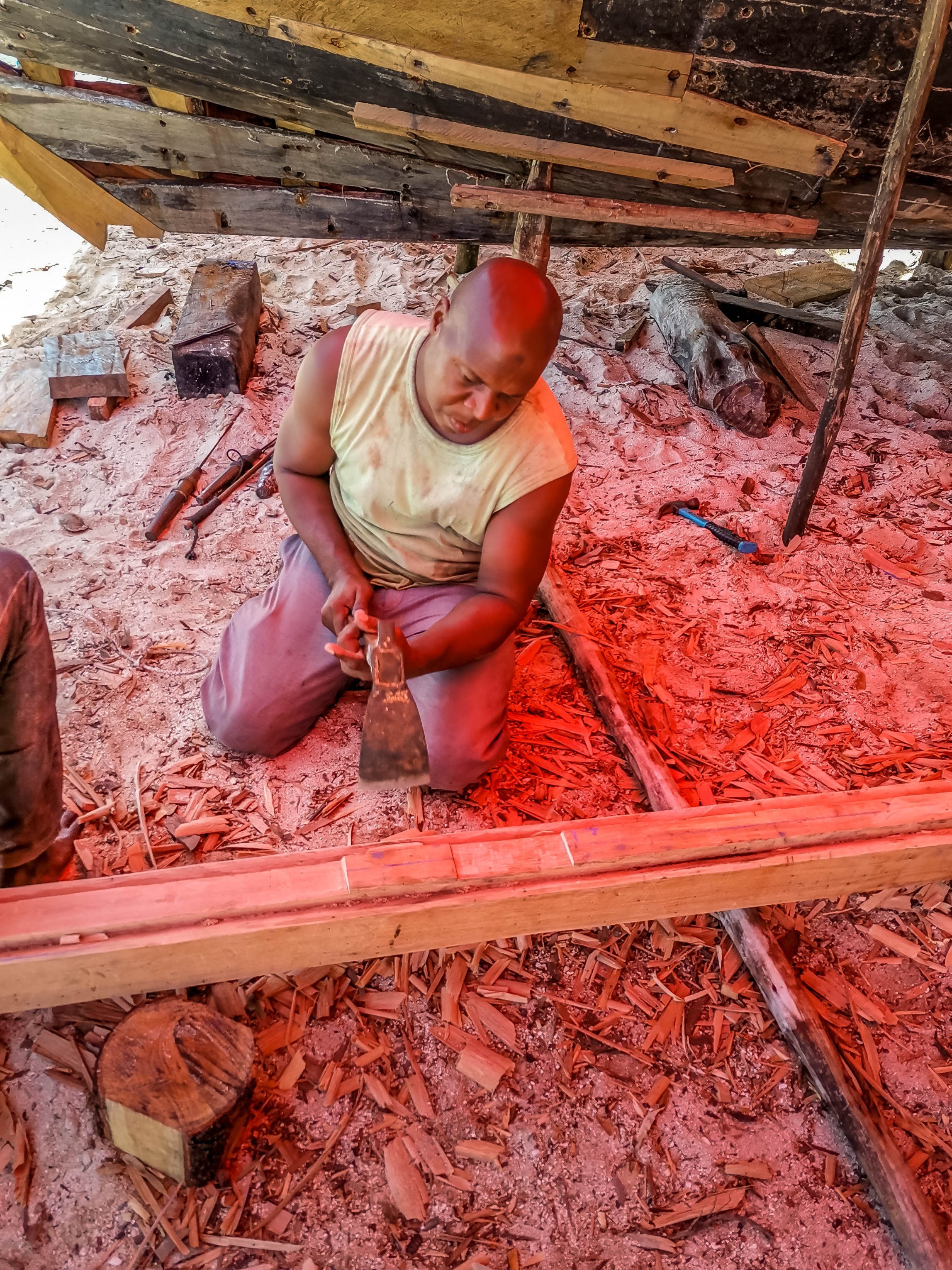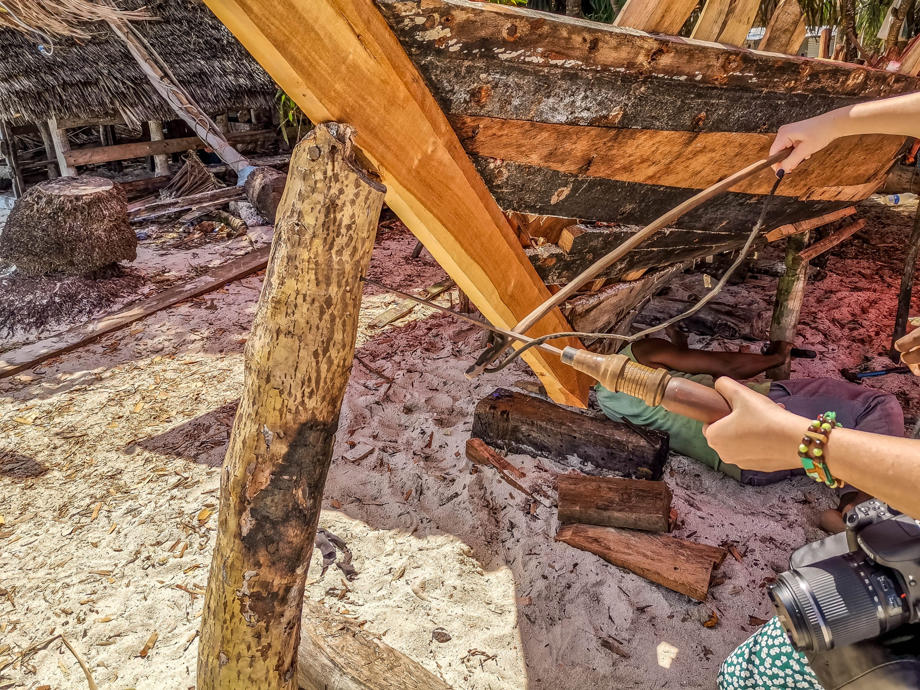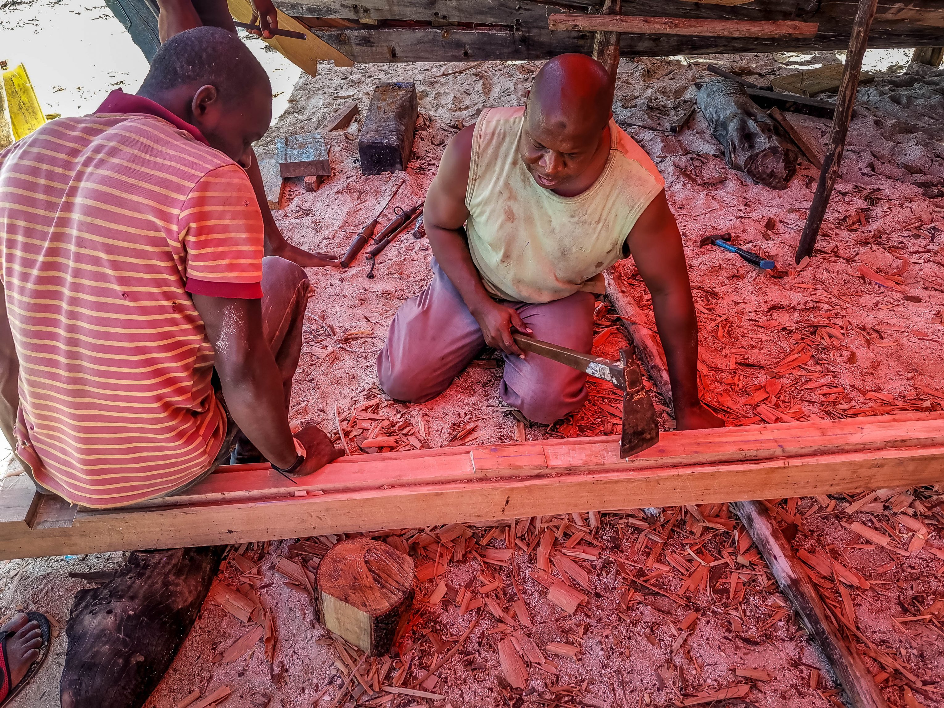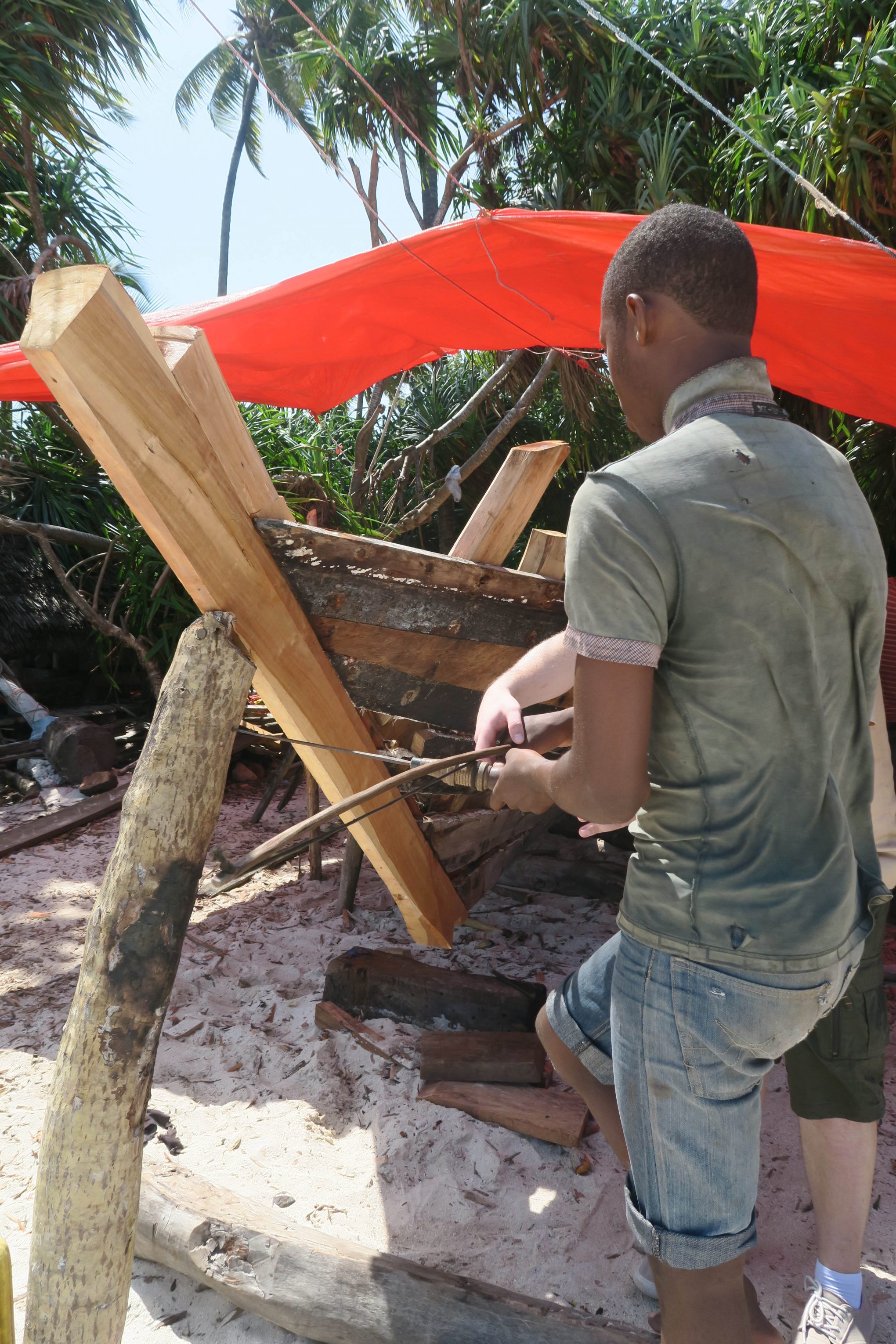 Während der Tour versucht Nzori ständig, seine Gäste in die Alltagstätigkeiten einzubinden. Dabei ließ er mich einen langen Nagel einhämmern, was kein Problem war. Allerdings hatte ich so meine Schwierigkeiten mit der Handbohrmaschine. Es funktionierte einfach nicht. Das Bohren ist zwingend notwendig um die langen Nägel in das Holz zu schlagen. Da das Holz sehr hart ist, würde es ansonsten reißen.
