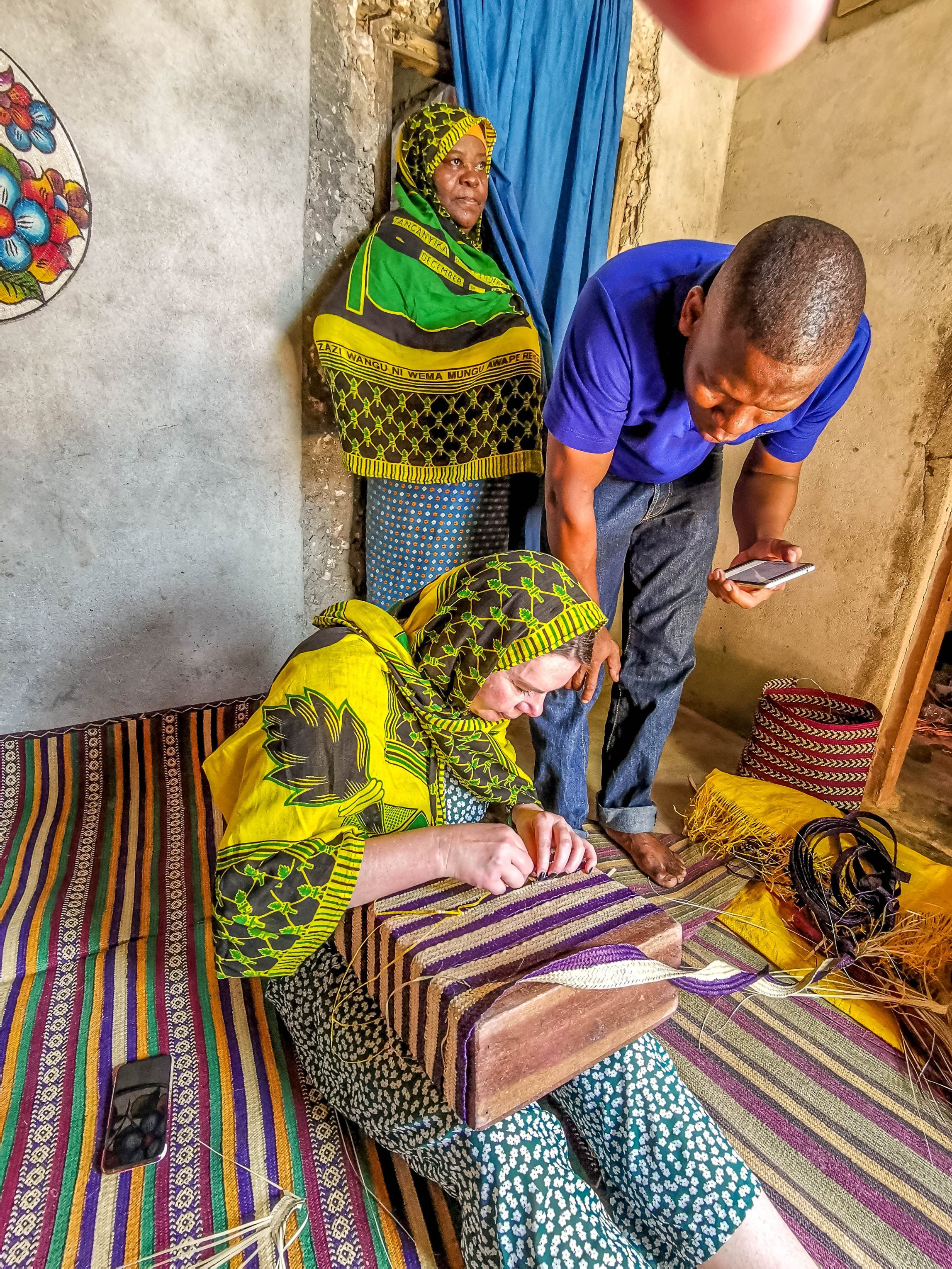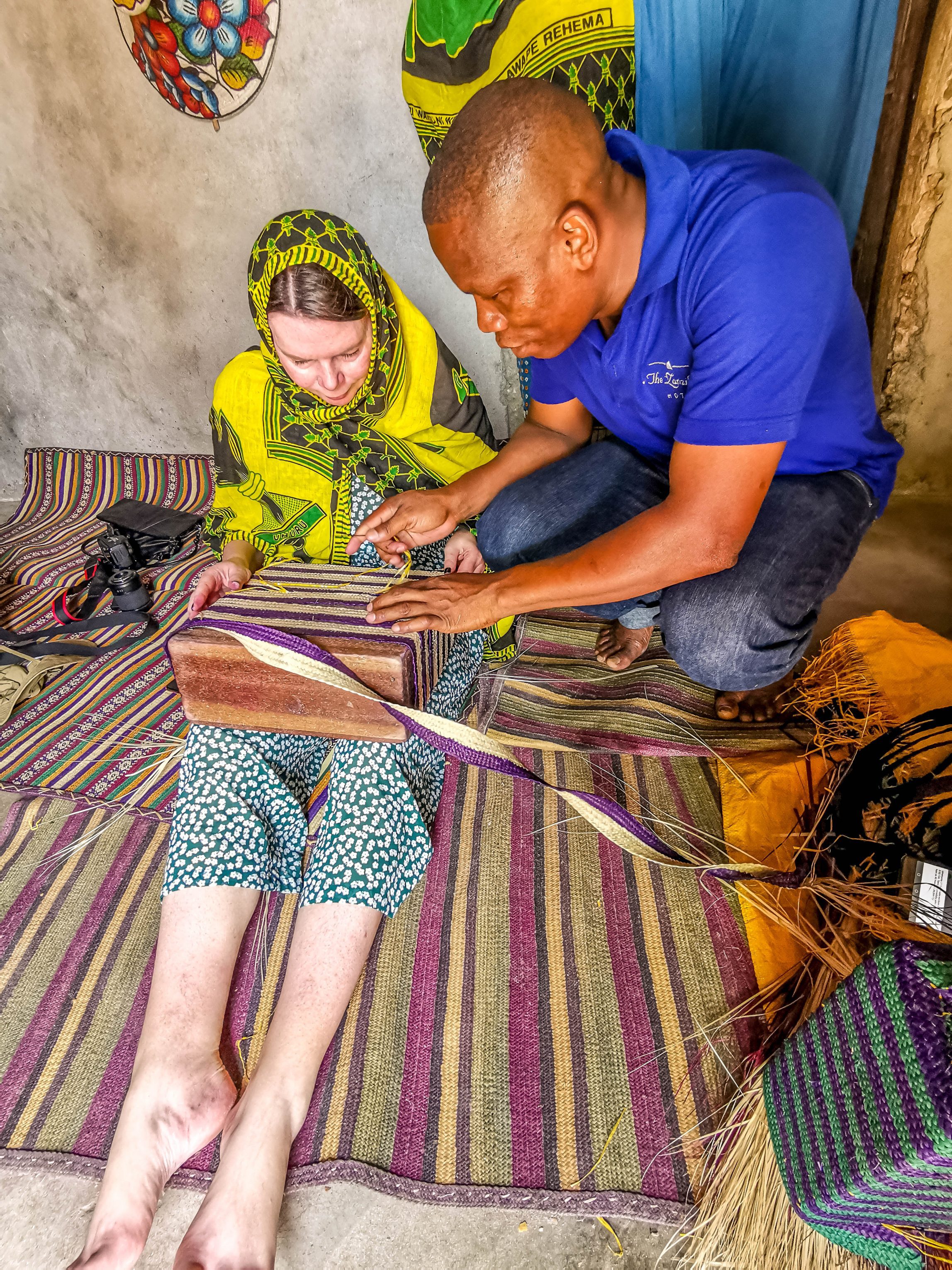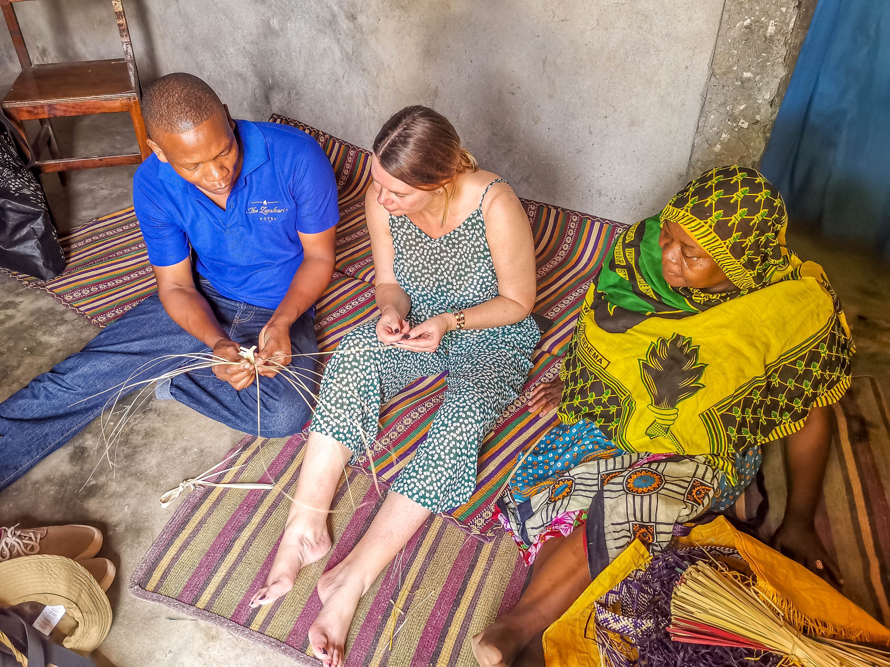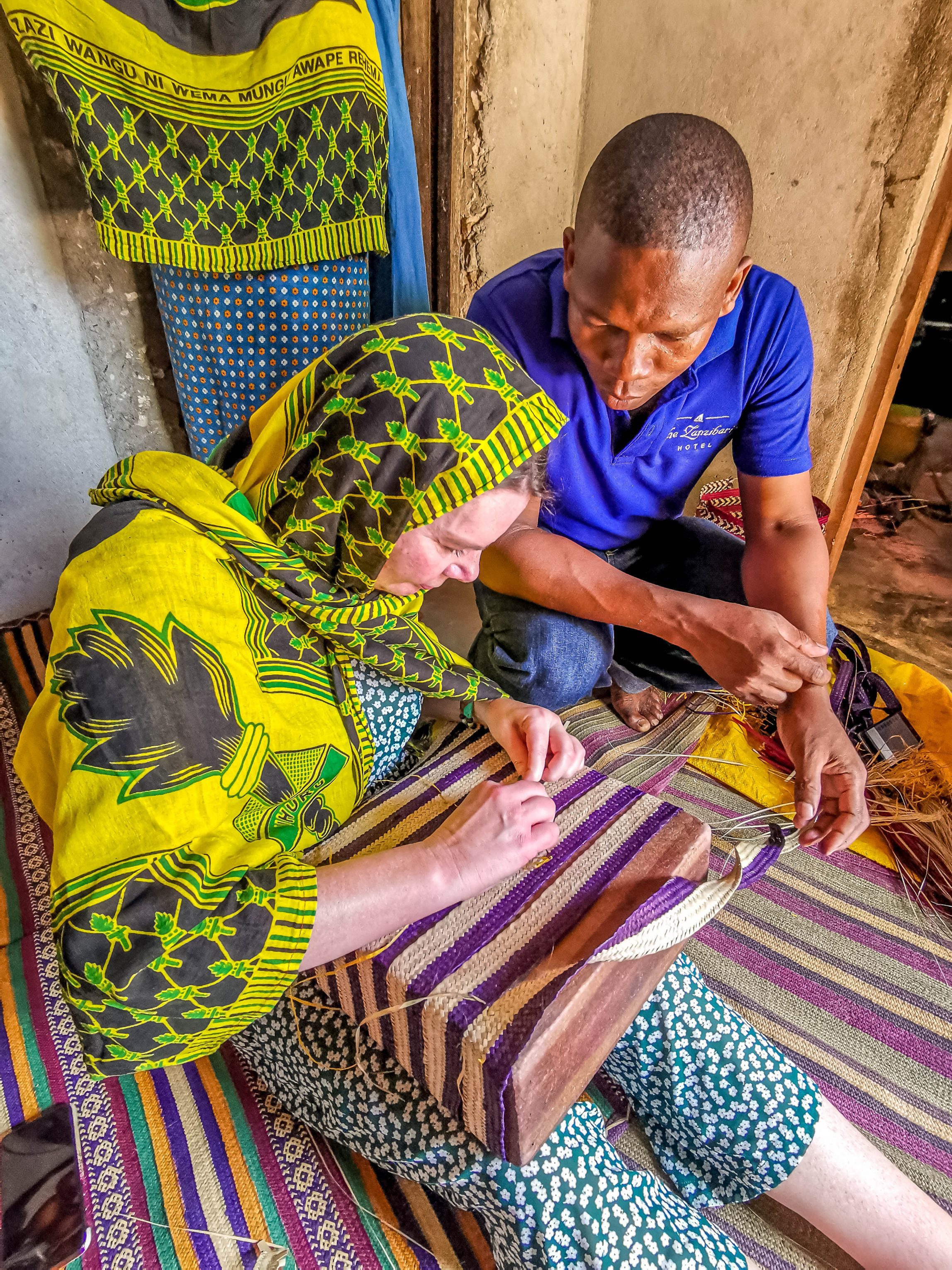 Bevor ich mein handwerkliches Geschick unter Beweis stellen musste, war Petra dran. Sie musste diverse Flechtmuster herstellen. Letztlich sollte sie auch noch eine große Handtasche zusammennähen. Das erwies sich als gar nicht so einfach. Auch das Zaubertuch änderte daran nur wenig… In unserem Hotel The Zanzibari findest Du übrigens viele dieser Handwerkserzeugnisse. Das Hotel legt nämlich großen Wert auf lokale Lieferanten.
