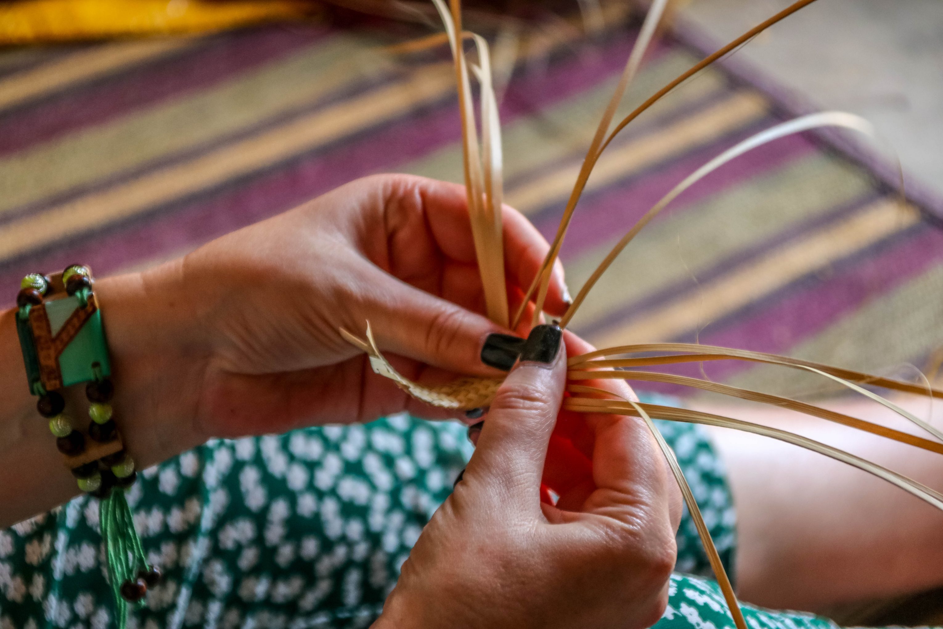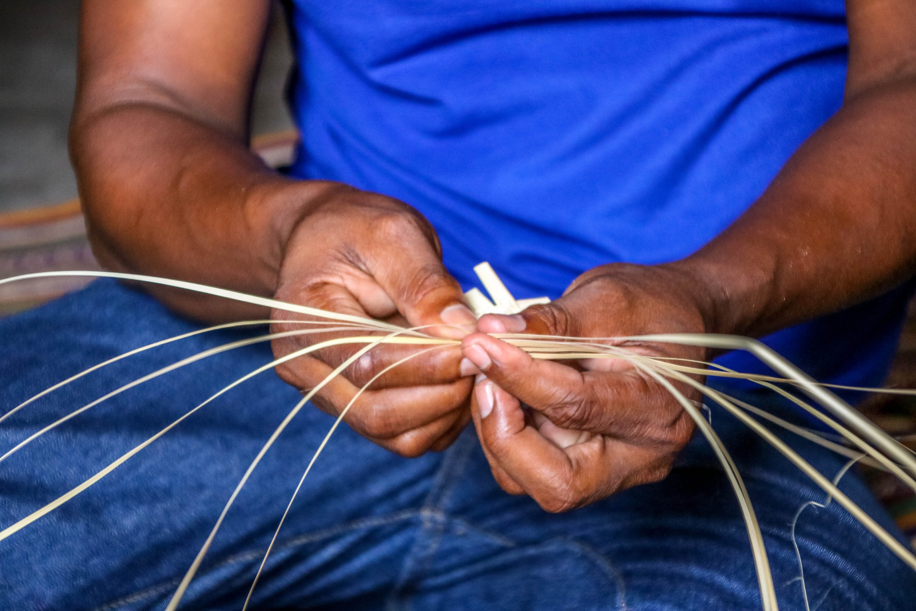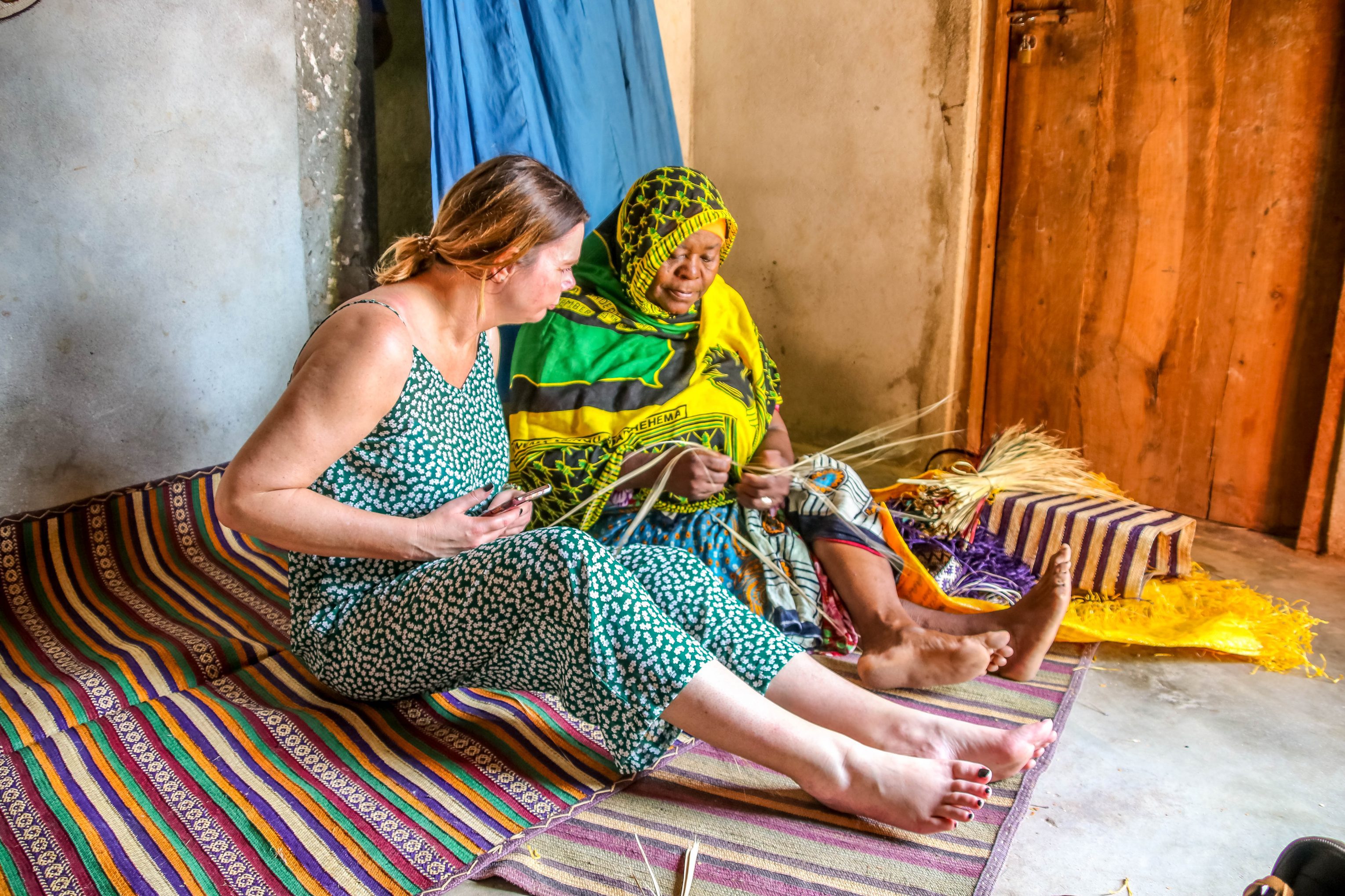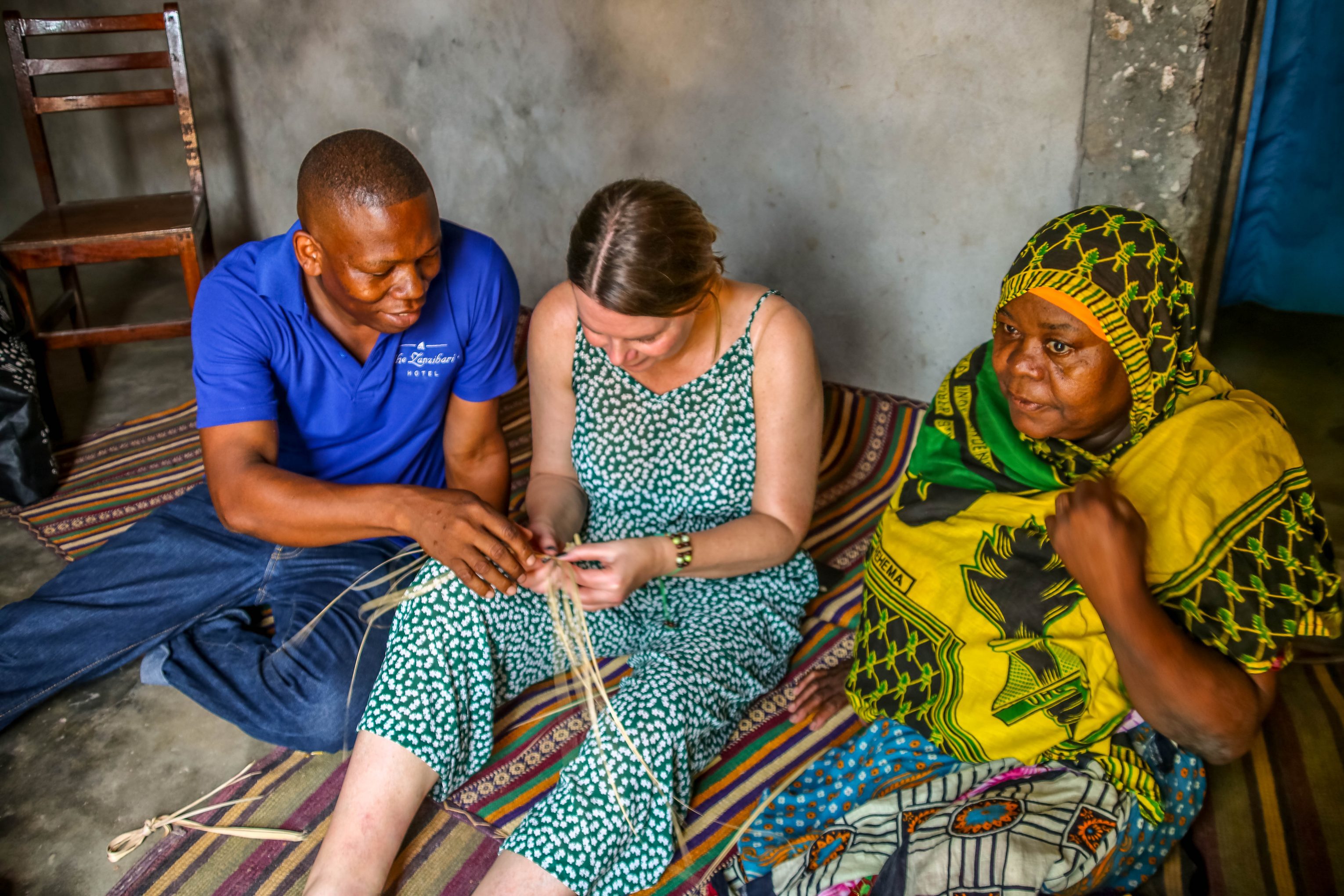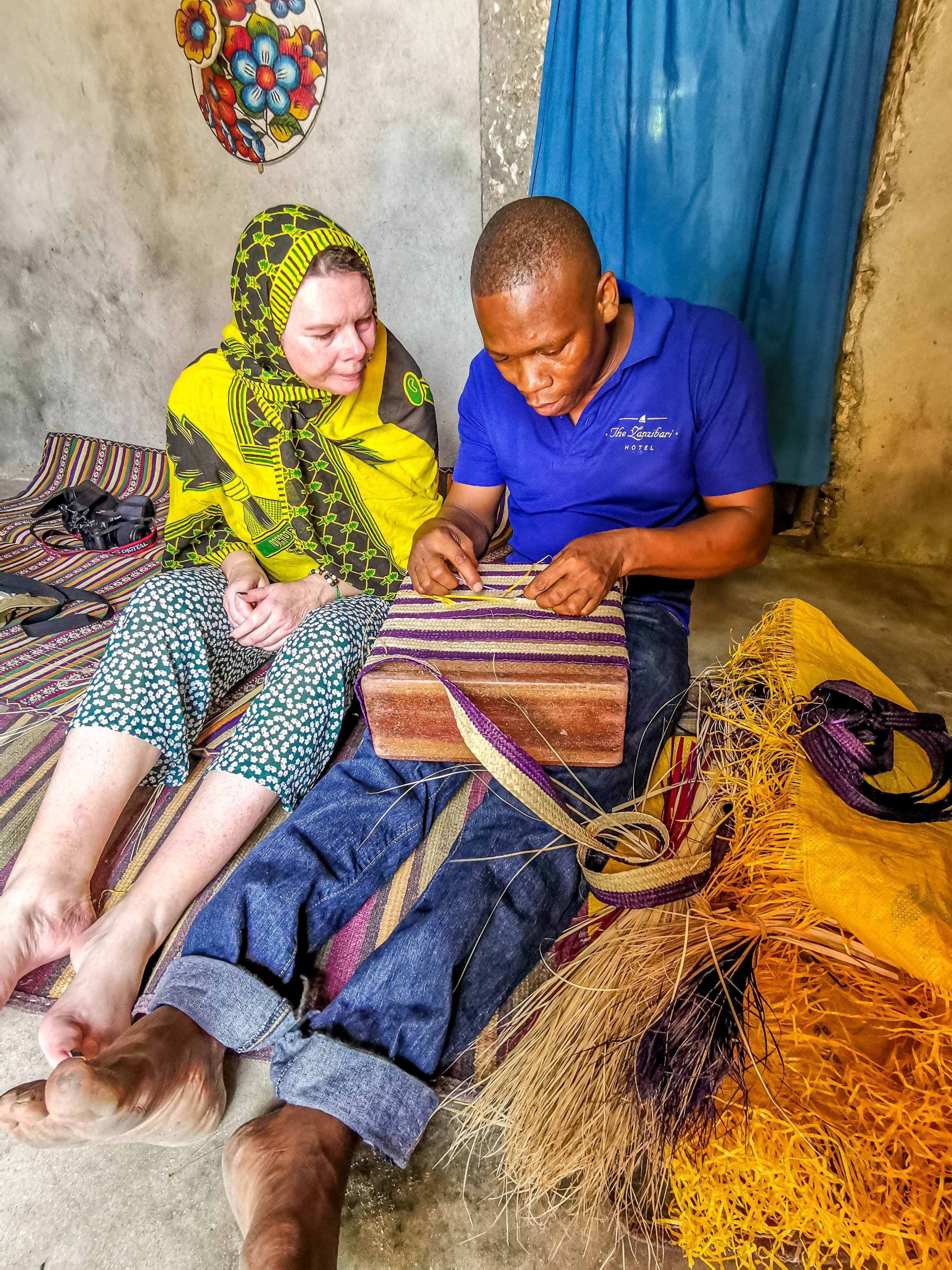 Bevor ich mein handwerkliches Geschick unter Beweis stellen musste, war Petra dran. Sie musste diverse Flechtmuster herstellen. Letztlich sollte sie auch noch eine große Handtasche zusammennähen. Das erwies sich als gar nicht so einfach. Auch das Zaubertuch änderte daran nur wenig… In unserem Hotel The Zanzibari findest Du übrigens viele dieser Handwerkserzeugnisse. Das Hotel legt nämlich großen Wert auf lokale Lieferanten.