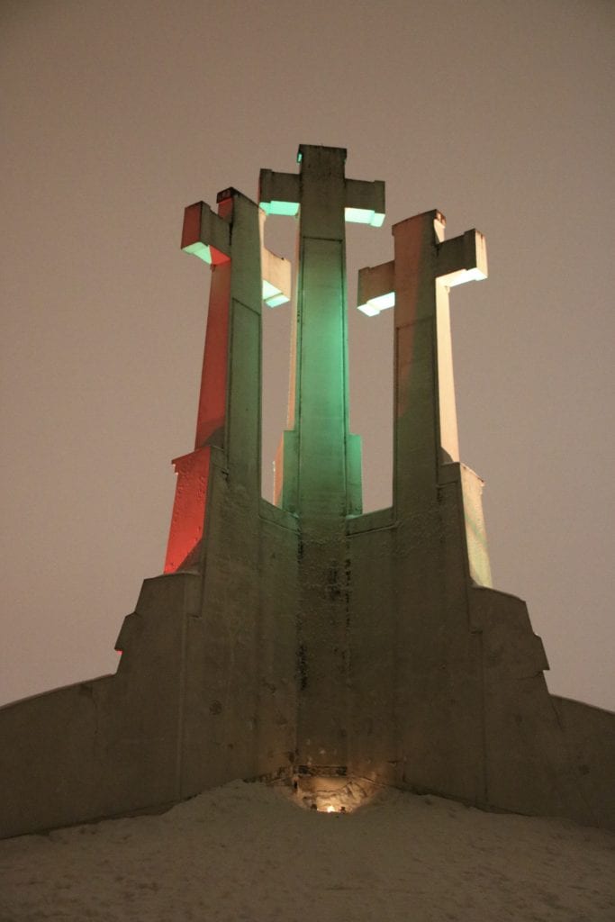 Kalt ist es, minus 8 Grad und über Nacht hat es geschneit. Im Februar ist in Litauen eben noch tiefster Winter. Wir stapfen durch den Schnee zu unserem Mietwagen und steuern das nächste Ziel, die „Drei Kreuze“, das Symbol von Vilnius, an. Die imposanten Betonkreuze stehen auf einem Hügel, von dort oben soll einem die Stadt zu Füßen liegen. Ein Platz für Romantiker, denn herrliche Sonnenuntergänge sind garantiert.